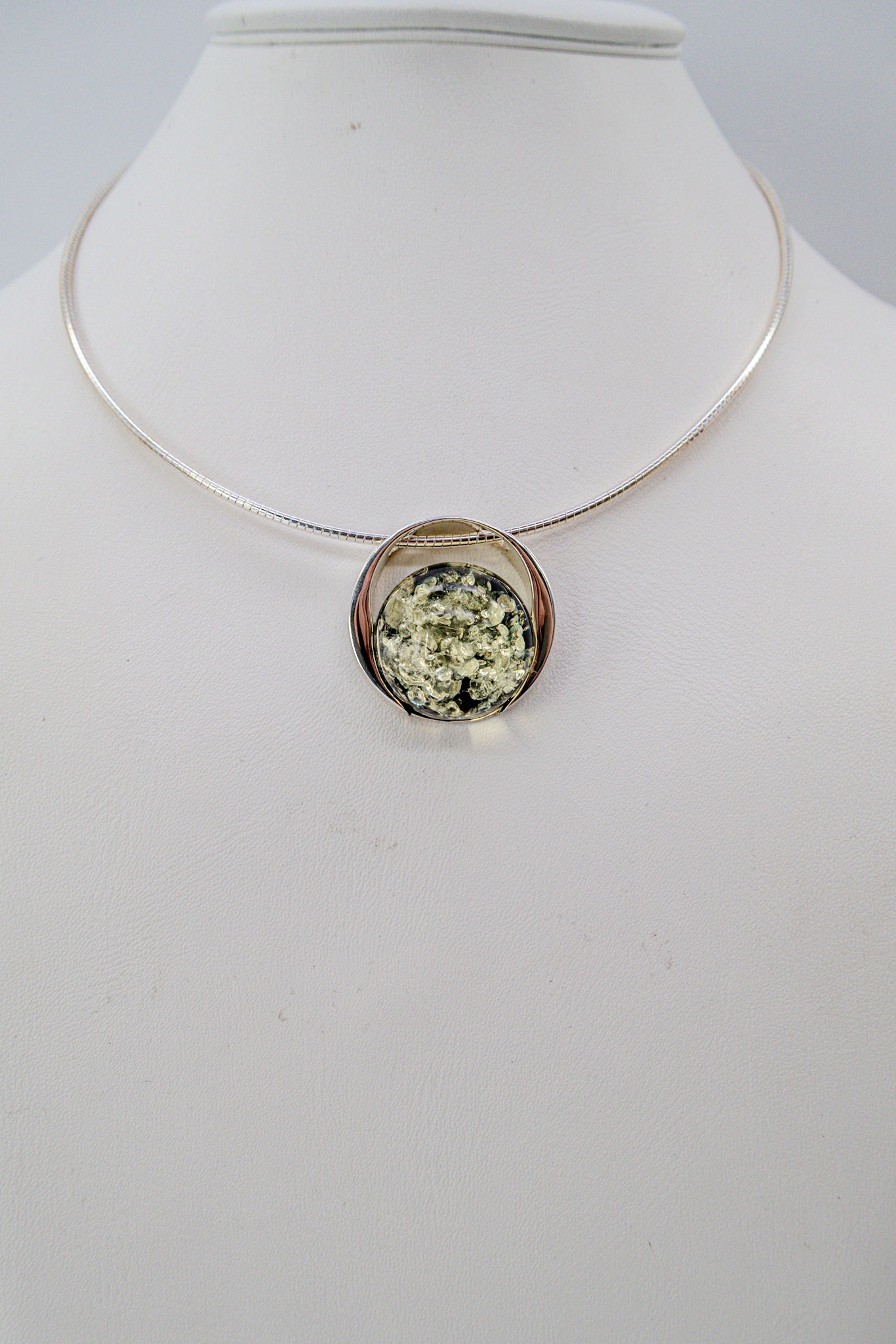 This elegant pendant crafted from 925 sterling silver features sparkling, bright amber, whose natural inclusions create a mesmerizing play of light. The modern, circular silver design harmoniously frames the stone, lending the piece a timeless elegance. Perfect for festive occasions, special moments, or as a stylish everyday accessory. An ideal gift for birthdays, anniversaries, or holidays for women who love unique pieces of jewelry.