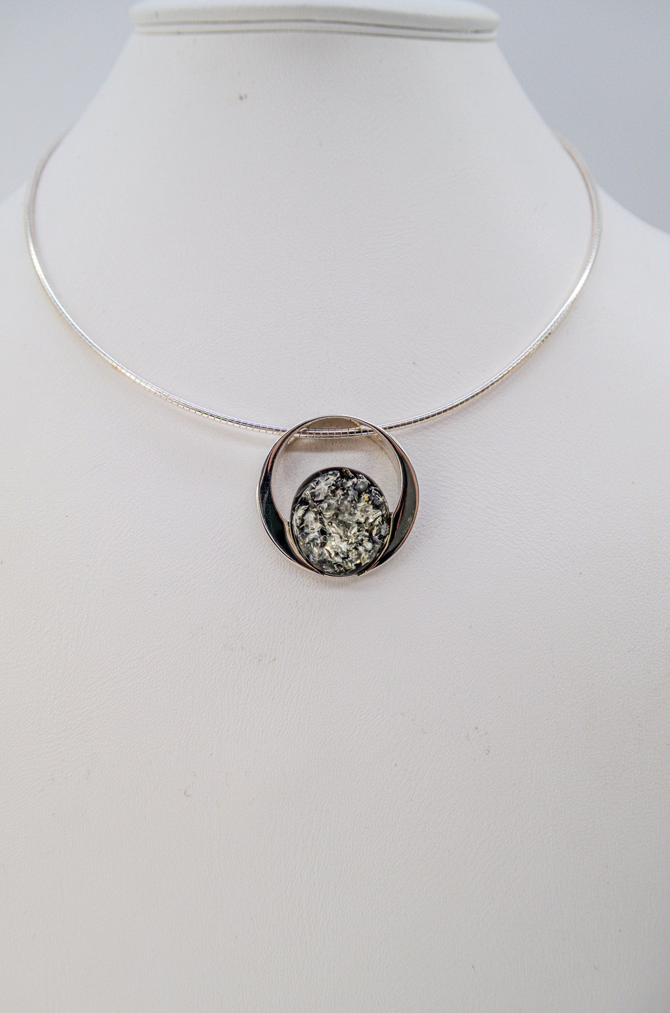 Shape: Round amber in a curved silver frame