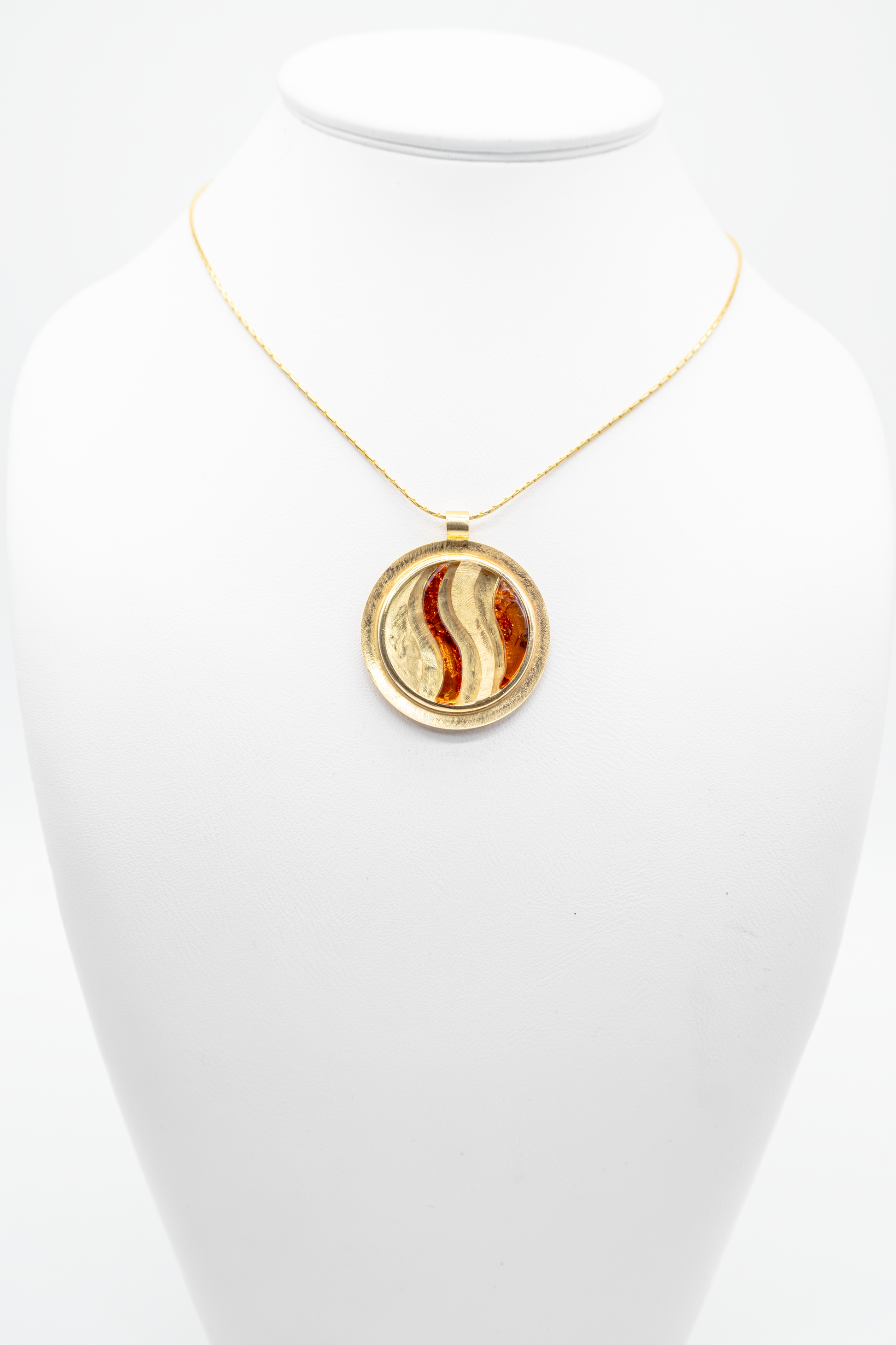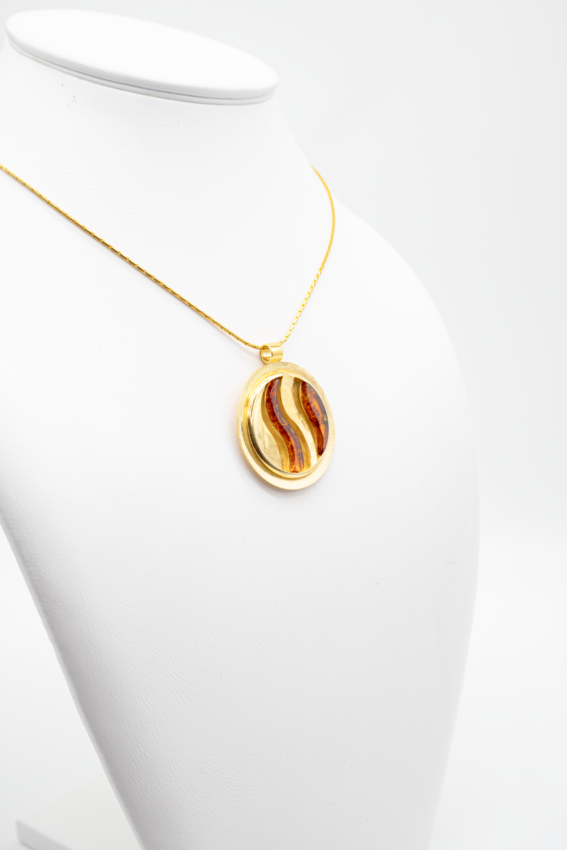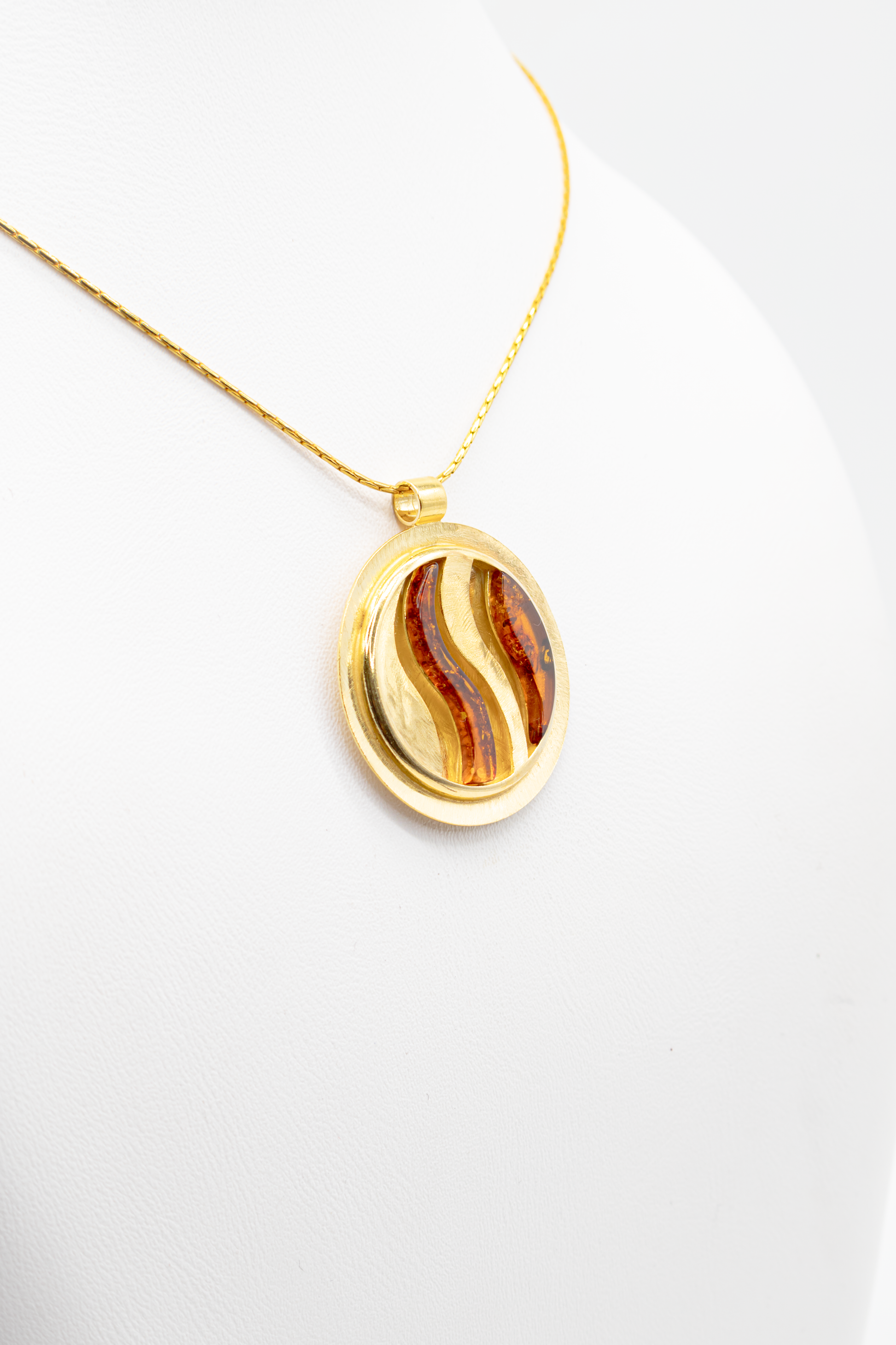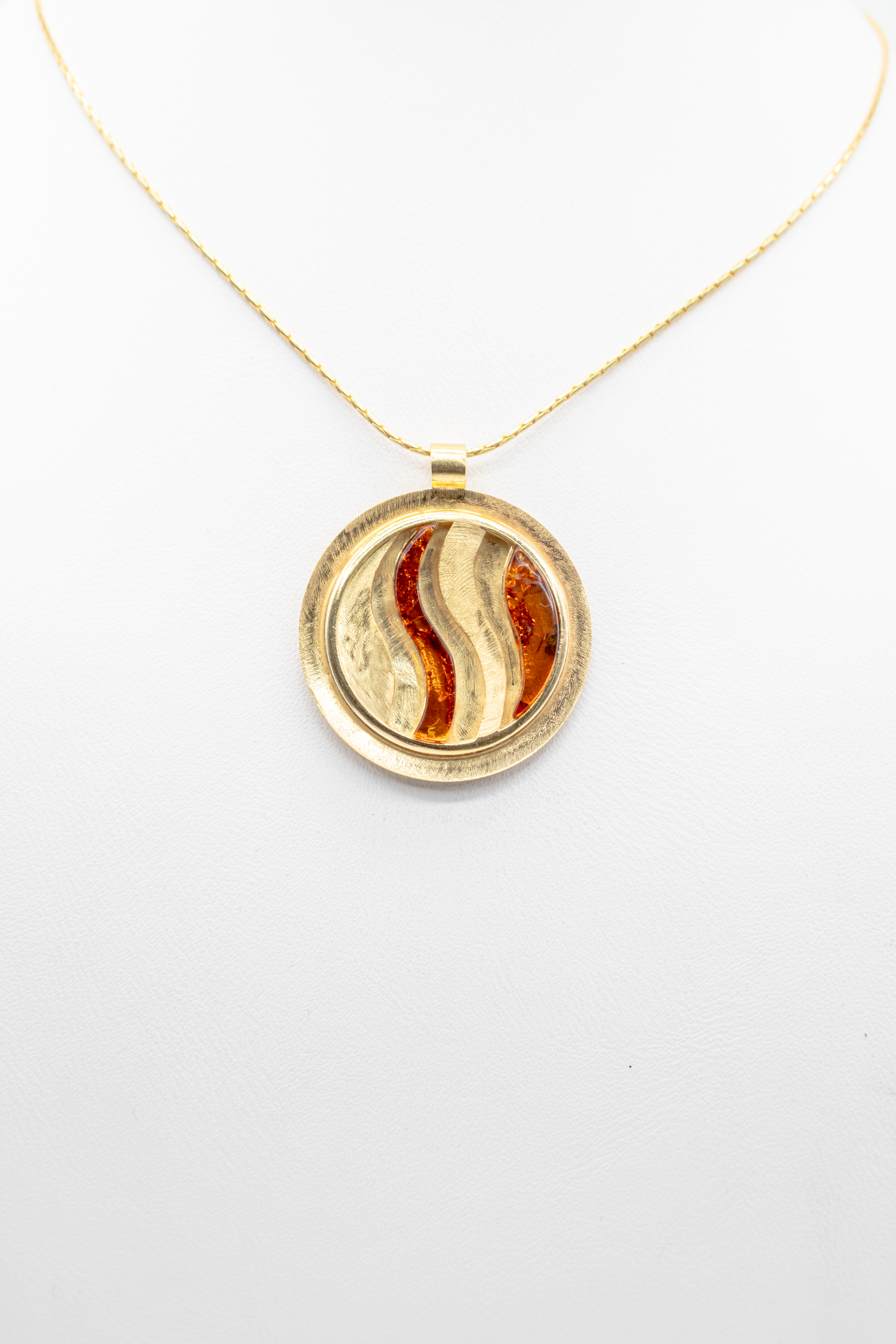 Dieser große, runde Anhänger aus 24K vergoldetem 925er Sterlingsilber beeindruckt durch seine elegante Struktur und die warmen Farbspiele des echten Bernsteins. Die kunstvoll geschwungenen Elemente verleihen dem Schmuckstück einen hochwertigen, luxuriösen Charakter, der sofort ins Auge fällt. Durch seine Größe setzt der Anhänger ein stilvolles Statement und eignet sich perfekt für den Alltag wie auch für besondere Anlässe. Ein edles, zeitloses Schmuckstück und eine wunderbare Geschenkidee für Menschen mit Sinn für Eleganz und Qualität.