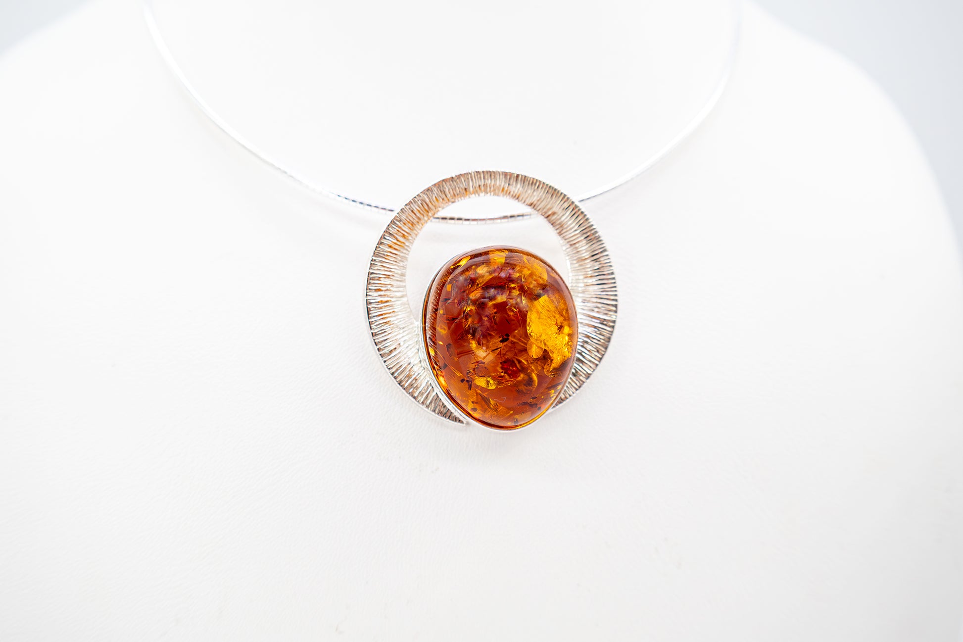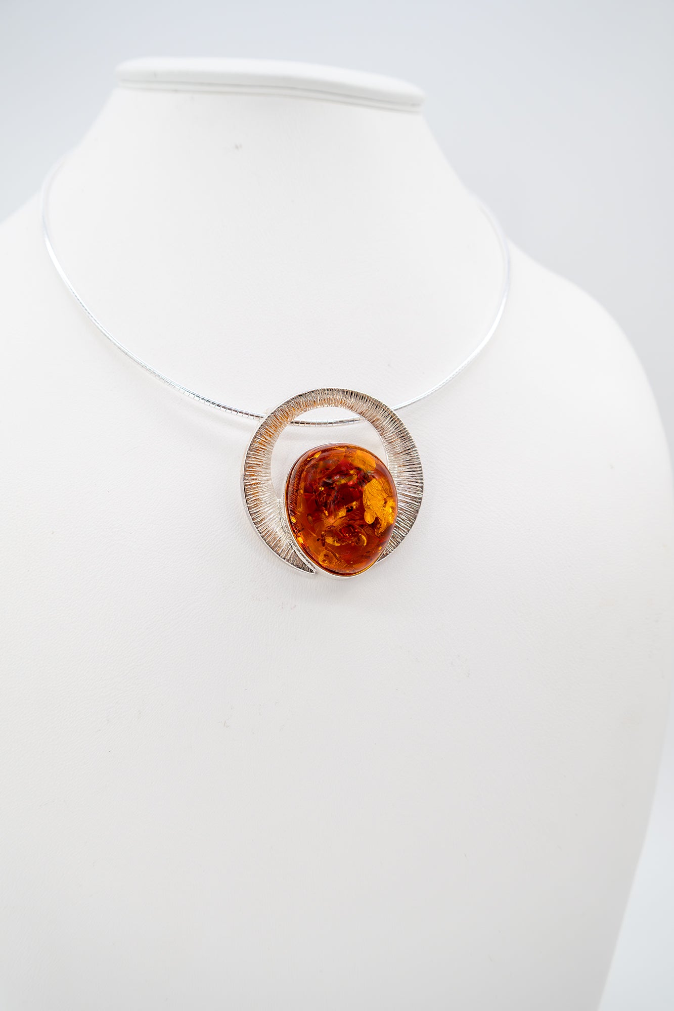 Handcrafted amber pendant with a textured silver setting – an elegant, unique piece with a ready-to-wear chain.