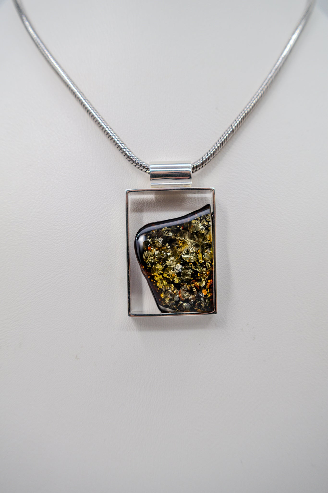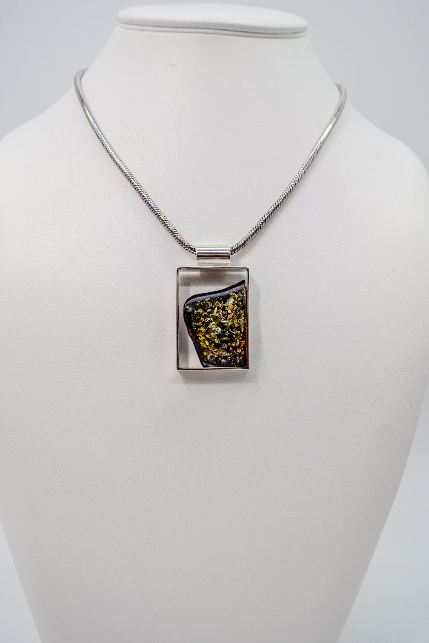 A handcrafted, unique piece with shimmering green amber that immediately catches the eye with its modern design and fascinating natural inclusions.