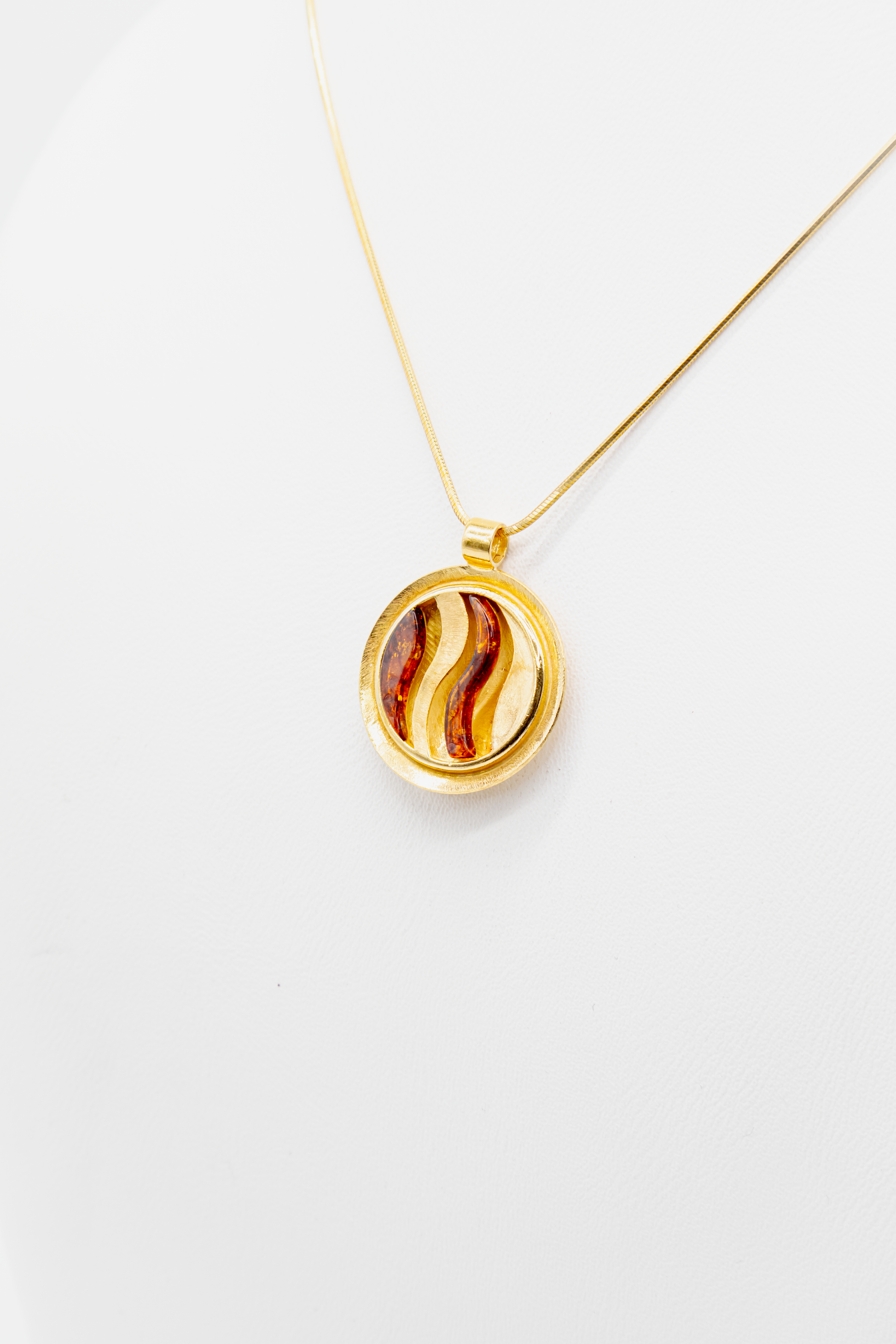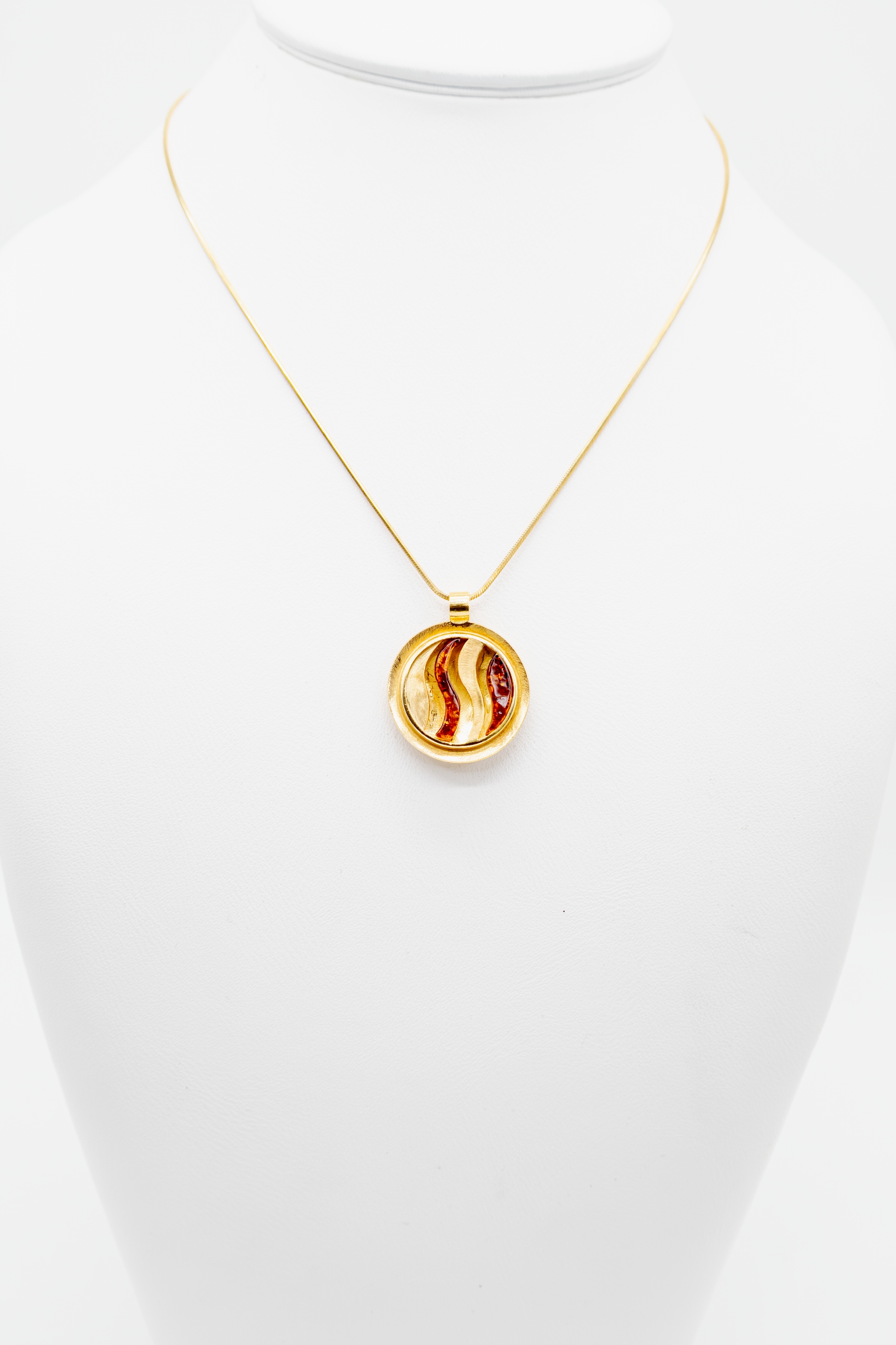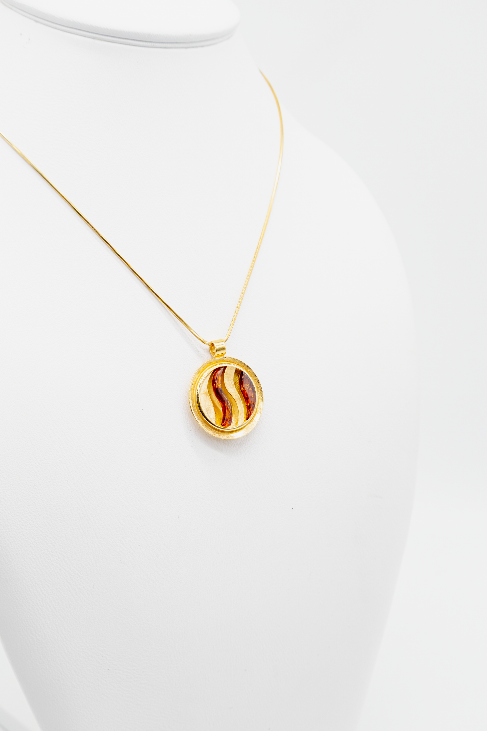 Dieser runde Anhänger verbindet luxuriöse 24K-Vergoldung mit warm schimmerndem Bernstein zu einem Schmuckstück, das sofort Eleganz ausstrahlt. Die harmonische Kombination aus Goldfarbe und bernsteinfarbenen Akzenten wirkt hochwertig, modern und dennoch zeitlos – ein Design, das jedes Outfit veredelt und besonders im Licht eindrucksvoll glänzt.