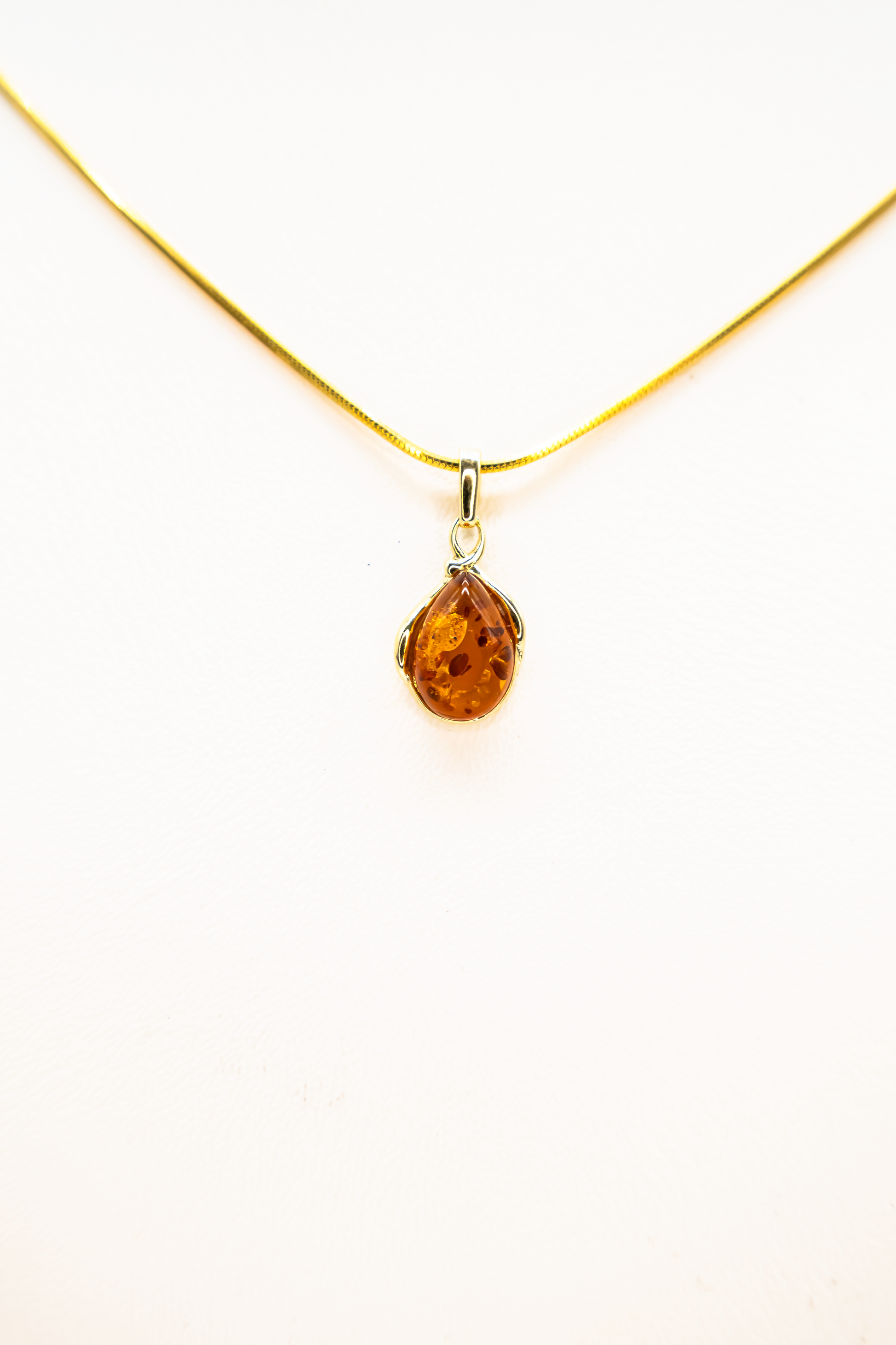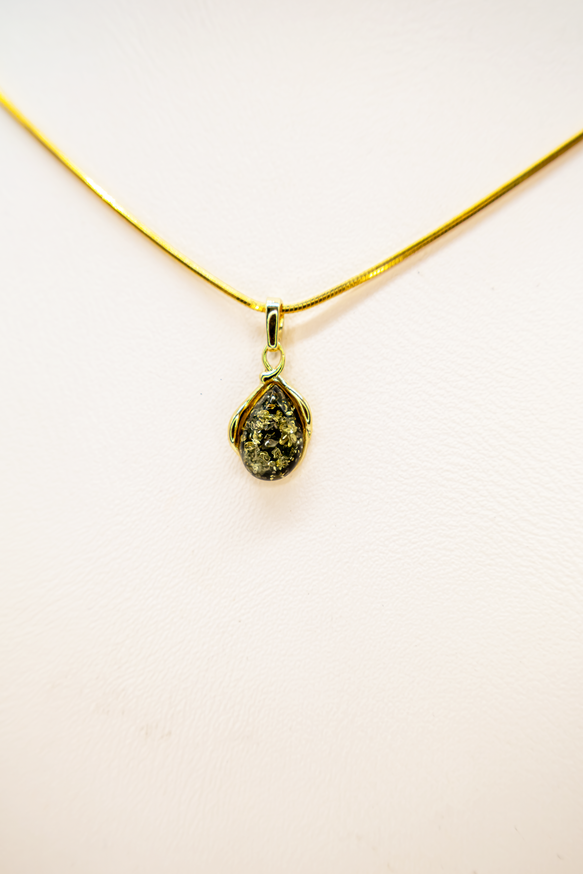 This handcrafted amber pendant with a gold-plated chain captivates with its elegant drop design. The greenish shimmering genuine amber, combined with the delicate gold-plated 925 sterling silver setting, reveals its natural beauty and creates a truly exquisite effect. Measuring approximately 2 × 1 cm, the pendant is understated yet striking—a perfect piece of jewelry for everyday wear and special occasions.