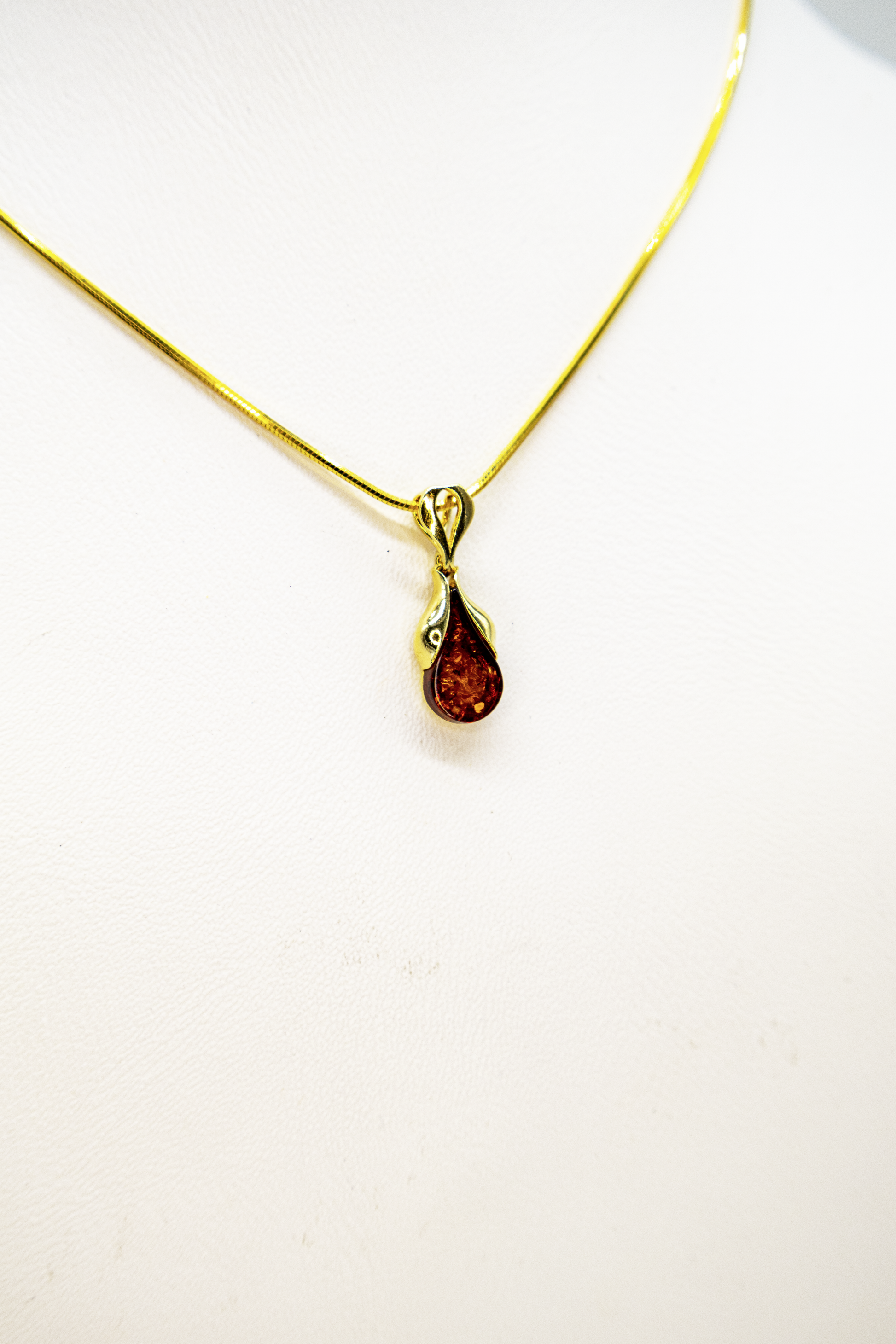 Drop-shaped amber pendant in cognac color with artfully gold-plated setting – elegant and versatile