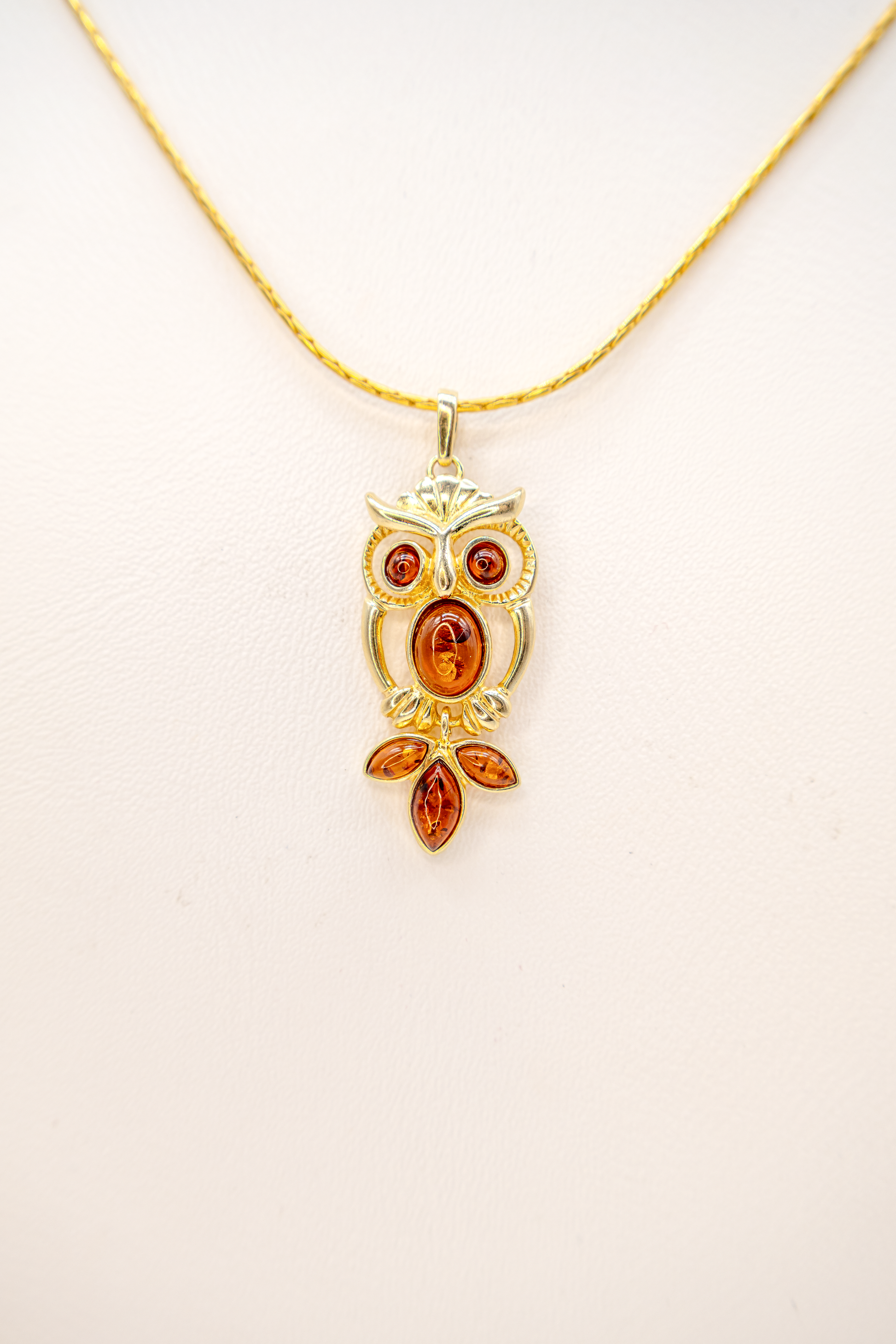 This enchanting owl pendant combines symbolism and elegance. Crafted from gold-plated 925 sterling silver and adorned with sparkling amber, the owl symbolizes wisdom, protection, and inner strength. Measuring 3.8 x 1.5 cm, the pendant is an impressive piece of jewelry that can be worn for any occasion. Whether as an elegant accessory for women or as a special gift for your loved ones, this amber pendant will attract everyone's attention.
