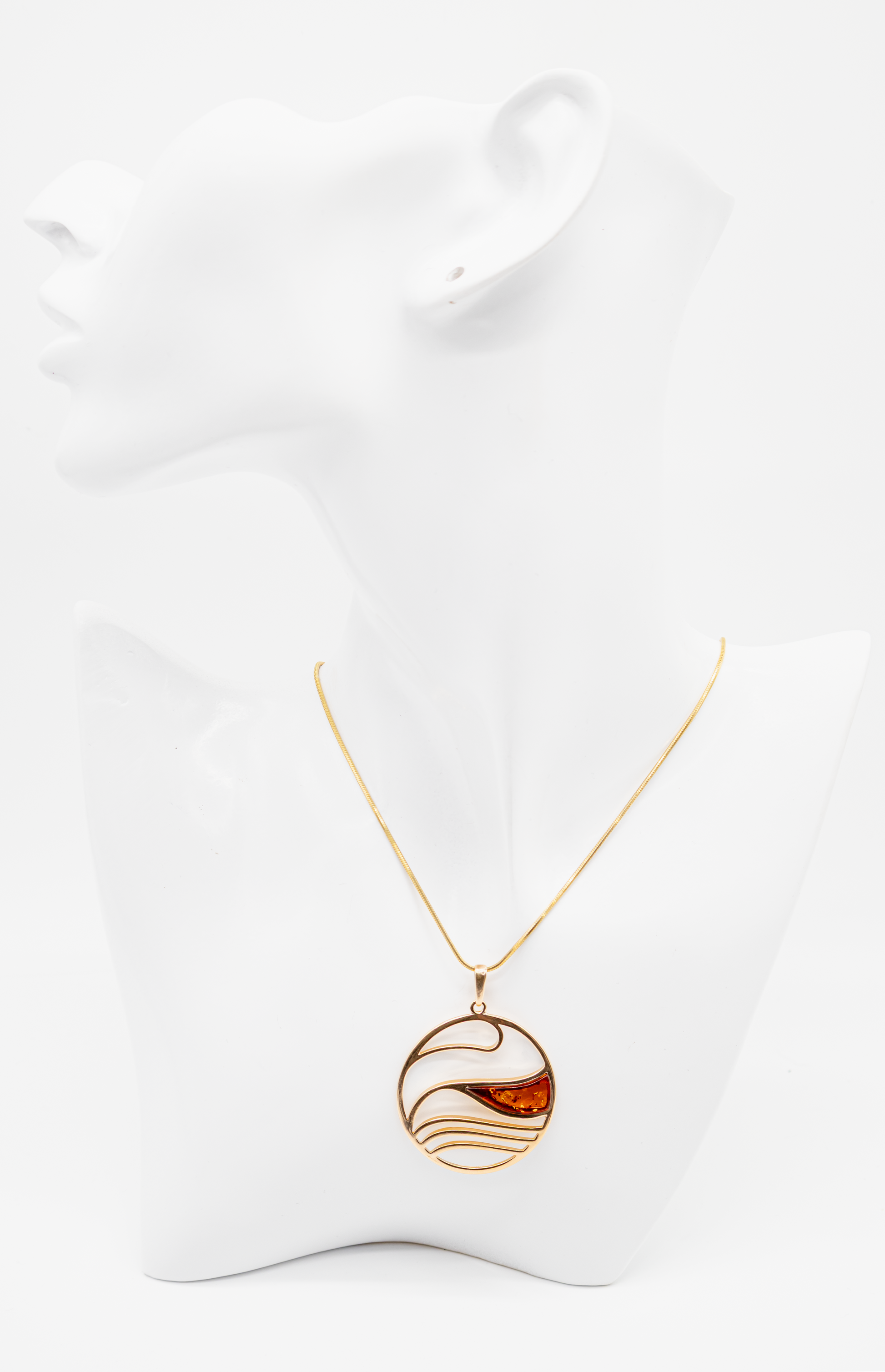 Basis: 925 Sterling Silber. Veredelung: 24 Karat Vergoldung (2-fach / Double Layer) – langlebig und abriebfest. Stein: Echter Baltischer Bernstein (in die Welle integriert).