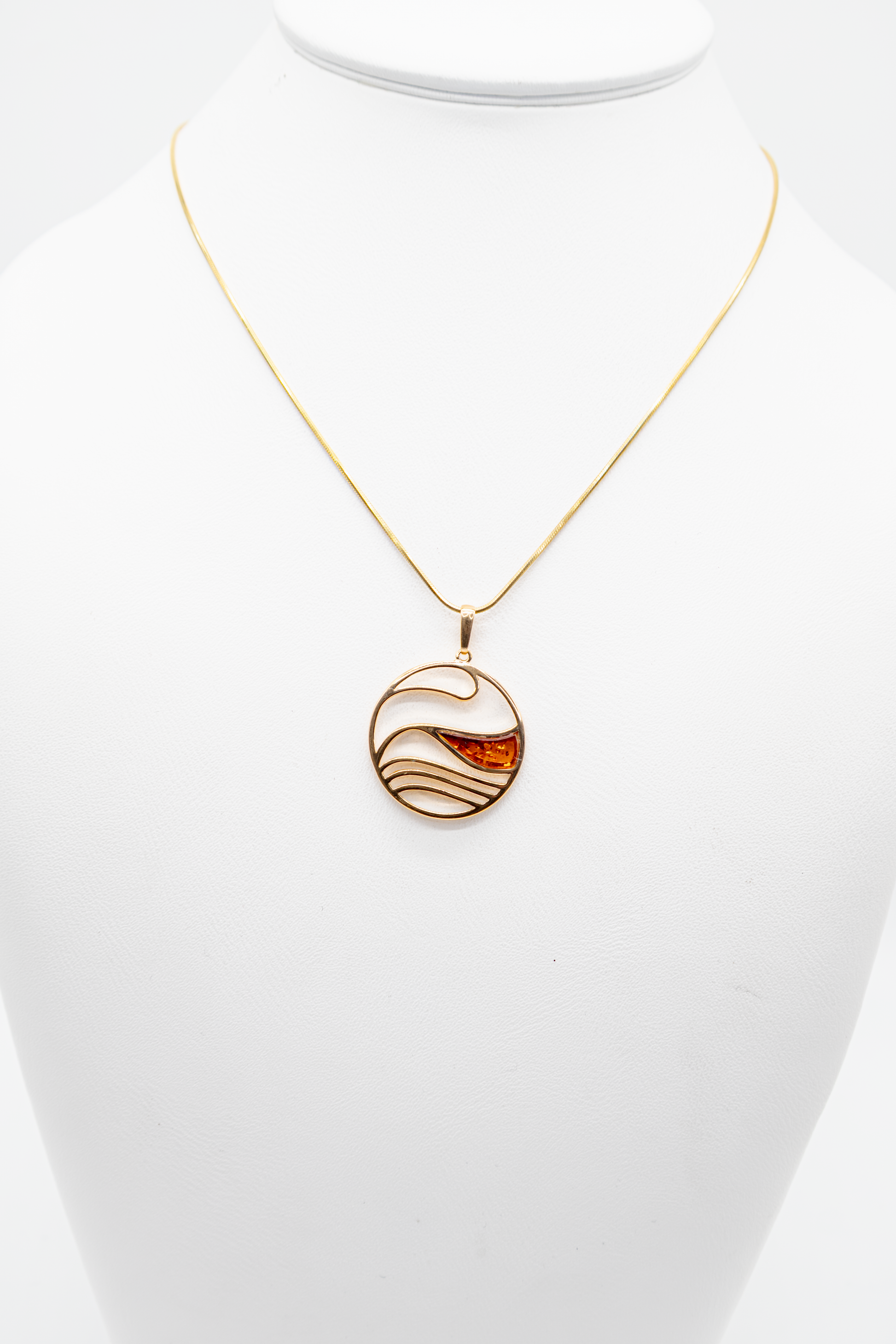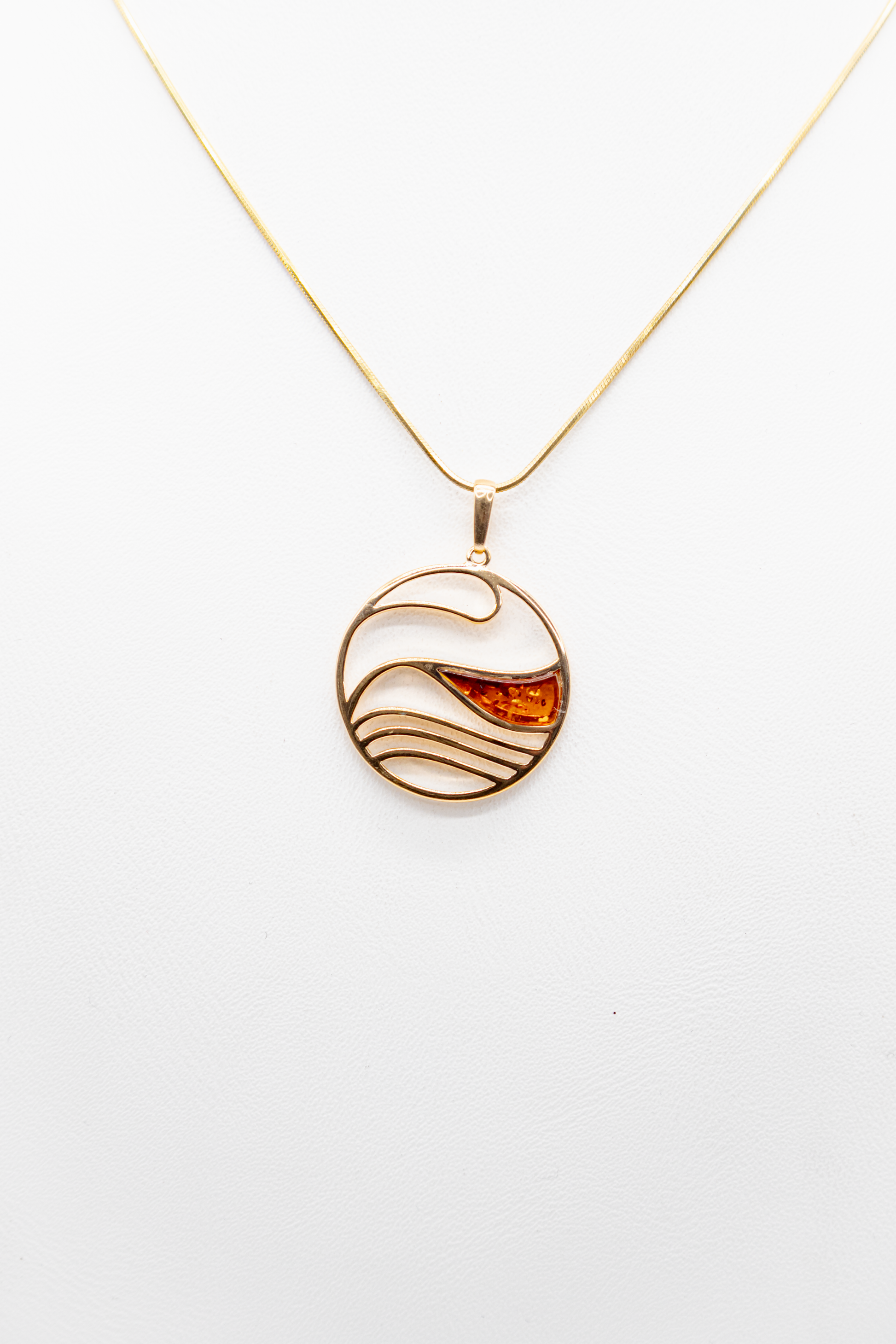 Dieser kunstvolle Anhänger im Wellen-Design fängt die Schönheit und Dynamik des Ozeans ein. Elegante, geschwungene Goldlinien symbolisieren die sanfte Bewegung des Wassers, während ein warmer Bernstein wie ein von der Sonne geküsster Tropfen in der Welle ruht.