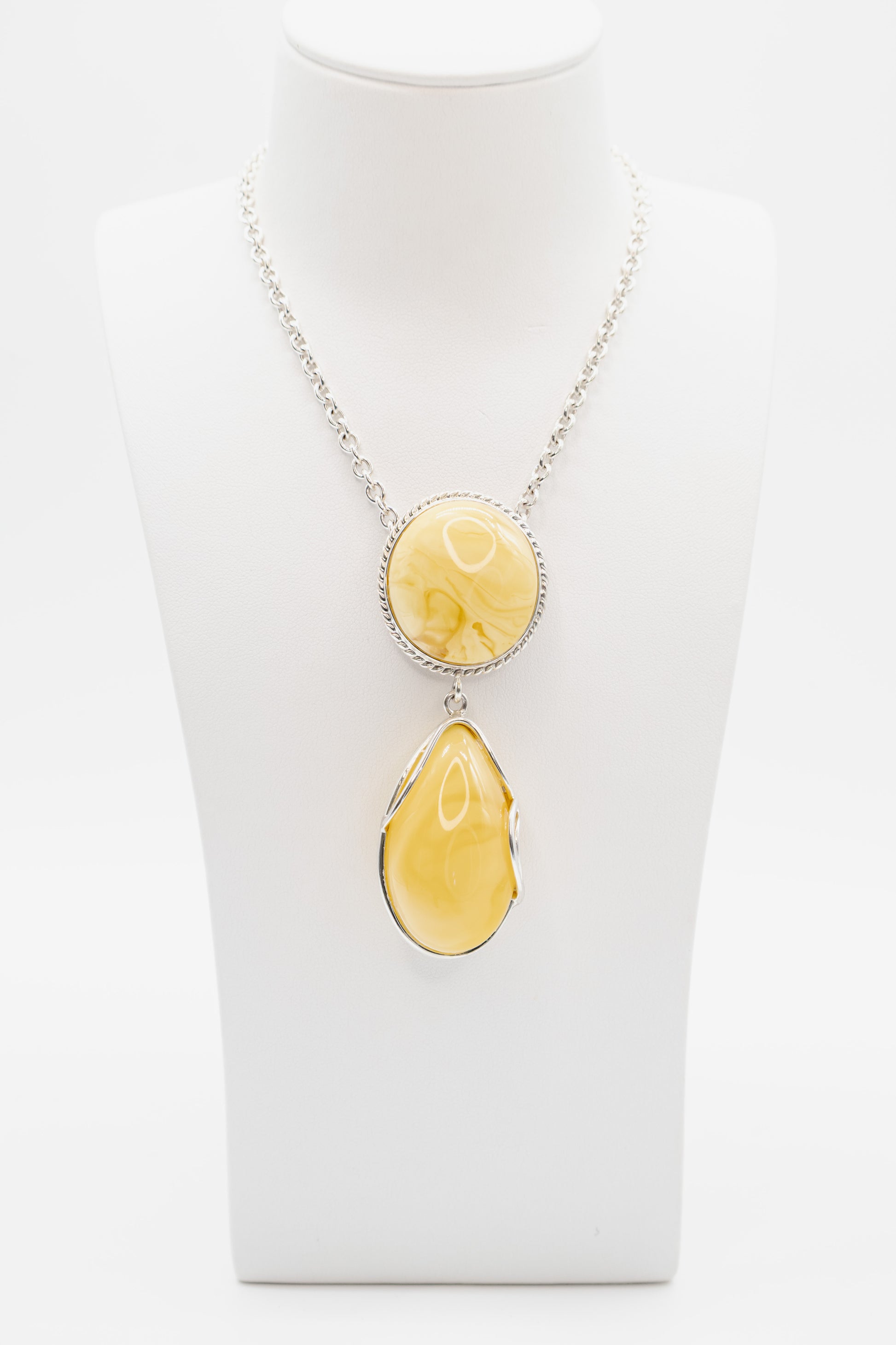 This exceptional, one-of-a-kind pendant made of yellow amber captivates with its elegant length and the gently flowing, natural structure of the stone. The amber displays warm honey and vanilla tones, interwoven with fine streaks that shimmer vividly with every movement.