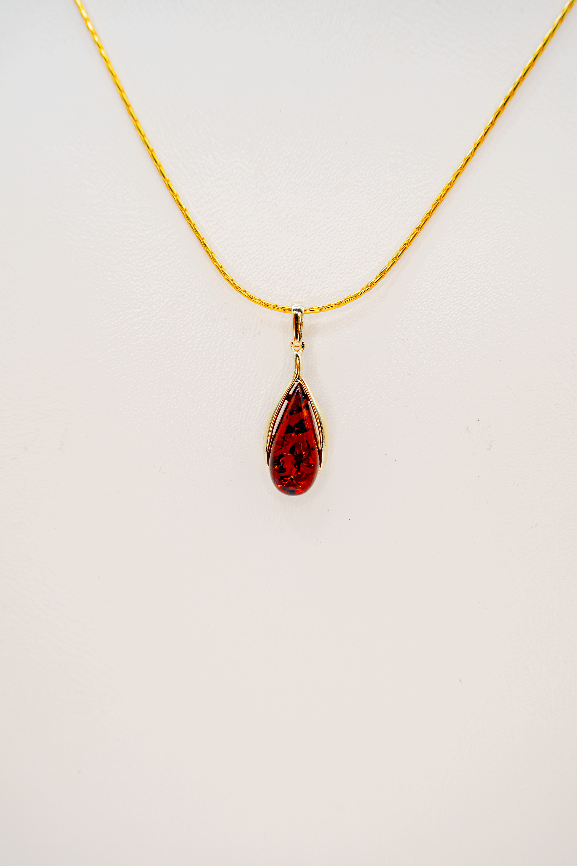 This gold-plated drop pendant captivates with its elegant shape and the intense red color of genuine amber. Crafted from gold-plated 925 sterling silver, the piece measures 2.2 x 1 cm and combines timeless elegance with natural beauty. Amber has been considered a symbol of warmth, energy, and protection for centuries, while its drop shape embodies purity and vitality. Perfect as a gift for your wife, sister, or girlfriend, this pendant is a refined companion for everyday wear as well as for special occasions.