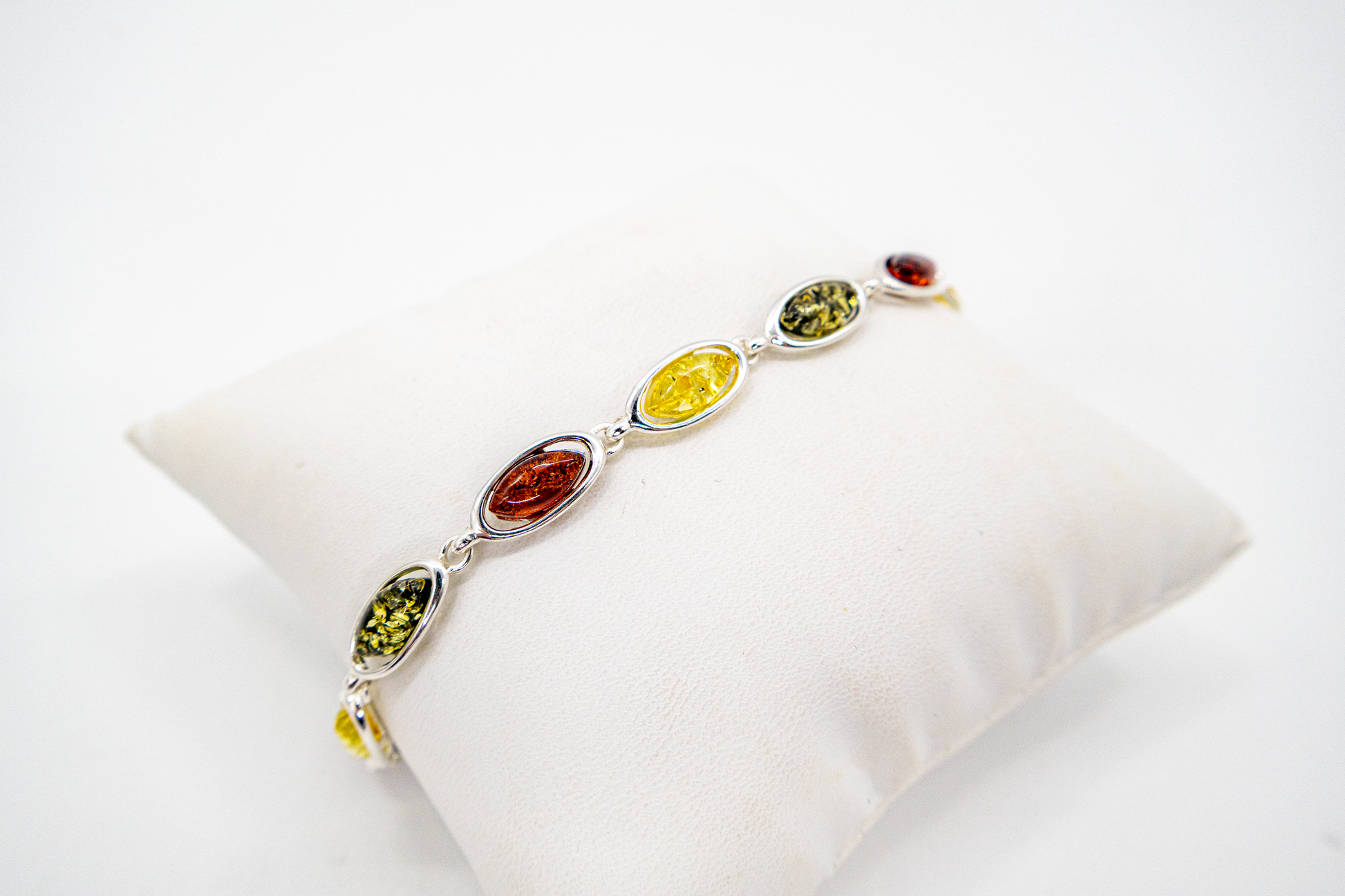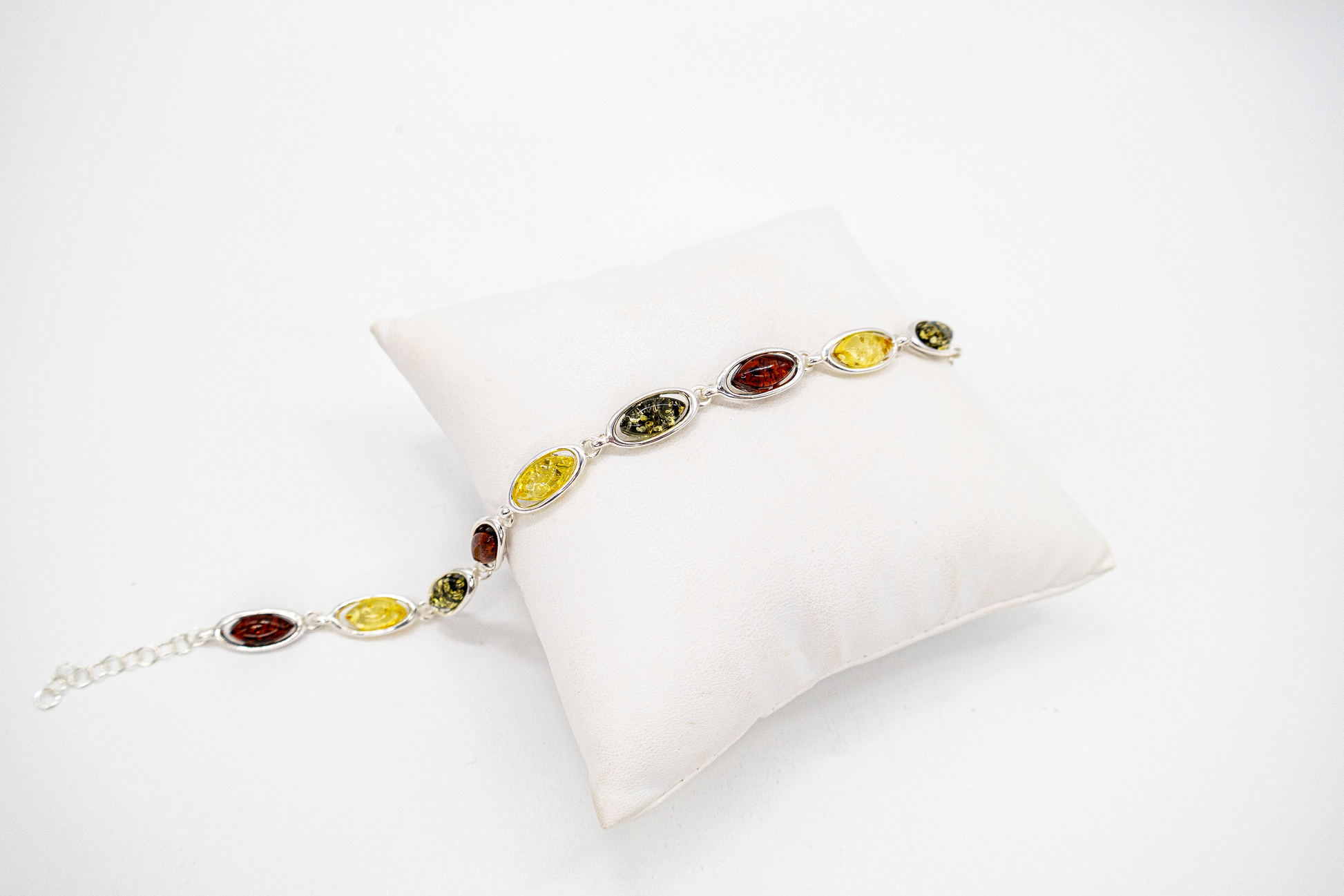 This stylish amber bracelet combines classic elegance with the warm color palette of genuine natural amber. Set in high-quality 925 silver , oval stones in yellow, green, and cognac are harmoniously arranged, illuminating the bracelet. With a length of approximately 17 cm plus a 4 cm extension, it offers optimal comfort for every wrist. The lobster clasp ensures a secure fit. A handcrafted piece of jewelry that makes an ideal gift for special people—whether for a birthday, anniversary, or just because. Width 0.6 cm