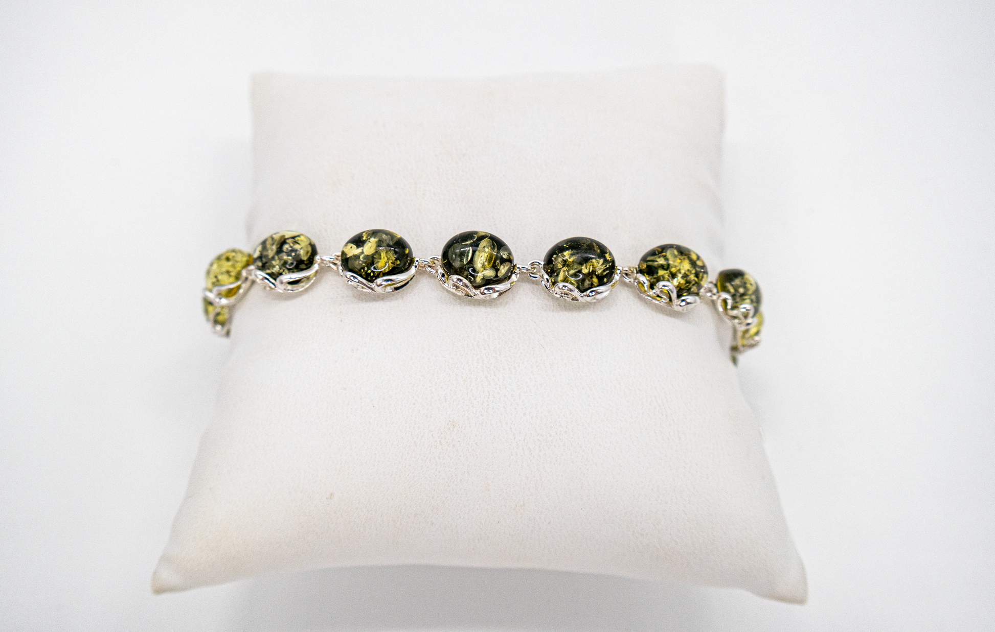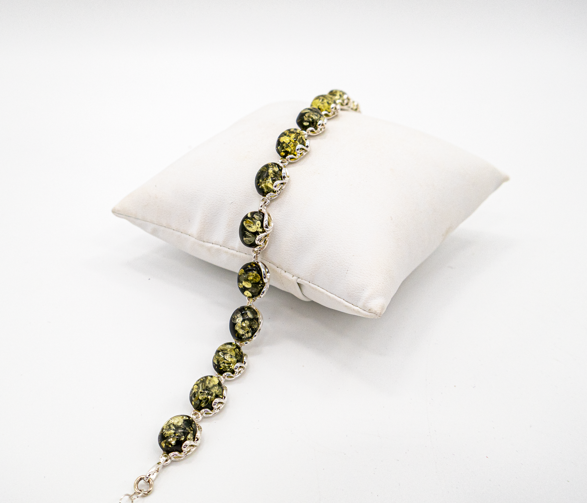 This stylish bracelet combines genuine green amber with precious 925 silver. The round stones radiate a deep green hue with a fascinating inclusion pattern. The design is elegantly curved and of high quality – a special piece of jewelry for everyday wear and special occasions. With a length of 17 cm plus a 3 cm extension, the bracelet can be individually adjusted. Two color options make it the perfect choice for style-conscious women. Ideal as a gift for special people or for self-pampering.