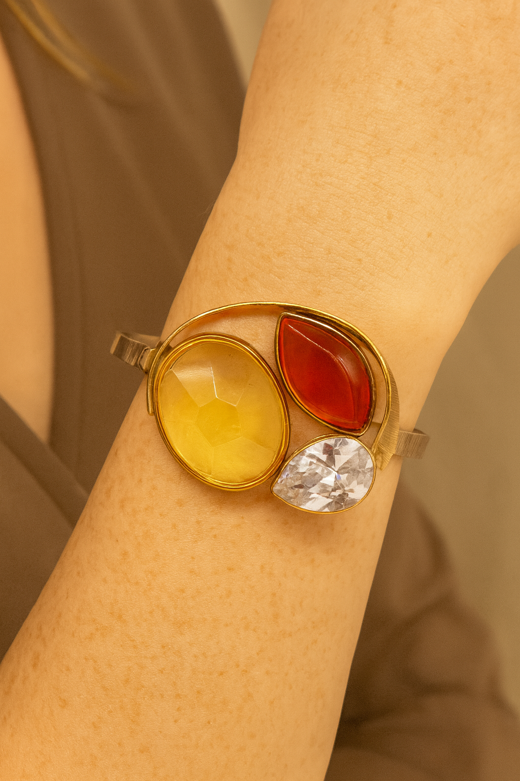 Warum dieser Armreif ein Meisterwerk ist: Das Design ist mutig und kunstvoll: Ein großer, sonnengelber Bernstein harmoniert perfekt mit einem tiefroten, kirschfarbenen Bernstein. Ergänzt wird dieses Duo durch einen strahlenden Zirkonia-Kristall im Brillantschliff, der dem Schmuckstück eine luxuriöse Frische verleiht.