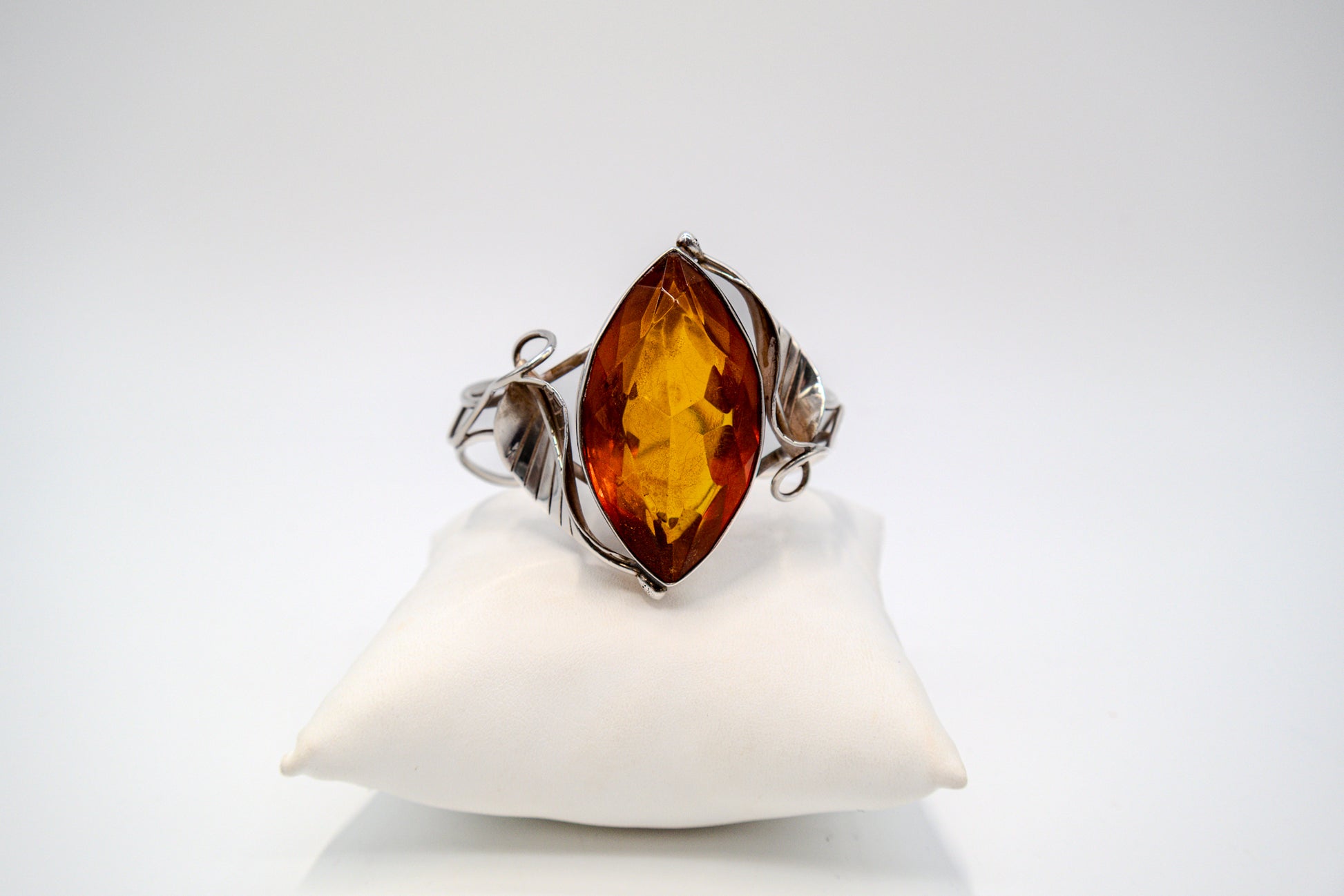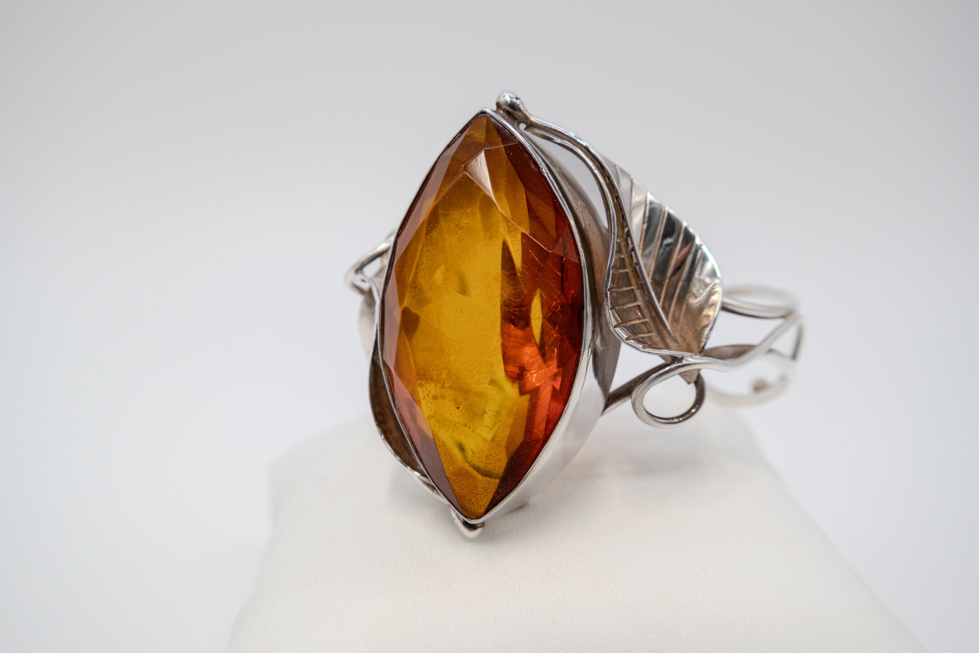 Open bangle with large faceted amber, handmade unique piece that enhances any look.