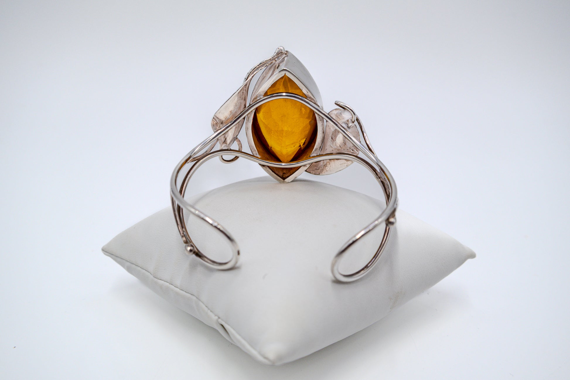This handmade 925 silver bracelet with a large, faceted amber stone is a true eye-catcher. The open bangle is approximately 17 cm long and 5 cm wide and is comfortable to wear. The amber-colored stone radiates in warm orange and gold tones, giving the piece a unique character. An ideal gift for birthdays, anniversaries, or special occasions—perfect for women who love elegant and individual jewelry.