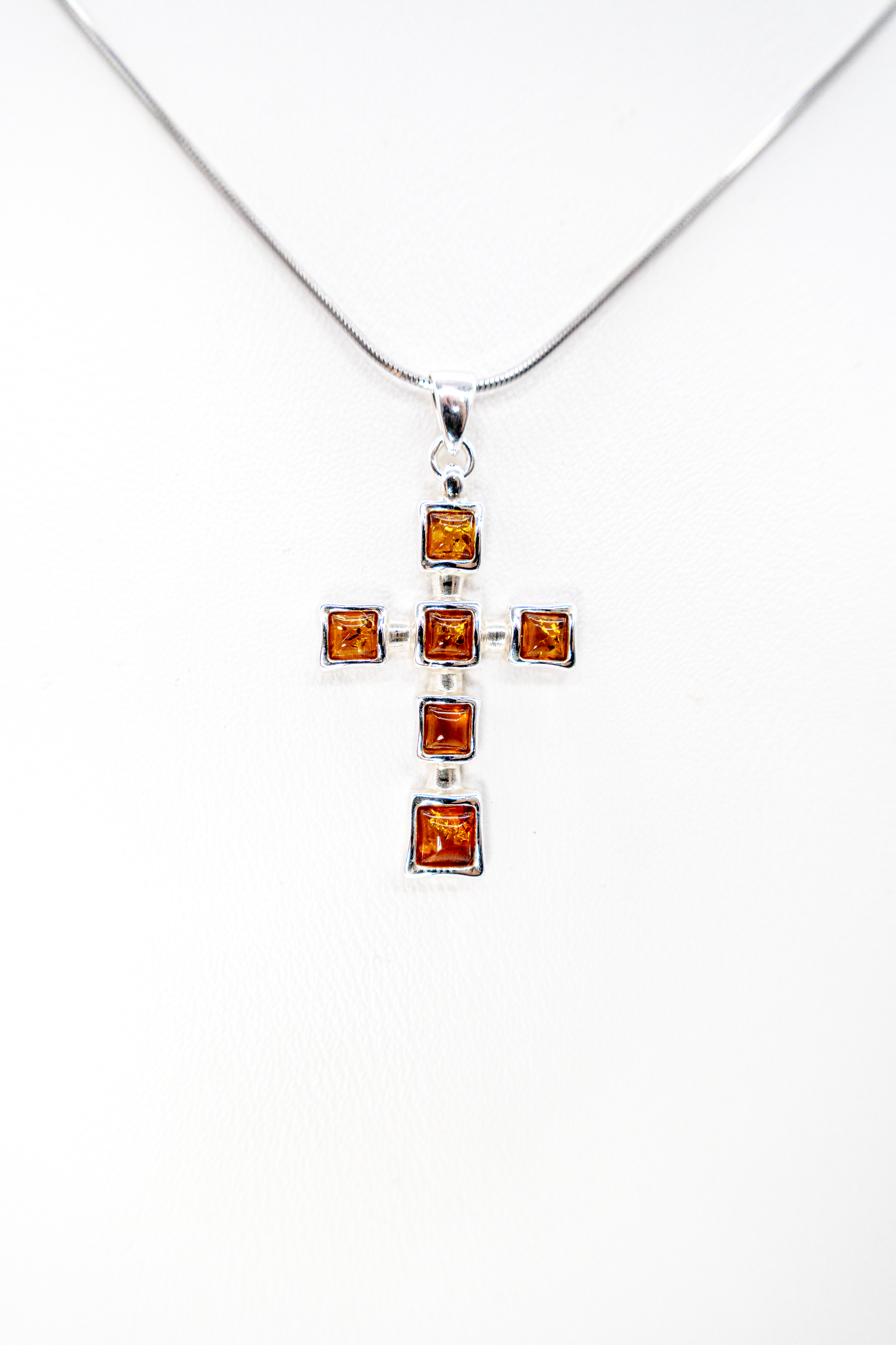 Expressive cross pendant – symbolic & noble, with a unique piece of amber in the center.