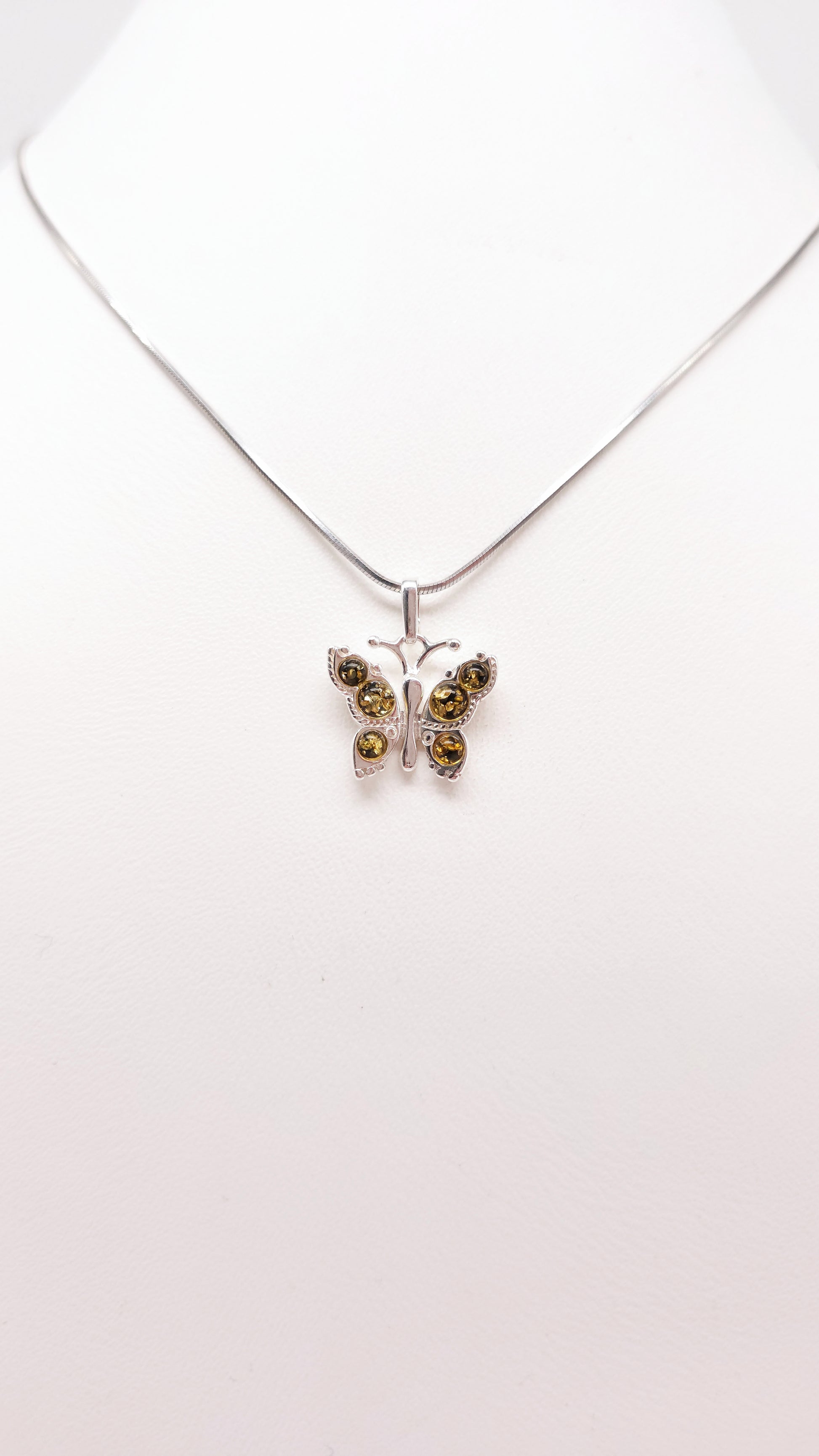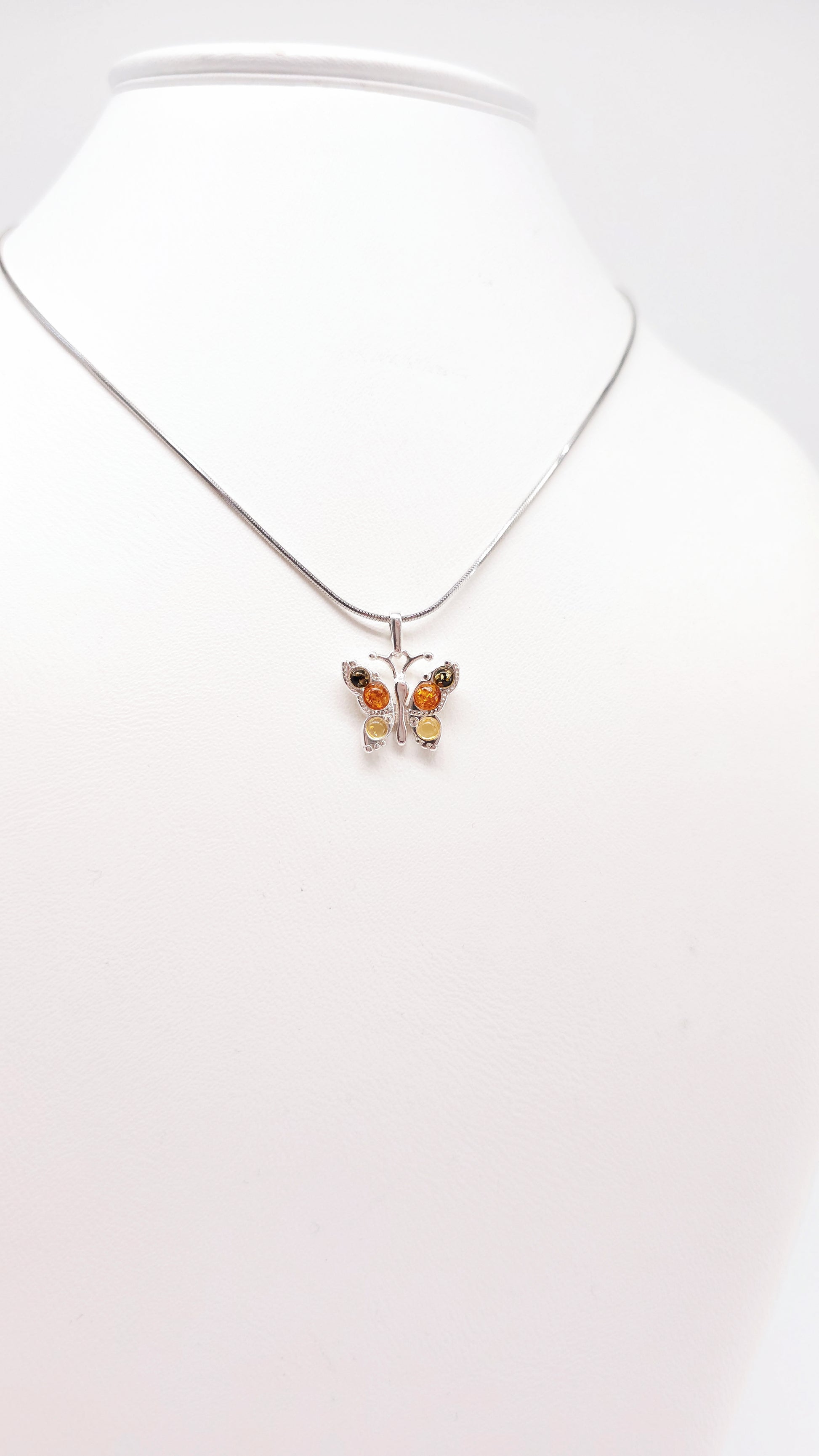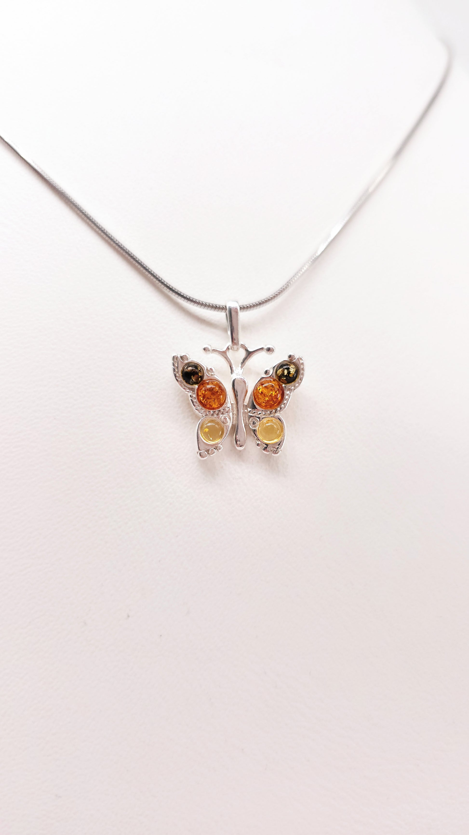 This delicate butterfly pendant, crafted from genuine amber in three shades and fine 925 silver, brings lightness, color, and joy to any jewelry box. The combination of honey, lemon, and greenish amber gives the pendant a vibrant look and highlights the loving details of the design.