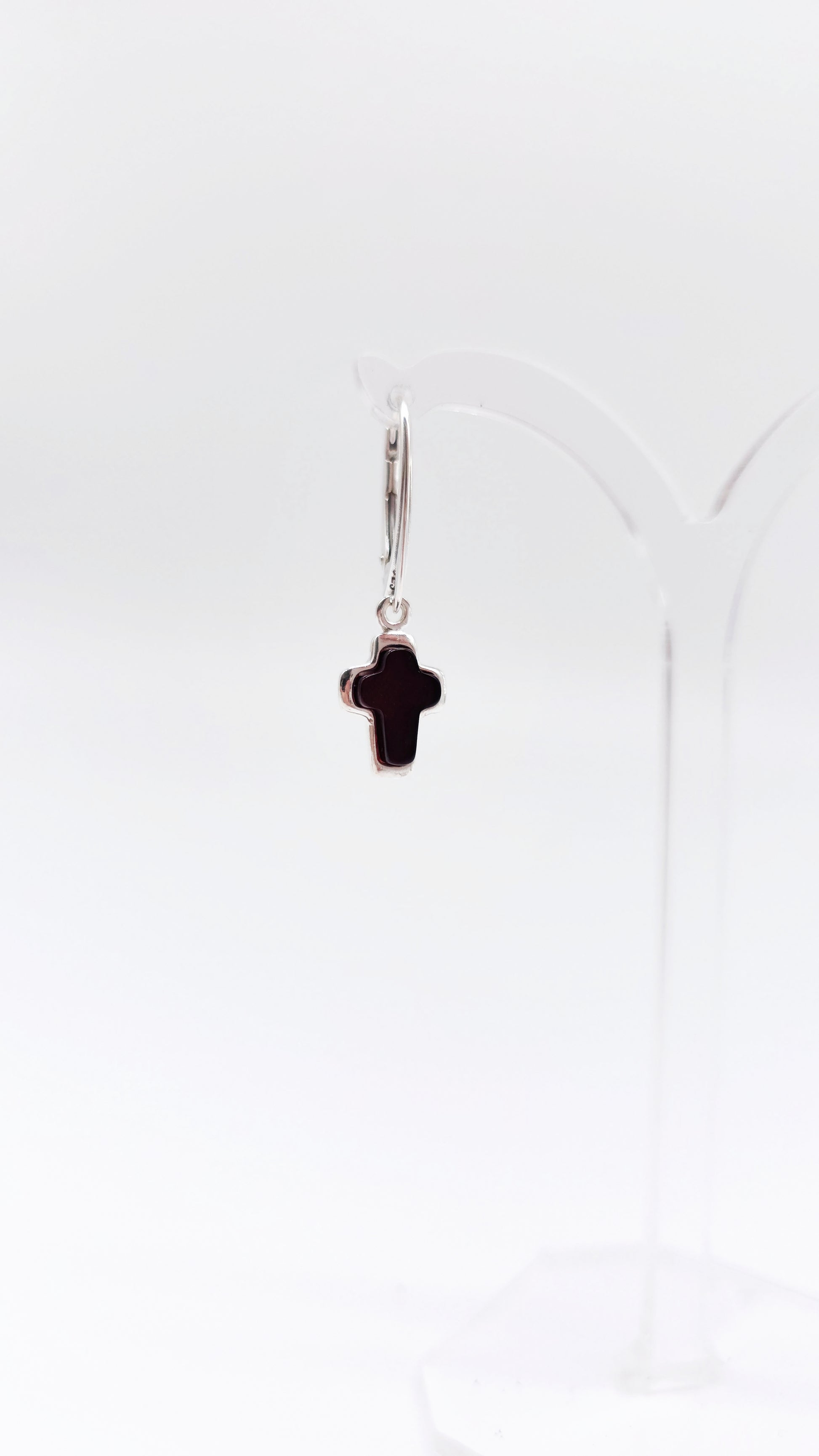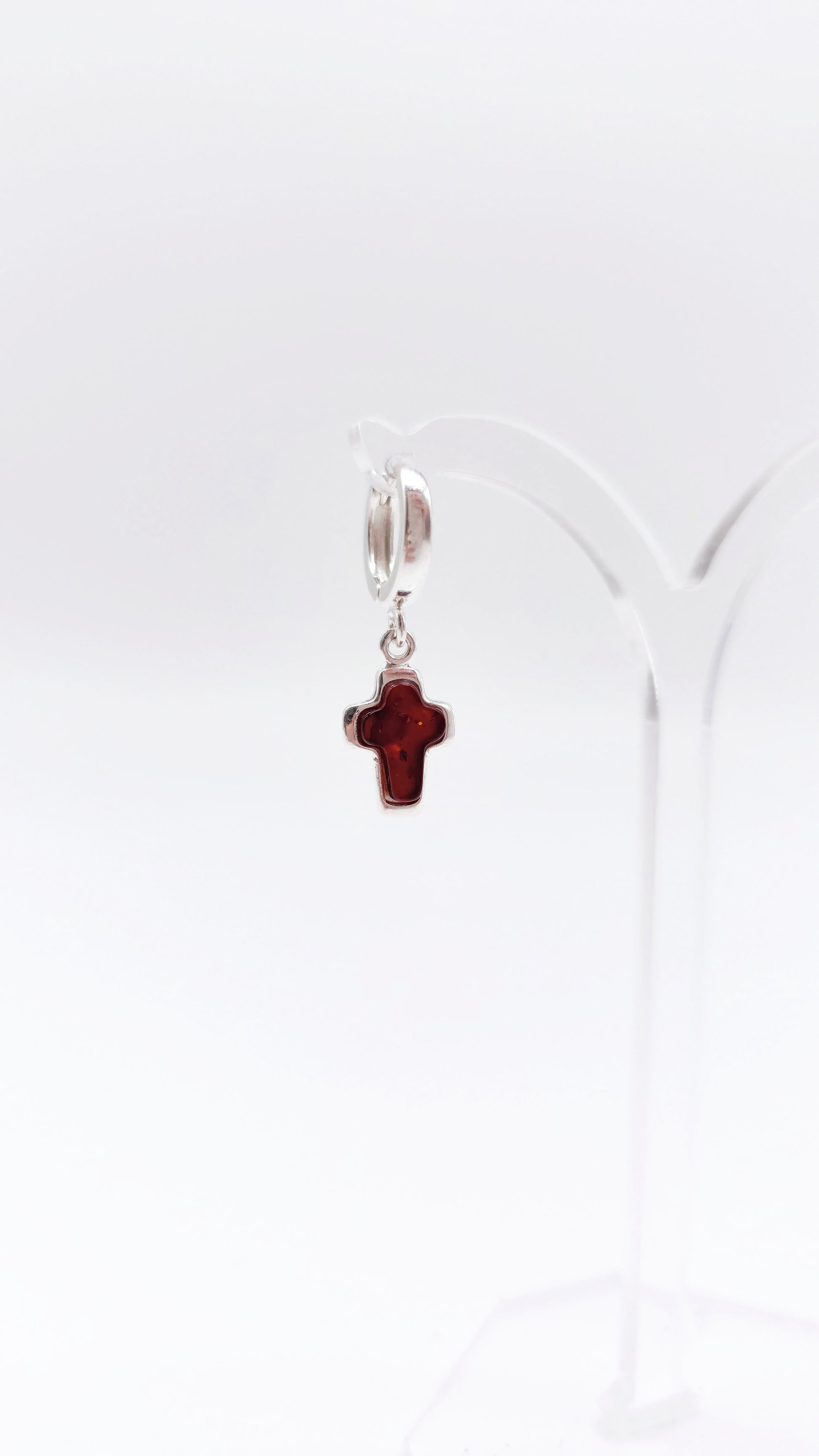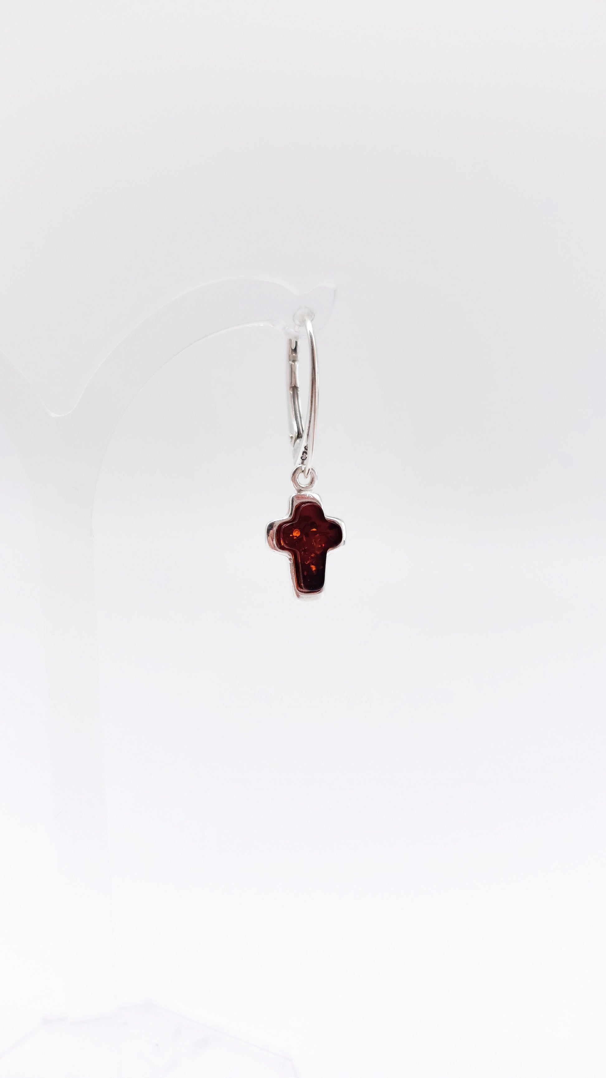 This delicate earring with a cross pendant made of genuine amber and lustrous 925 silver combines simple elegance with spiritual significance. The deep honey-colored amber radiates in a classic cross shape, making this earring a subtle yet expressive accessory.