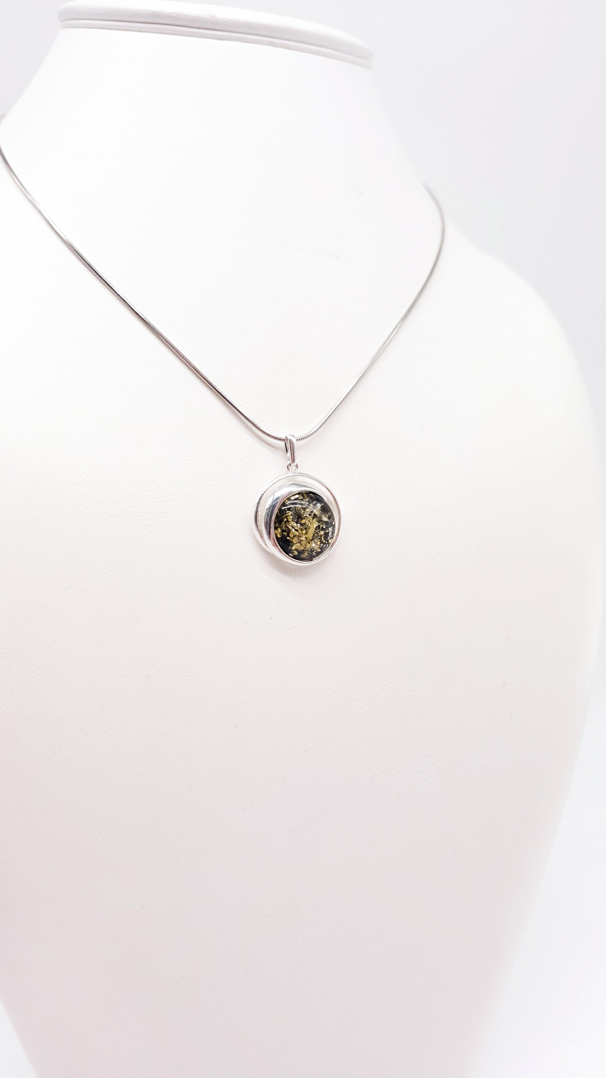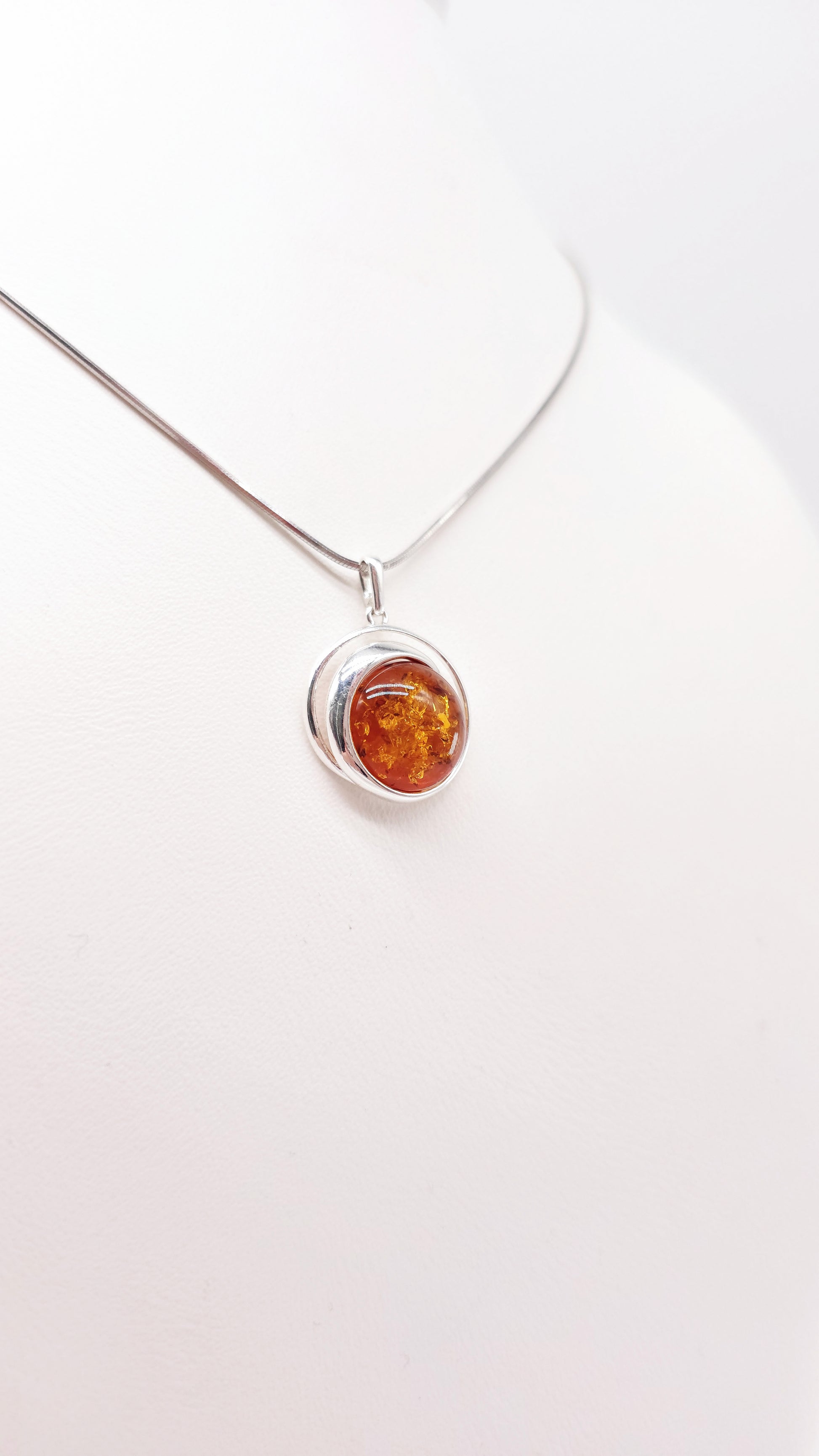 This elegant pendant combines stylish restraint with natural warmth. The round amber, with its intense honey color and clear structure, is framed by a lustrous 925 silver setting. The harmonious design creates a timeless companion that complements any outfit.