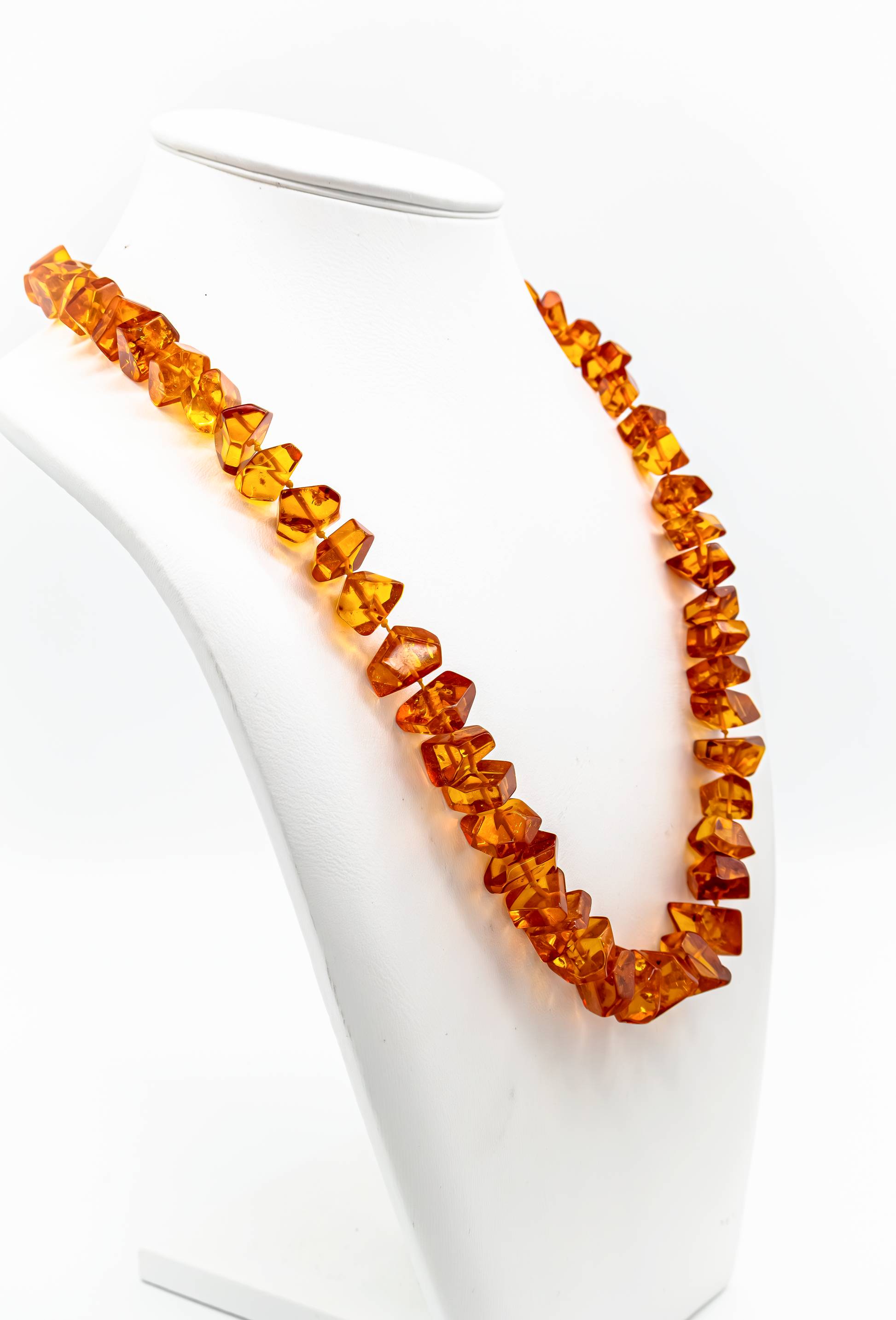 Mit einer Länge von 60 cm und einer Breite von etwa 2 cm liegt sie angenehm am Hals und betont elegant das Dekolleté. Der Schraubverschluss sorgt für sicheren Halt und einfaches Anlegen. Durch die unregelmäßig geschliffenen Formen der einzelnen Bernsteine entsteht ein faszinierendes Spiel aus Licht und Tiefe – jedes Stück ist ein Unikat der Natur.