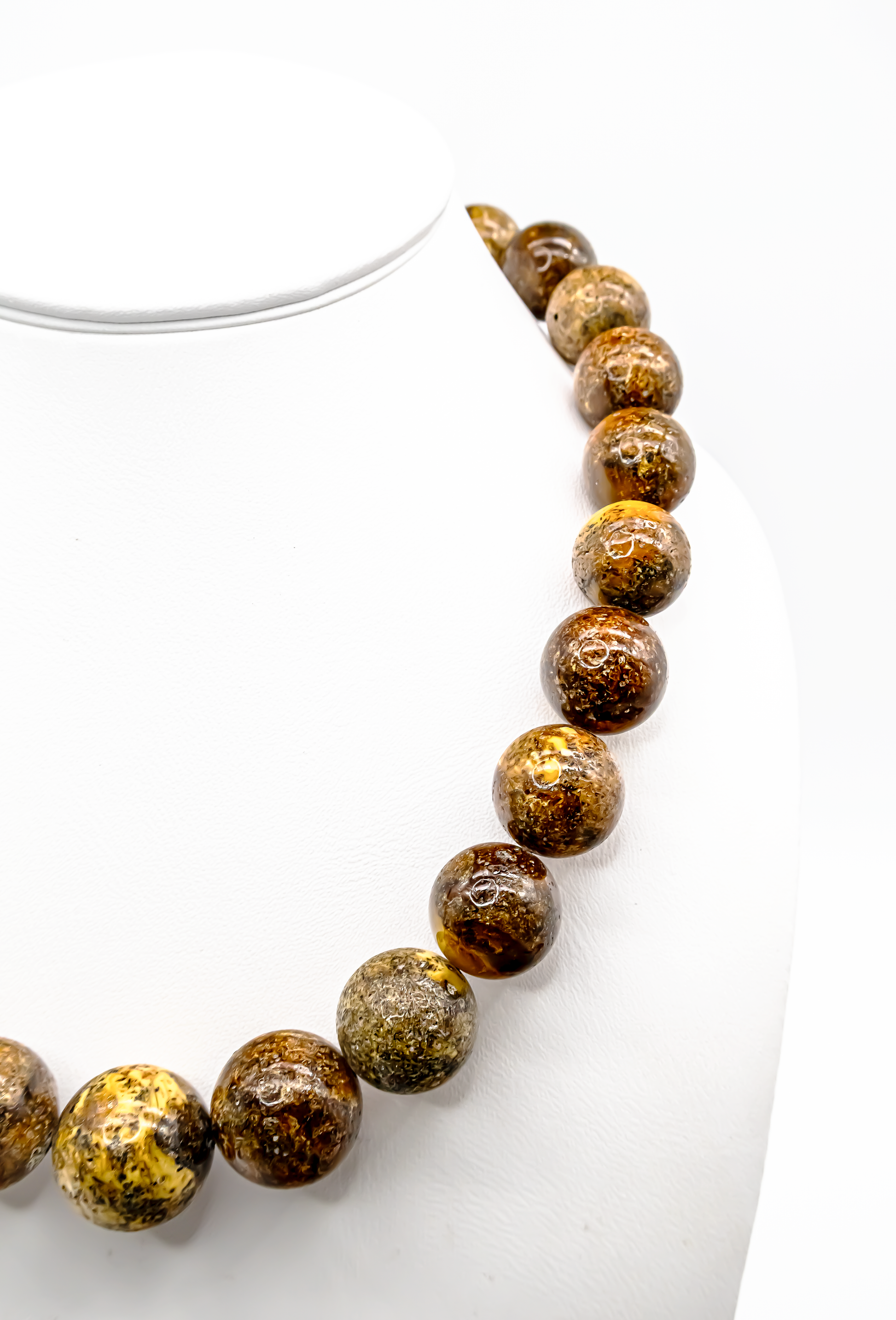 Diese exklusive Bernstein Halskette beeindruckt durch ihre erdigen, warmen Farbtöne und ihre außergewöhnlich große Perlenform. Jede Kugel aus echtem Bernstein wurde von Hand geschliffen, poliert und zu einer harmonischen Komposition zusammengefügt. Die Farbpalette reicht von dunklem Cognac und Moosgrün bis hin zu goldgelben Akzenten – ein faszinierendes Spiel aus Tiefe und Licht.
