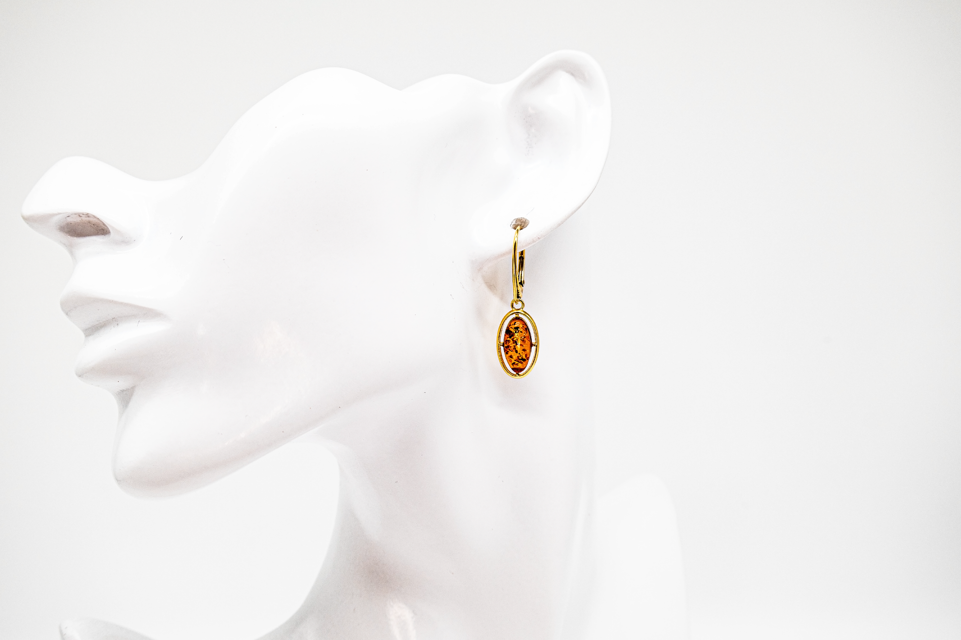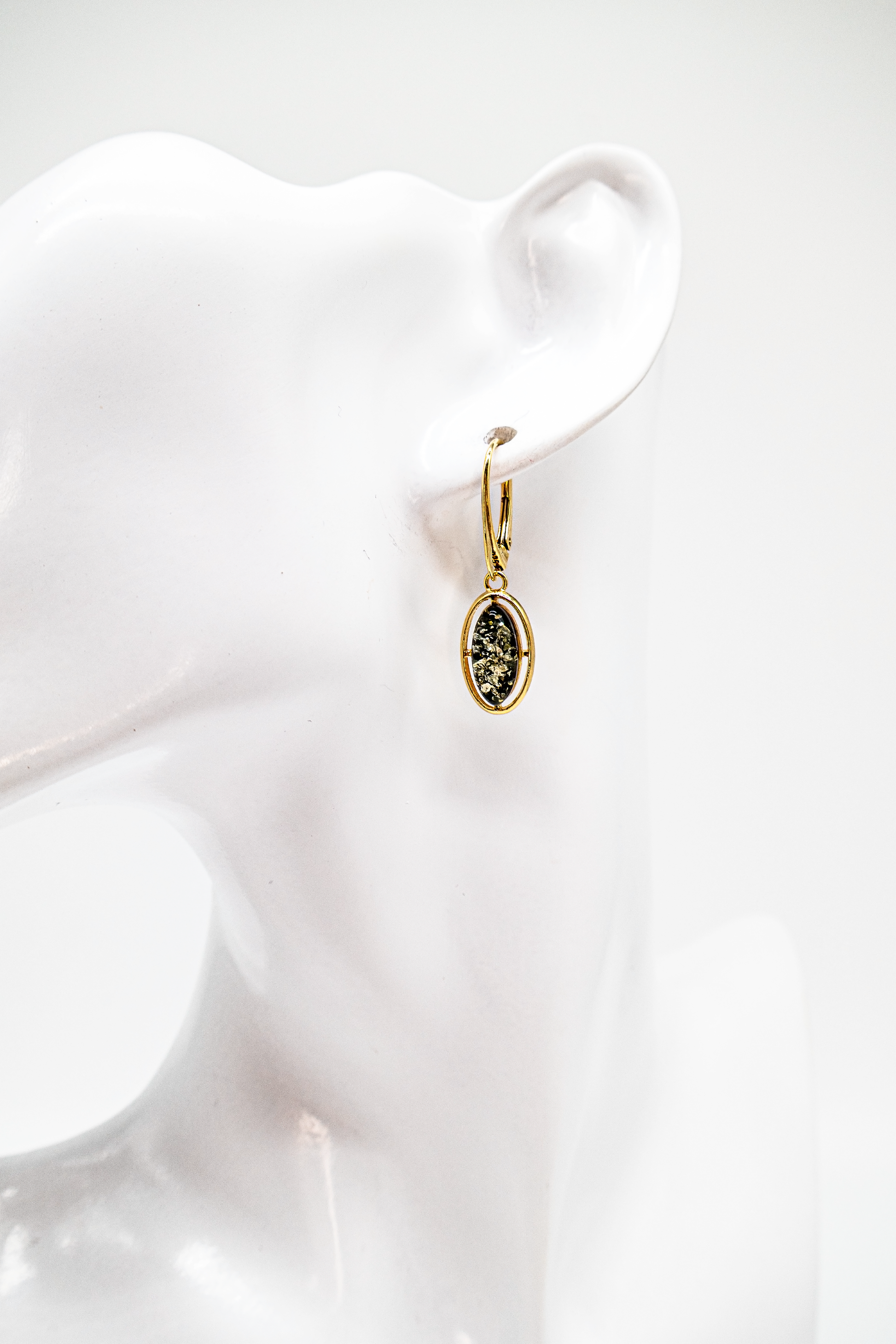 These gold-plated 925 sterling silver earrings combine elegance and uniqueness. Each earring is set with an oval genuine amber stone, whose greenish shimmering inclusions create a fascinating play of light and texture. The high-quality 24-carat gold plating lends the pieces a warm, luxurious radiance, making them a truly special piece. Measuring approximately 3.5 cm x 1.2 cm, the earrings make a statement, yet remain understated and comfortable to wear. Handmade and unique, each pair is unique, making them perfect for everyday wear and special occasions. These earrings are not only a stylish accessory but also a symbolic gift idea —ideal for birthdays, anniversaries, or as an expression of special affection.