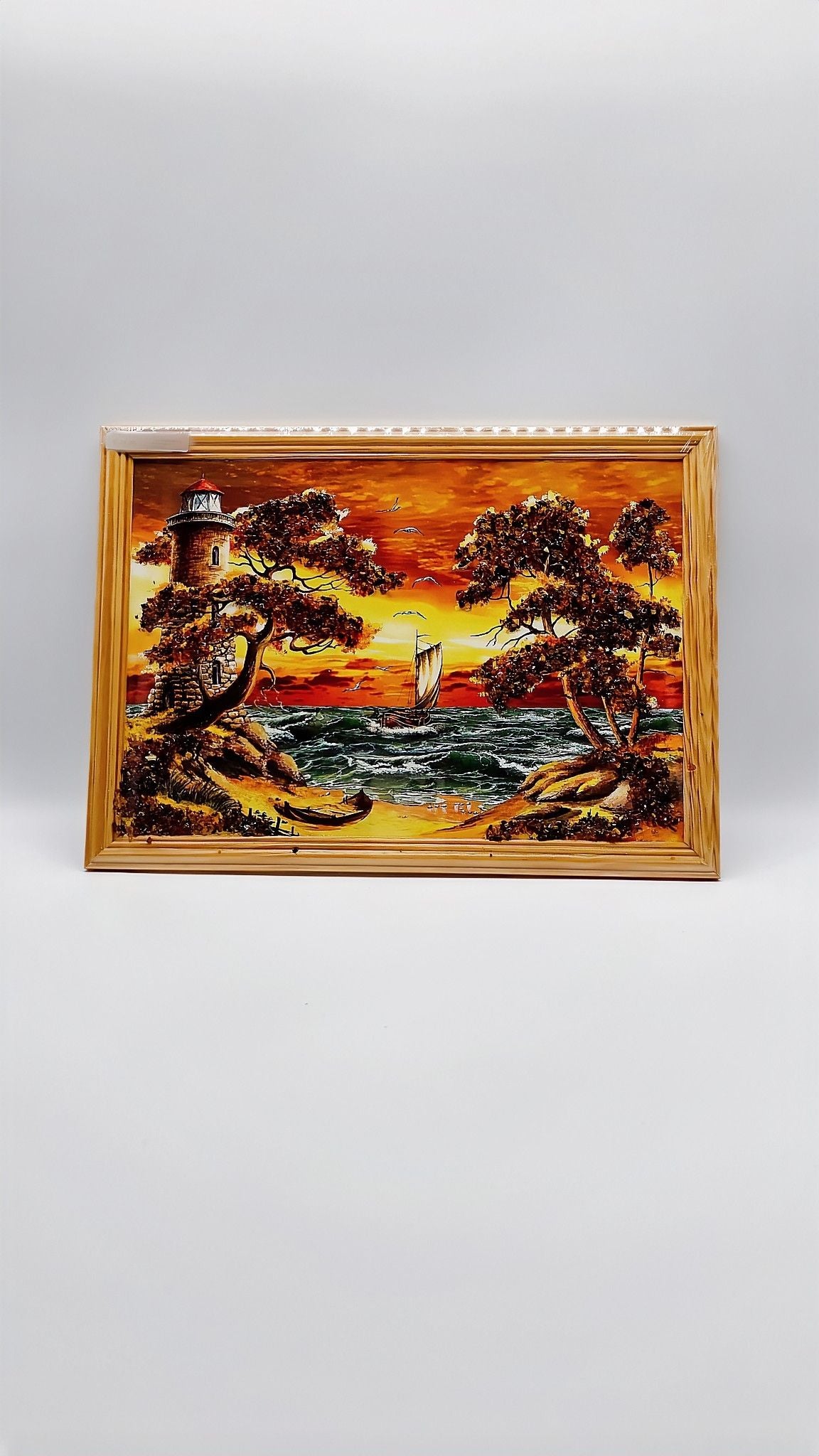This striking amber picture depicts a picturesque coastal landscape at sunset, featuring a charming lighthouse and a sailboat gently gliding on the waves. The warm, golden tones of the amber lend the picture a special depth and vibrancy, perfectly complemented by the rustic wooden frame. This work of art brings a maritime atmosphere and timeless elegance to any home. A must-have for lovers of amber art and maritime scenes.