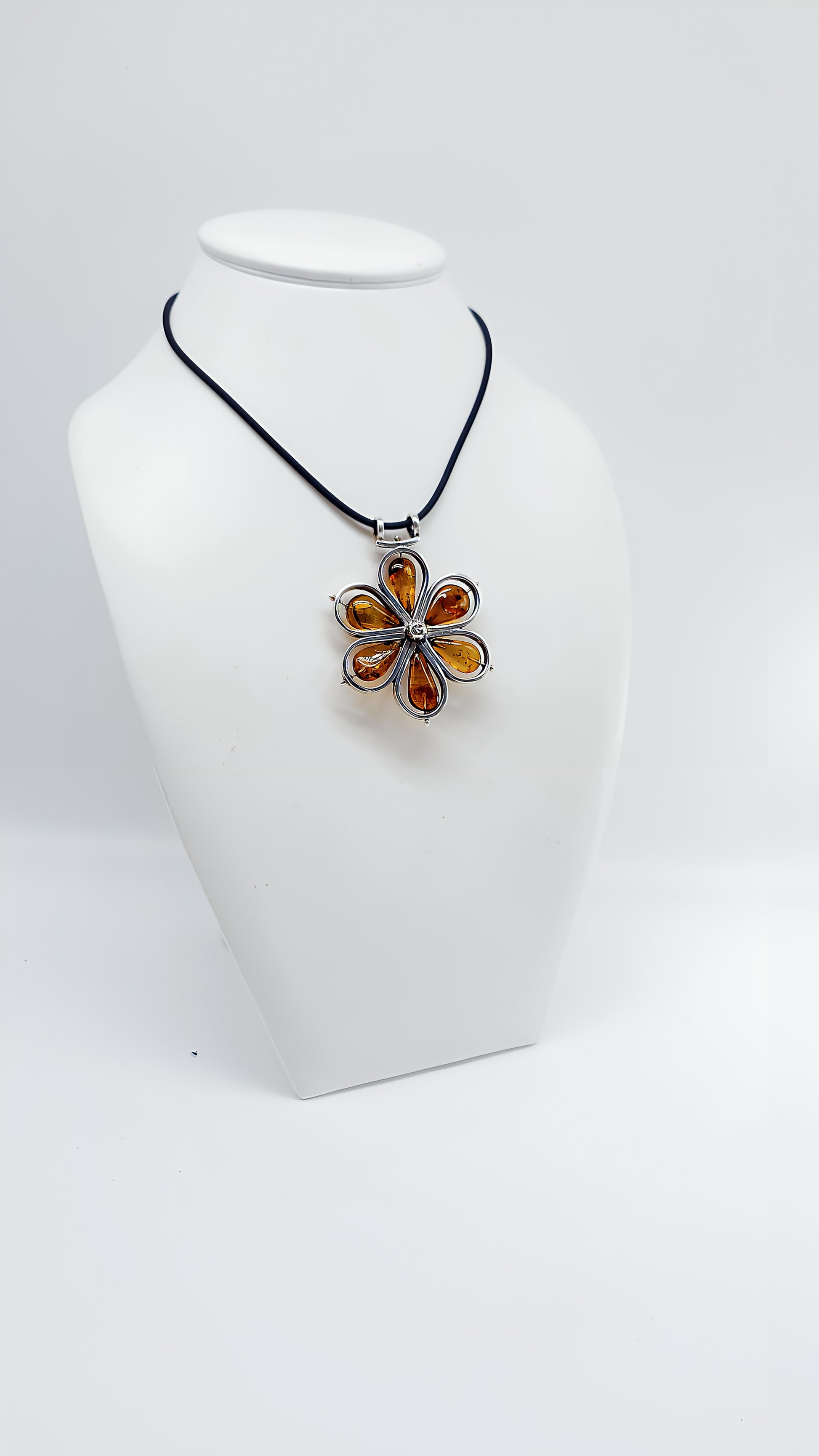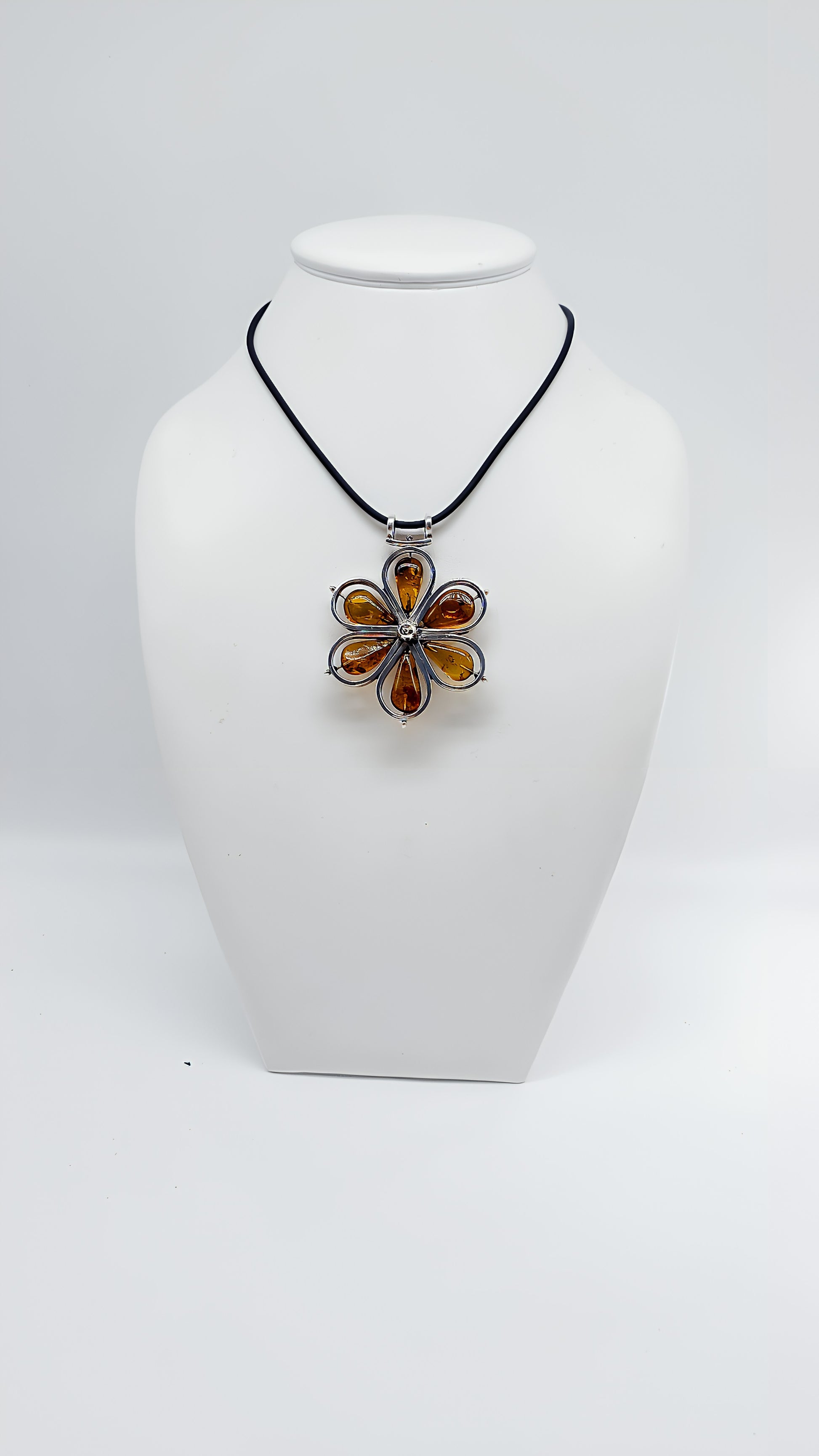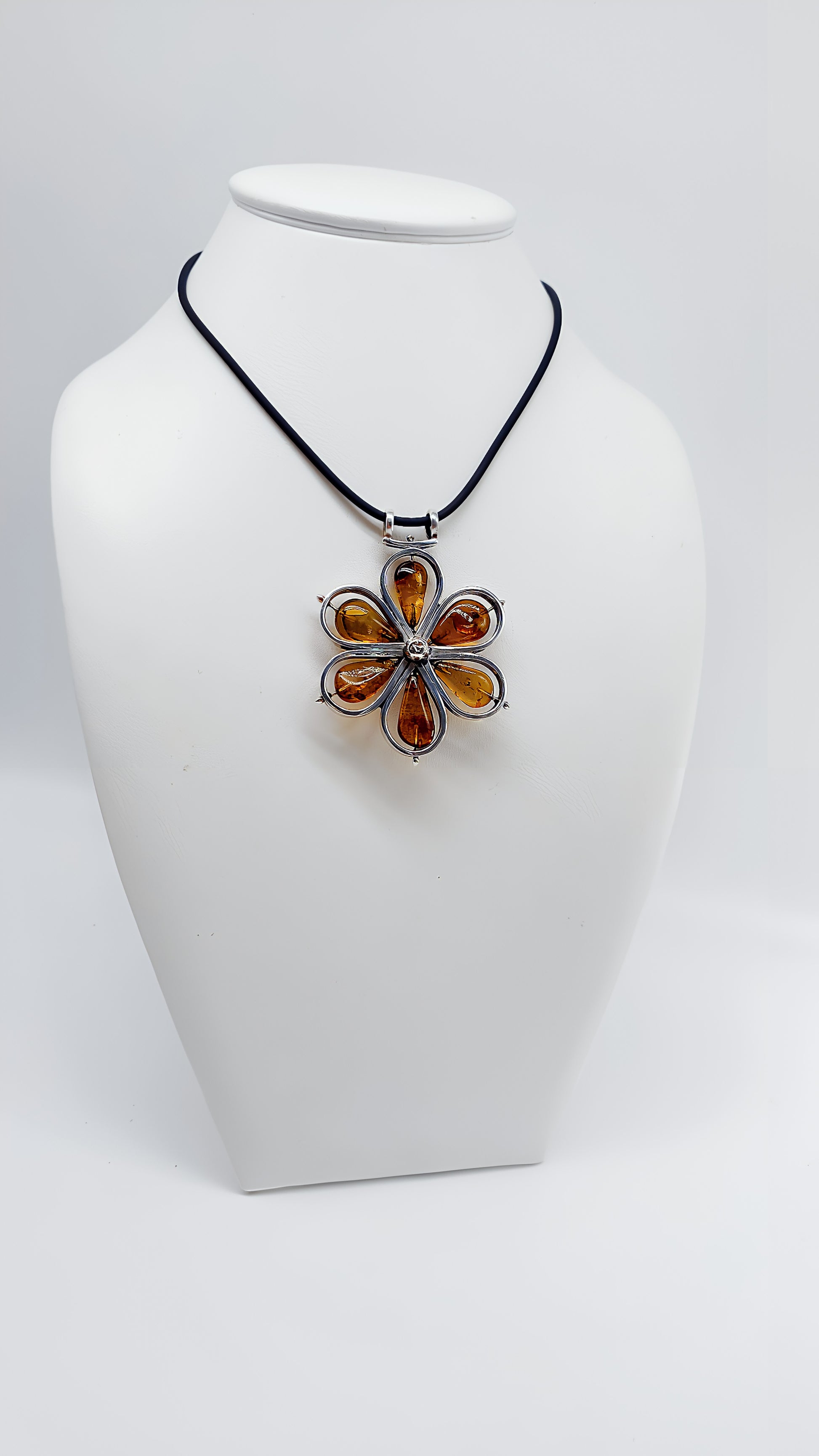 This exquisite amber flower pendant combines artistic design with the natural beauty of amber. The luminous petals of golden amber, set in delicate silver, exude a timeless elegance. Each pendant is unique, captivating with its unique grain and color. This special piece of jewelry is ideal for special occasions or to add an elegant touch to your everyday look.