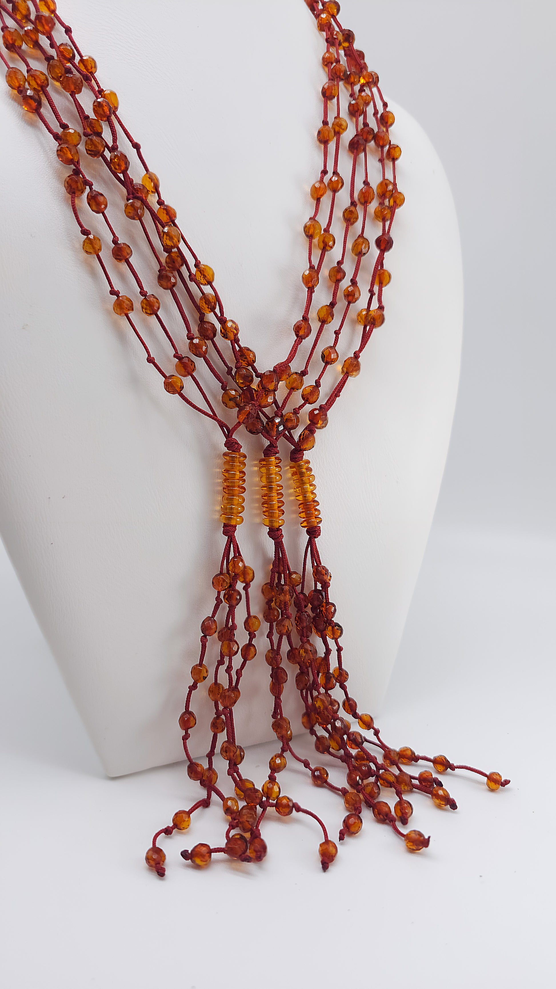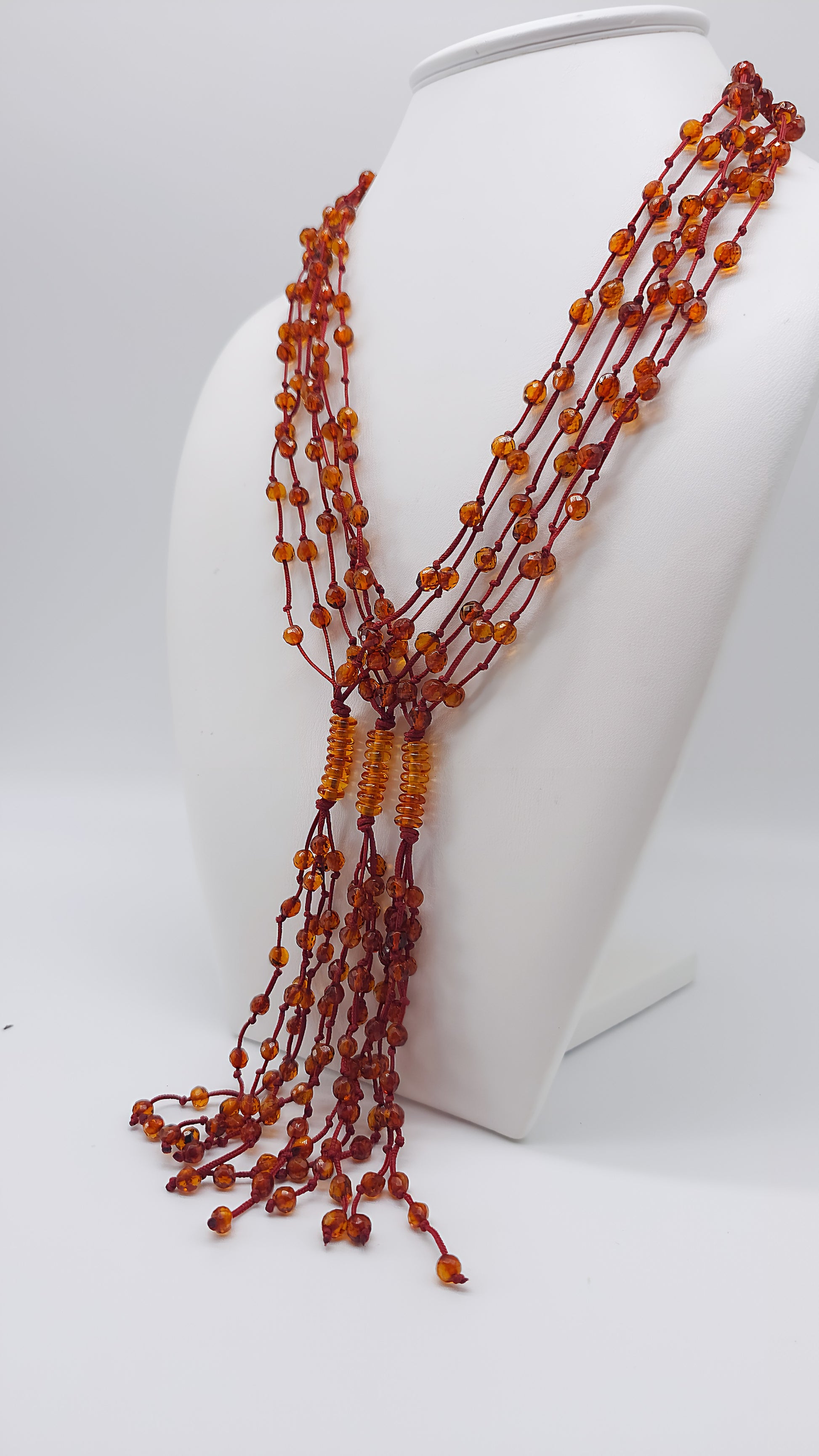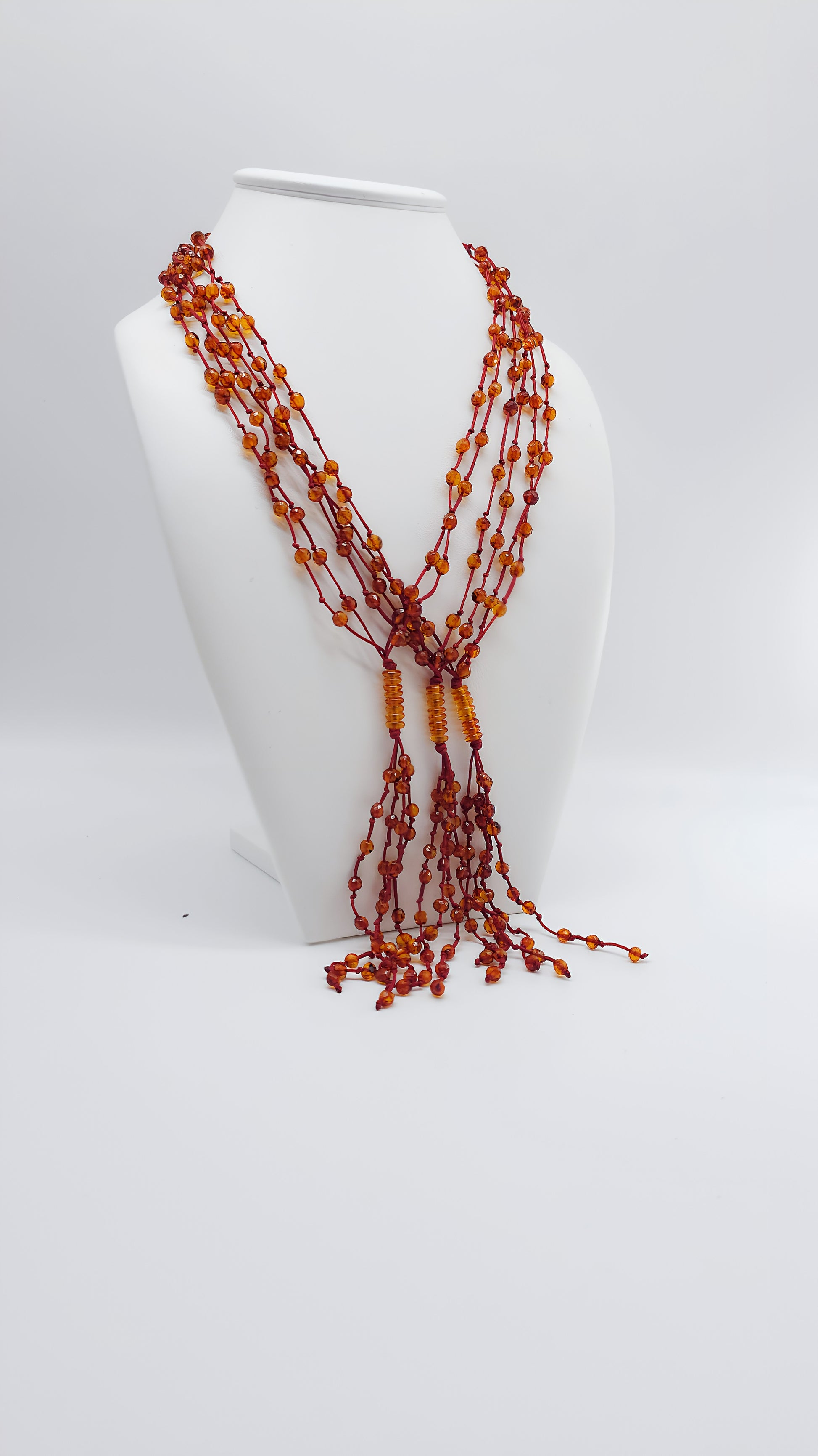 This stunning amber necklace combines many fine strands of warm amber beads, radiating in various shades of red. The artful arrangement of the beads and the light, flowing strands lend the necklace a special dynamism and vibrancy. This piece of jewelry is truly unique, handcrafted to enhance the natural beauty of the amber. Perfect for special occasions or to add a luxurious and elegant touch to your everyday look.