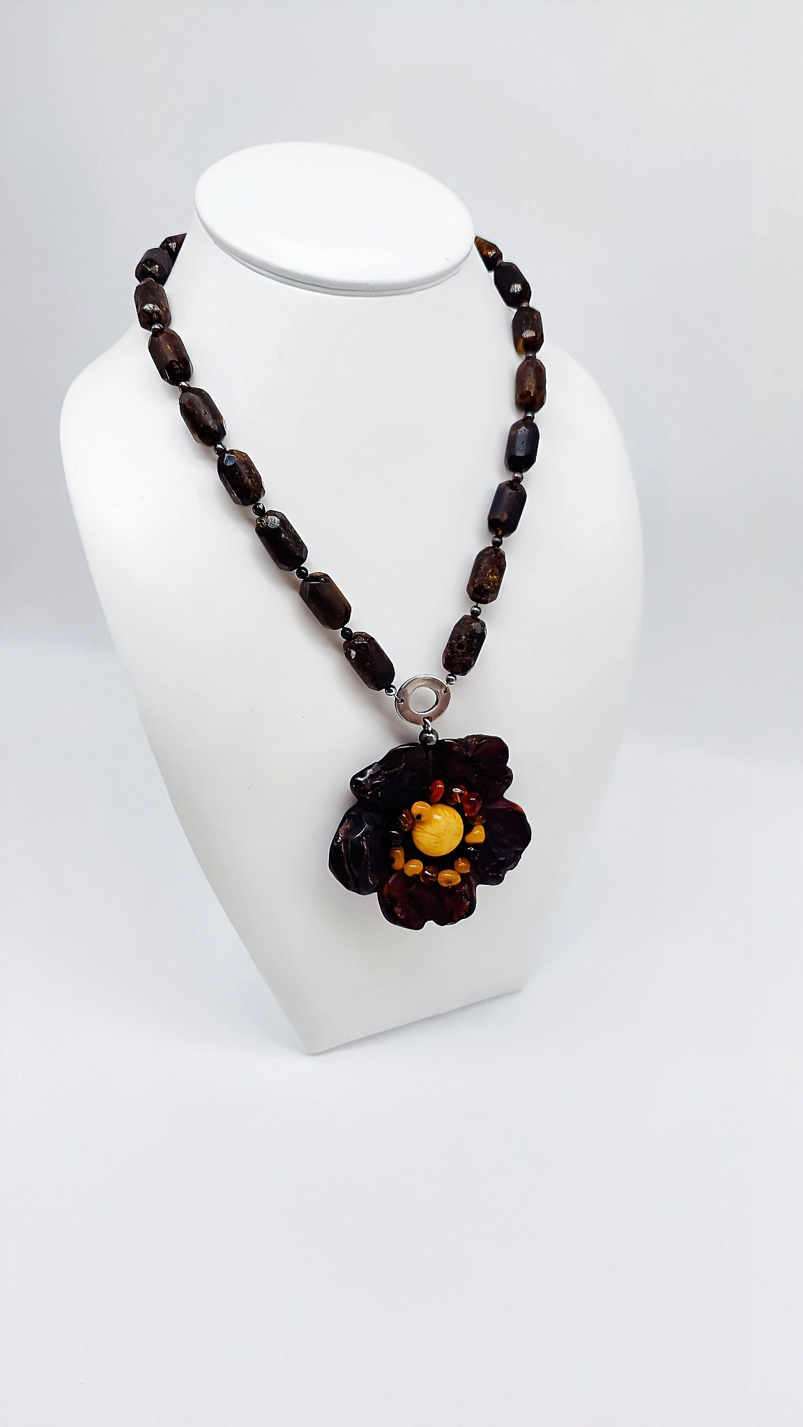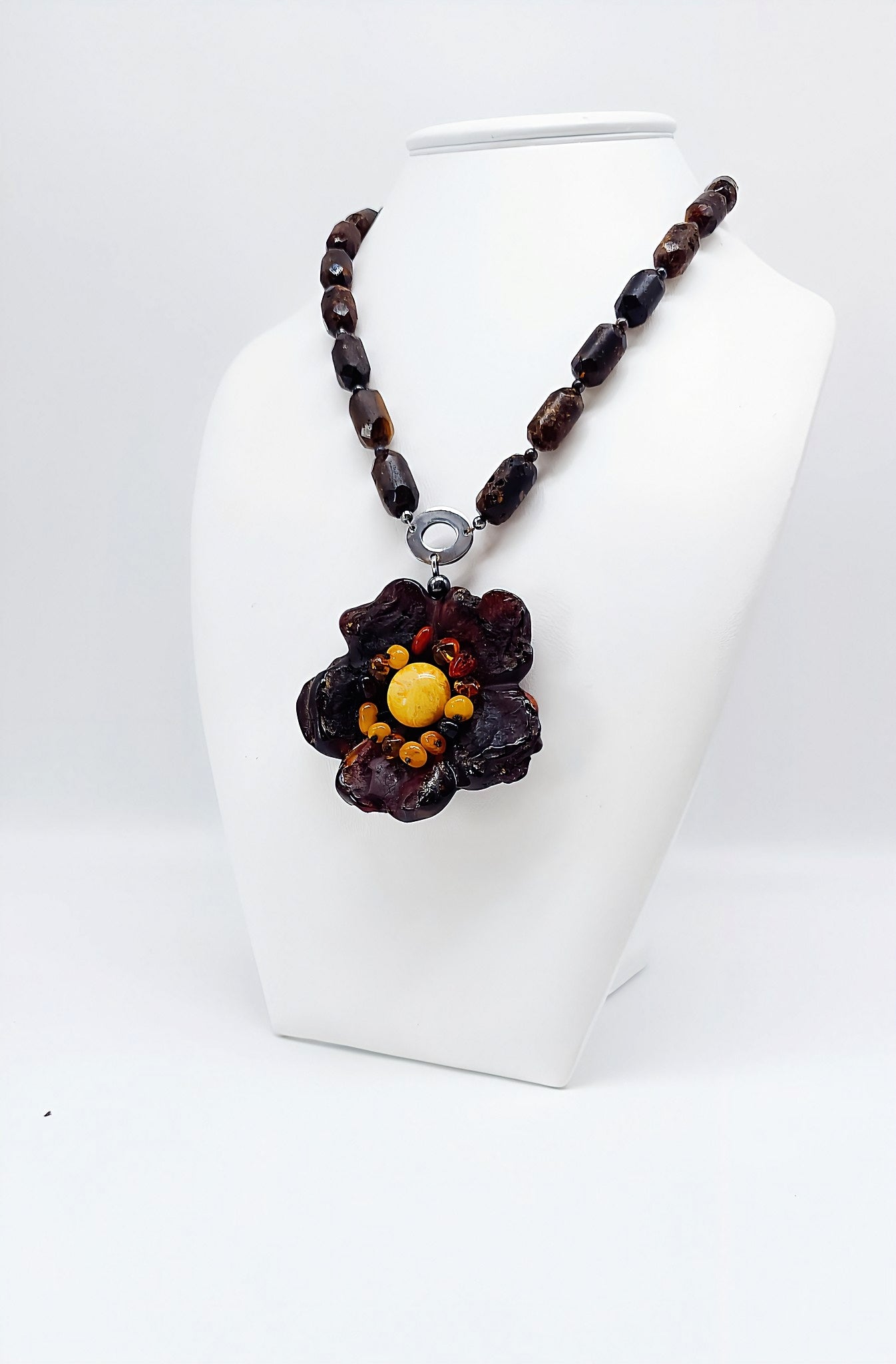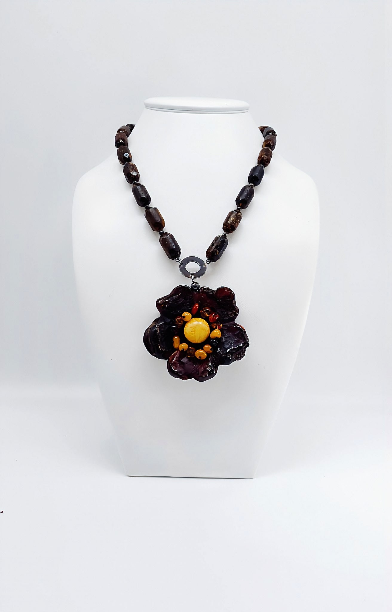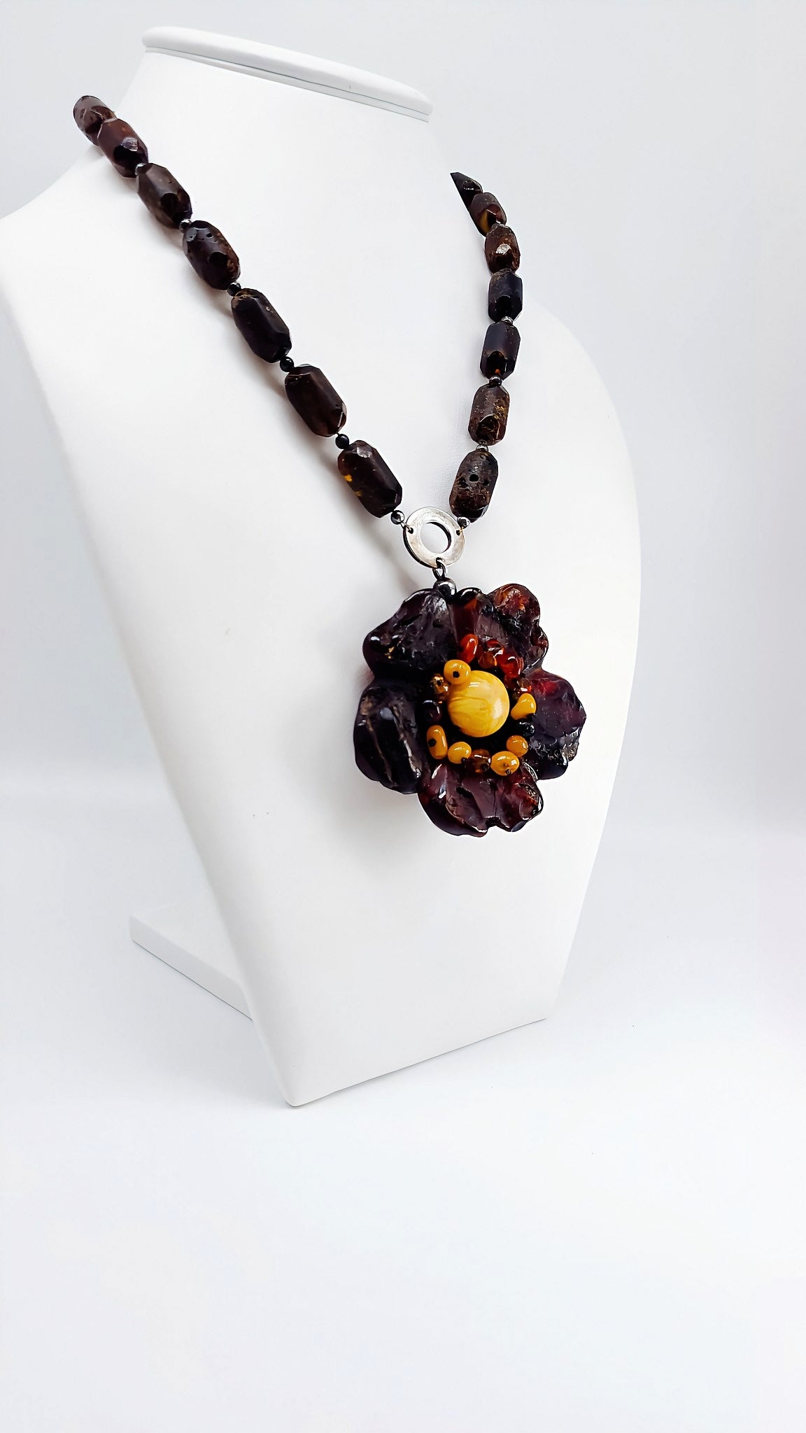 This extraordinary amber necklace combines the natural beauty of amber with a creative floral design. The large flower pendant, crafted from various types of amber, stands out strikingly against the necklace's dark amber beads. Each bead and pendant has been carefully handcrafted, making this necklace a unique piece of jewelry. Perfect for special occasions or to add a personal touch to your look.