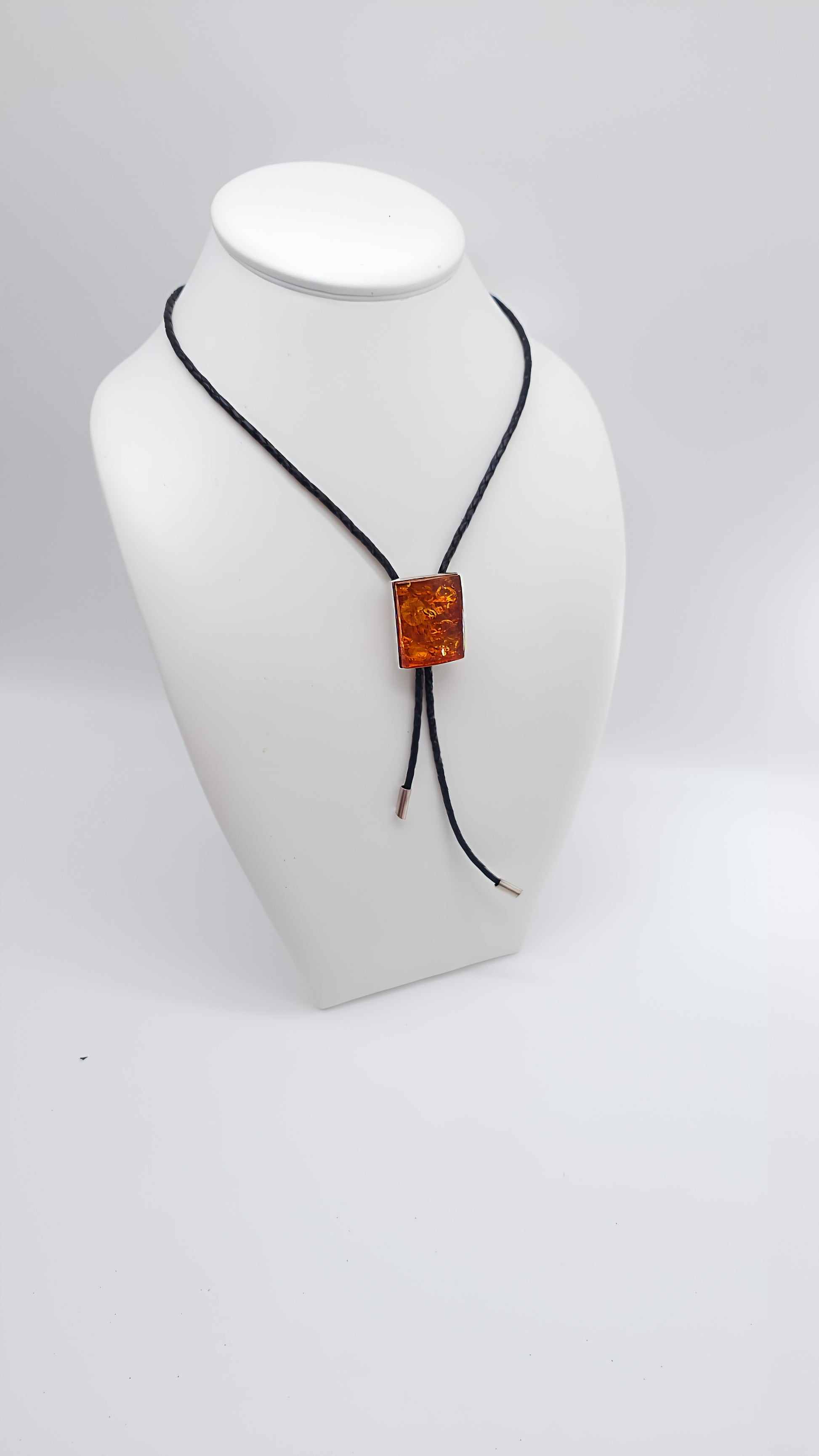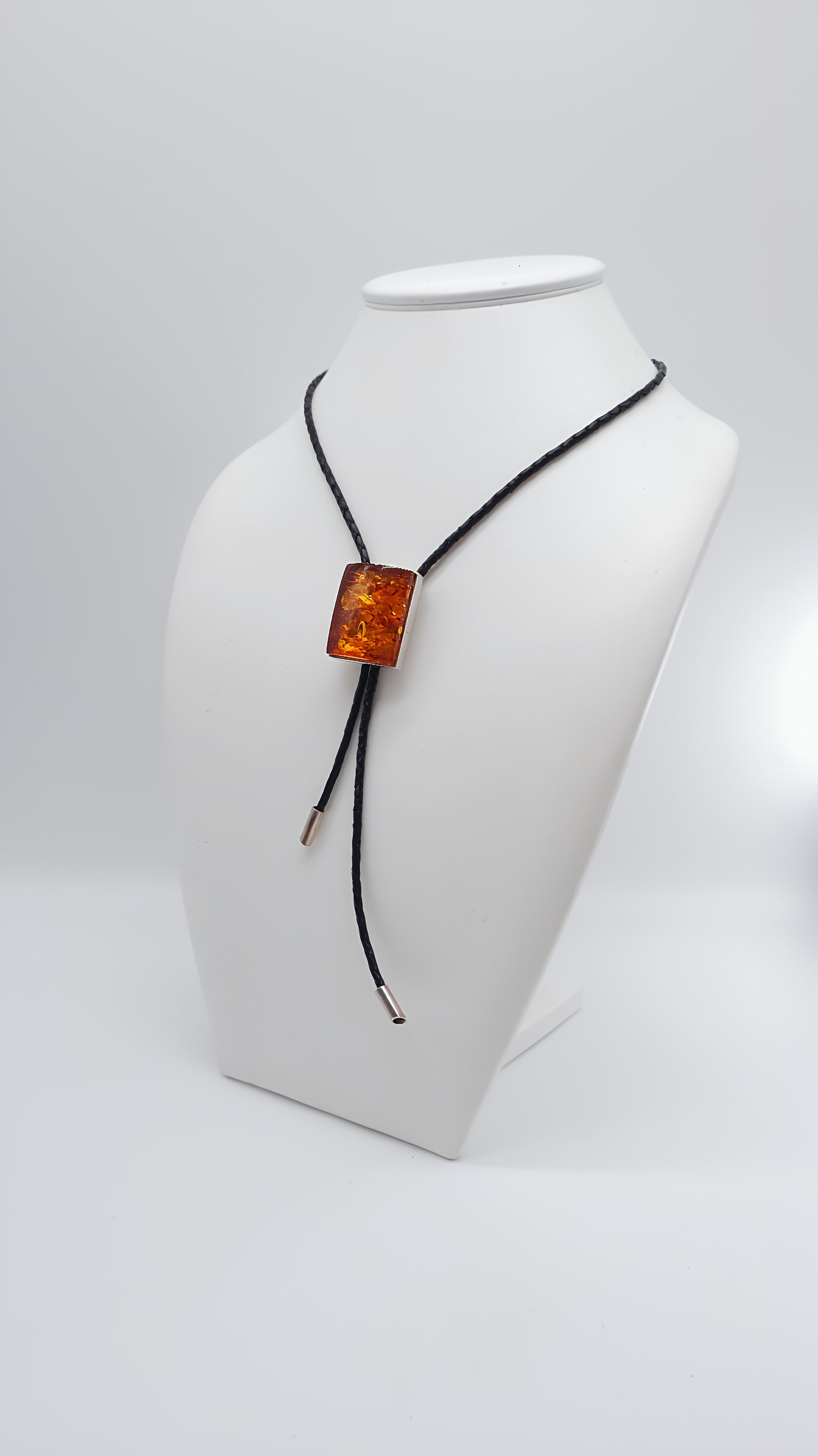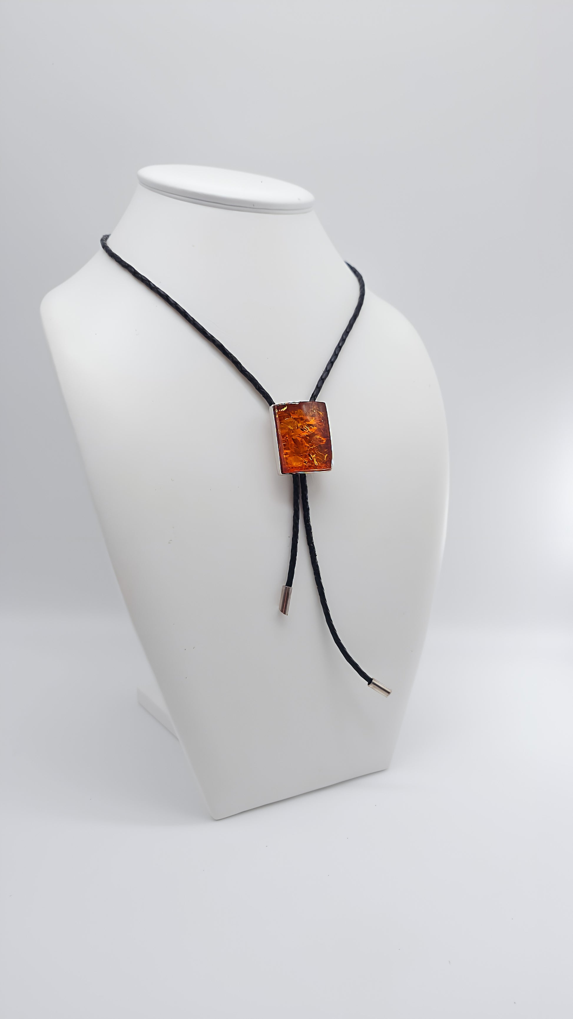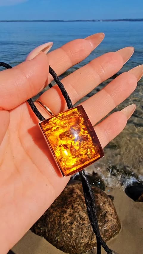 This stylish amber pendant is a real eye-catcher. The rectangular amber, set in an elegant metal frame, hangs from a simple black leather cord. The warm, vibrant color of the amber contrasts with the minimalist design and gives the piece a special appeal. Each piece is handcrafted and unique, showcasing the natural beauty of the amber. Perfect for everyday wear or special occasions.