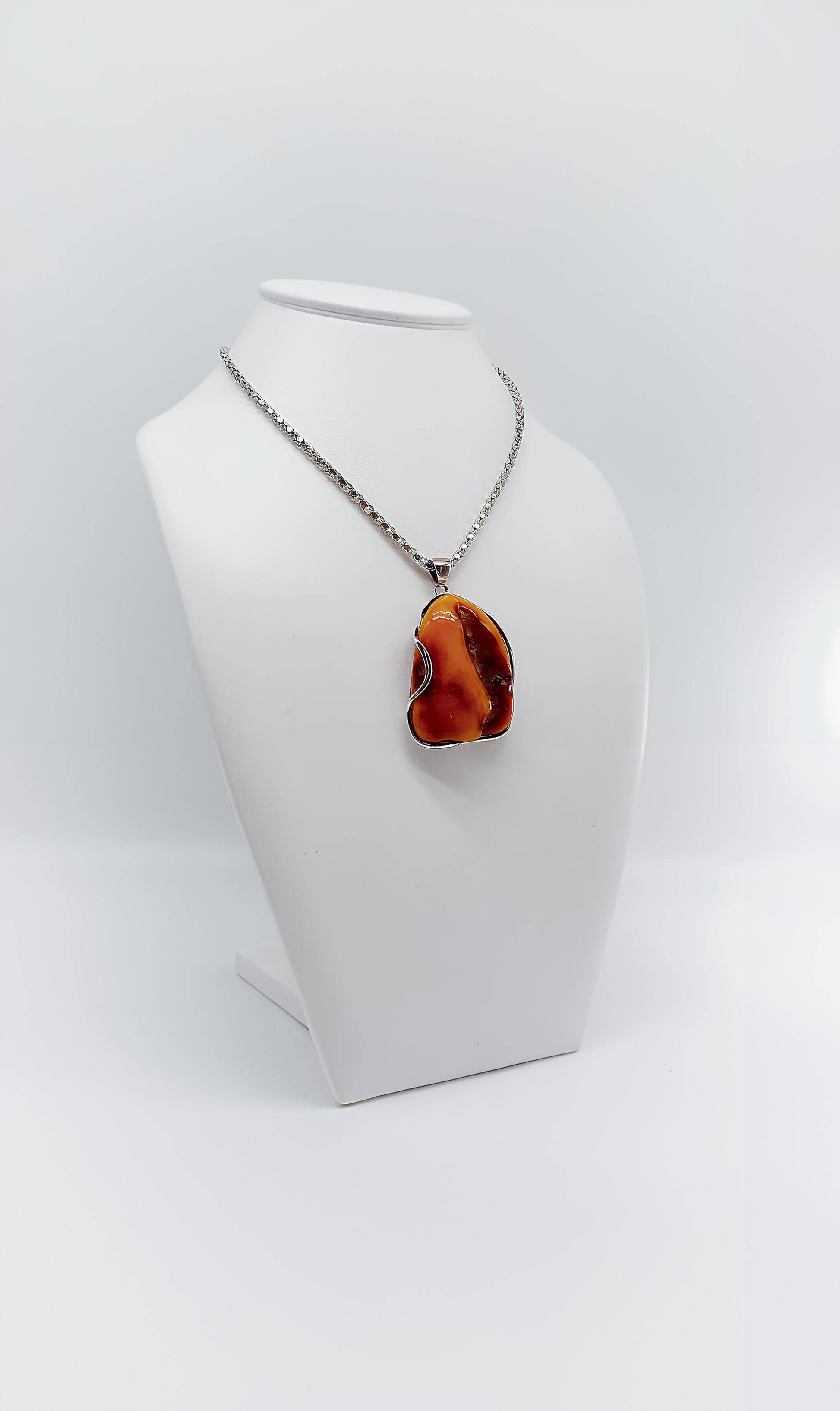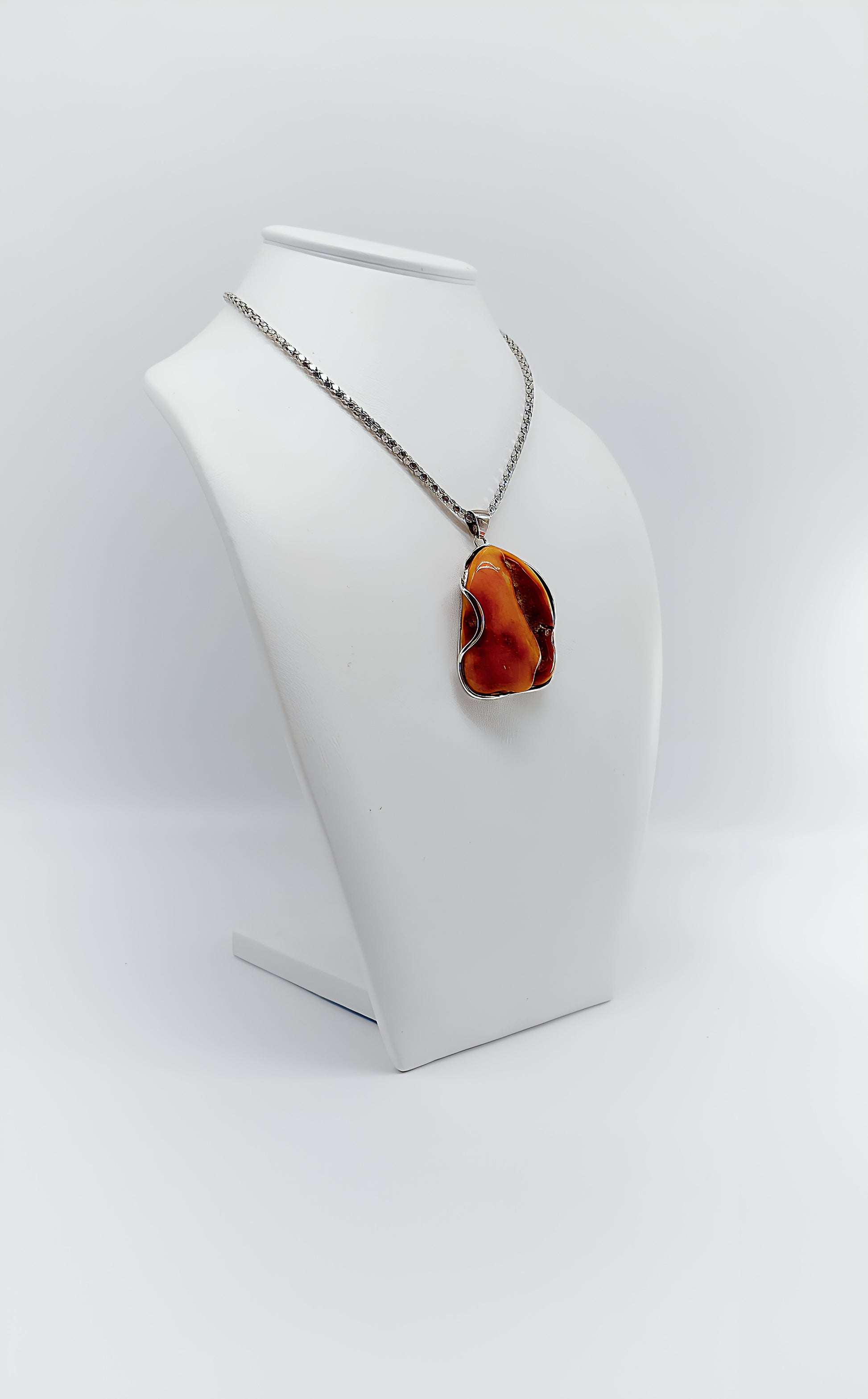 This exceptional pendant, crafted from 925 sterling silver and amber, captivates with its organic, drop-shaped form, reminiscent of a liquid amber pearl. The amber is masterfully embedded in a simple yet stylish silver setting that emphasizes its natural beauty and depth. This pendant is truly unique, ideal for lovers of nature and unique design, and adds a touch of elegance to any outfit.
