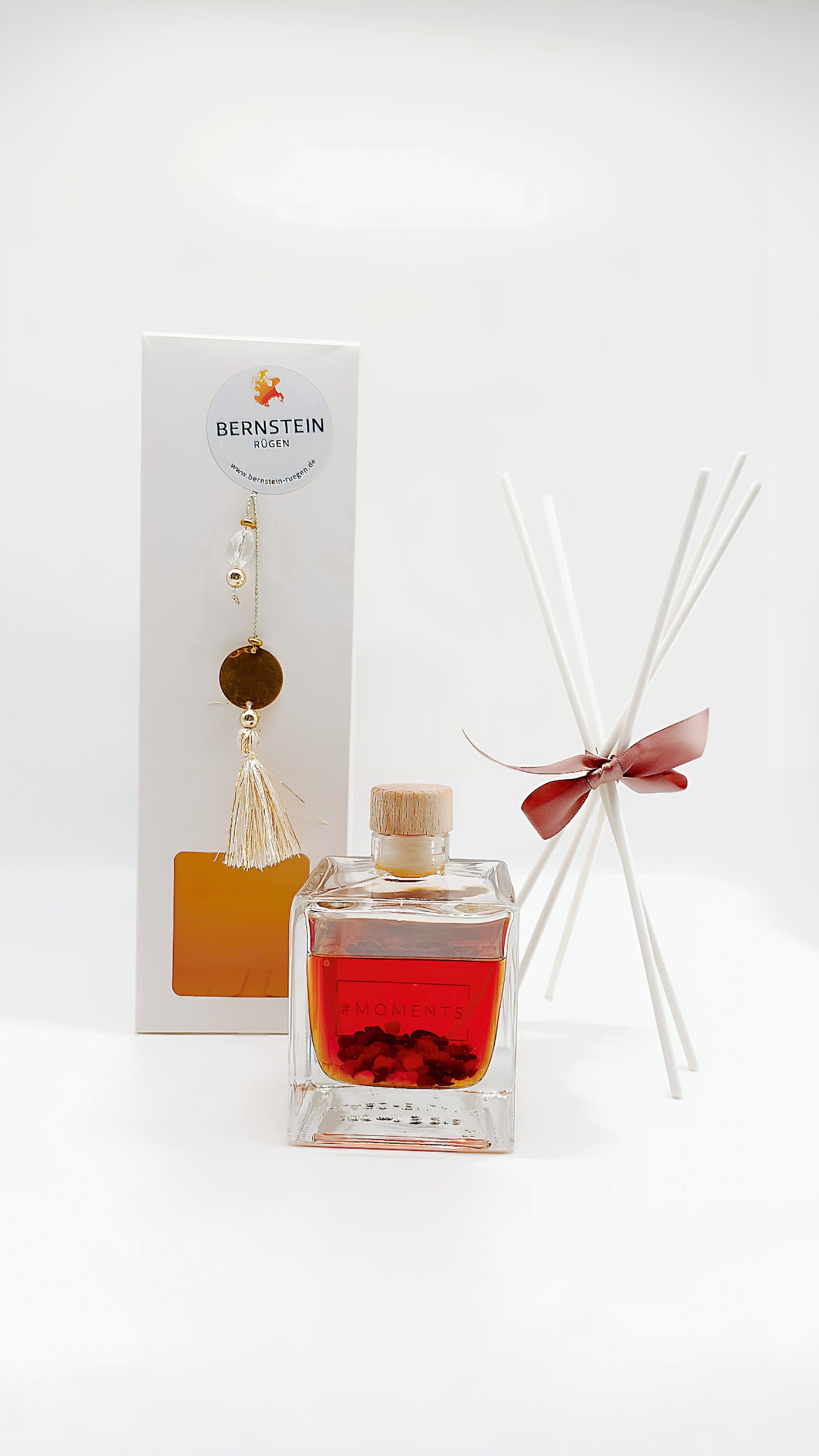 An invigorating jolt where two true forces collide: the pungent freshness of jasmine, orange, and pear meets the warm notes of amber, ginger, vanilla, and sandalwood. This exquisite fragrance set enchants with a harmonious blend of warm and fresh notes. The calming scent of amber, combined with citrus fruits, floral jasmine accents, and a hint of spicy ginger, creates a relaxed atmosphere in any room. The base notes of vanilla, amber, and sandalwood add depth and warmth. Ideal for moments of relaxation and tranquility. The natural reeds distribute the fragrance evenly and ensure long-lasting freshness.