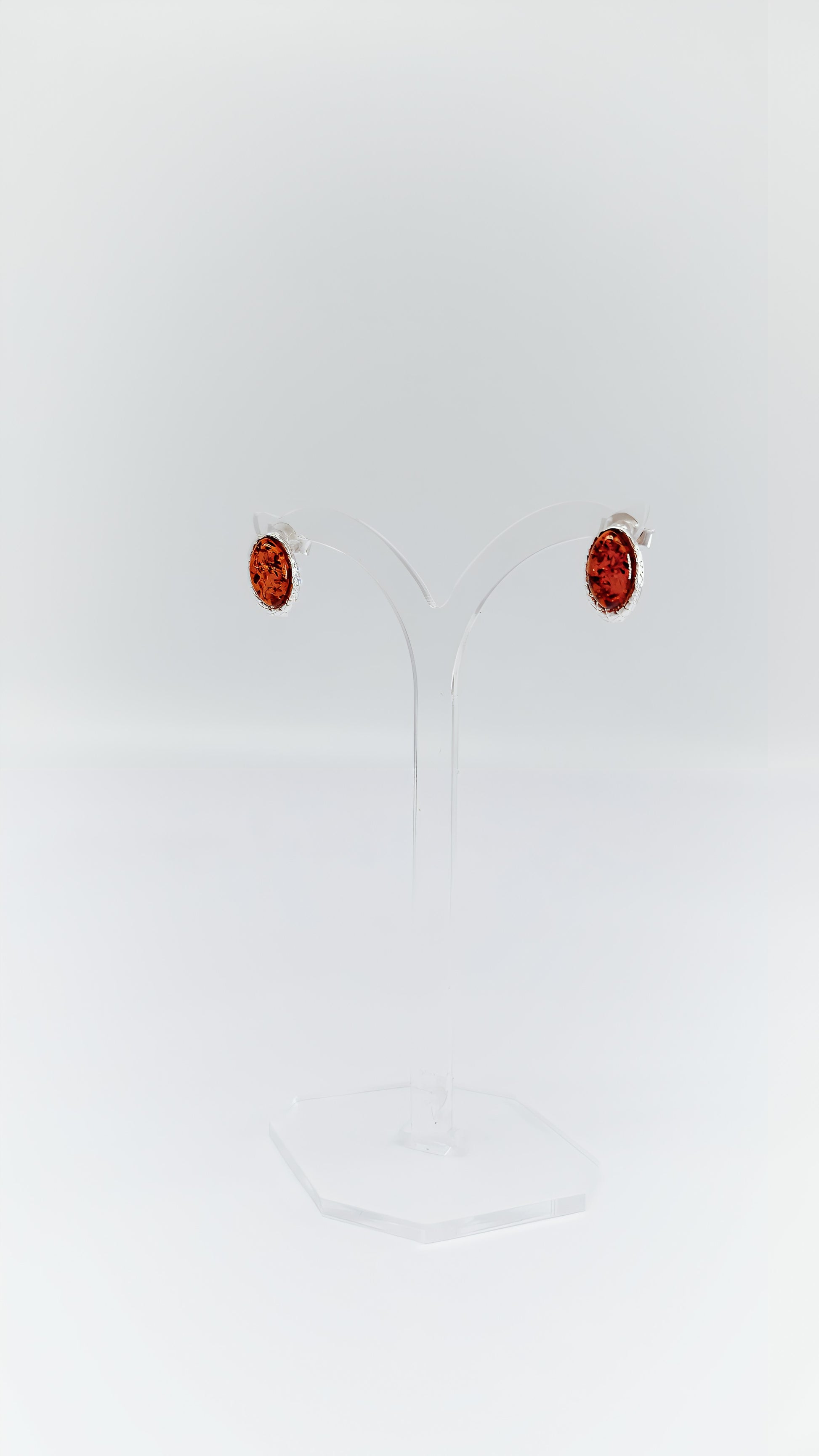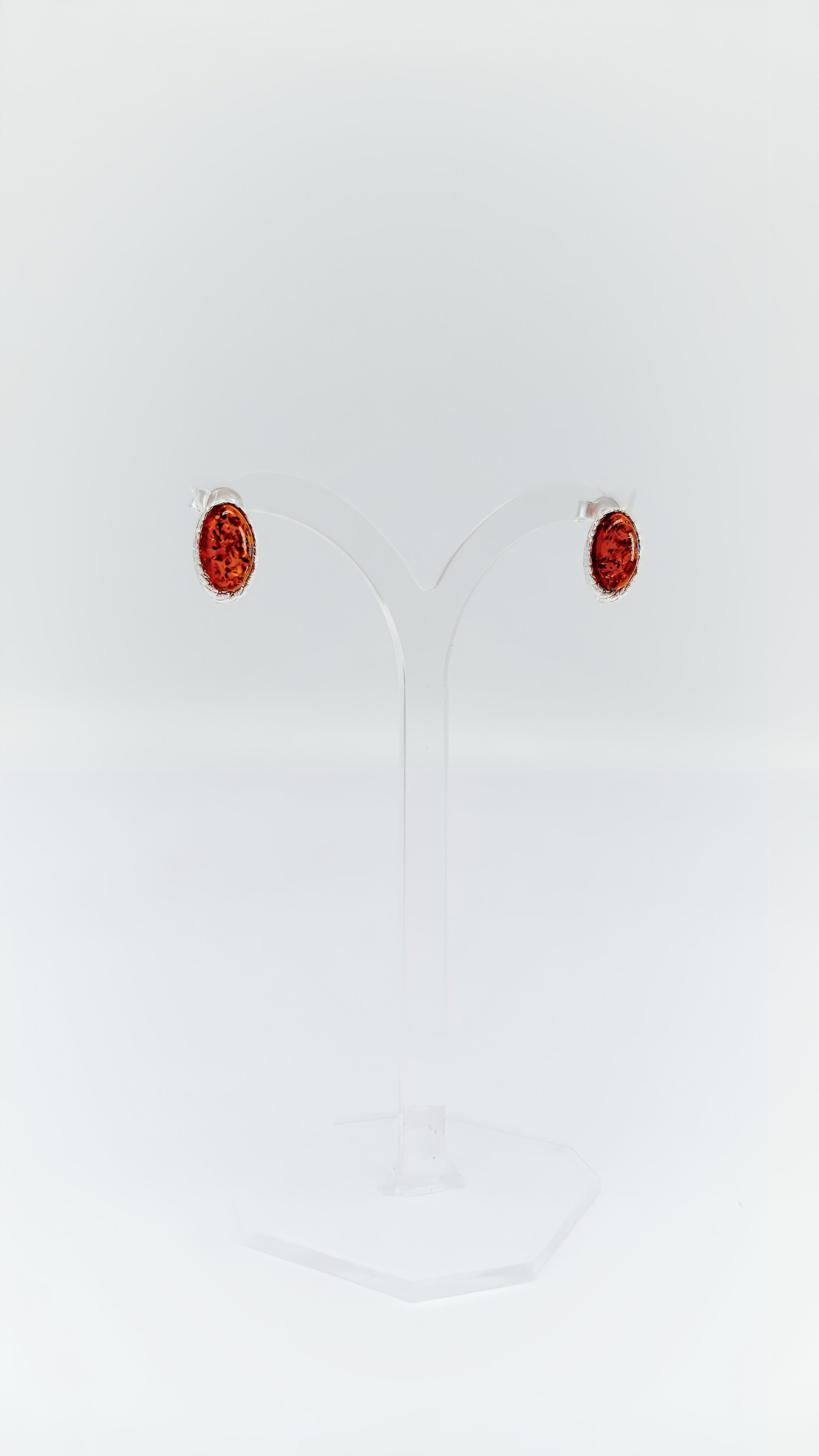 These classic 925 sterling silver stud earrings captivate with their warm, glowing, oval orange amber. The delicate silver design perfectly frames the stone, highlighting its natural luminosity. These pieces combine elegance with the timeless beauty of natural amber and are versatile to wear—whether for everyday wear or special occasions.