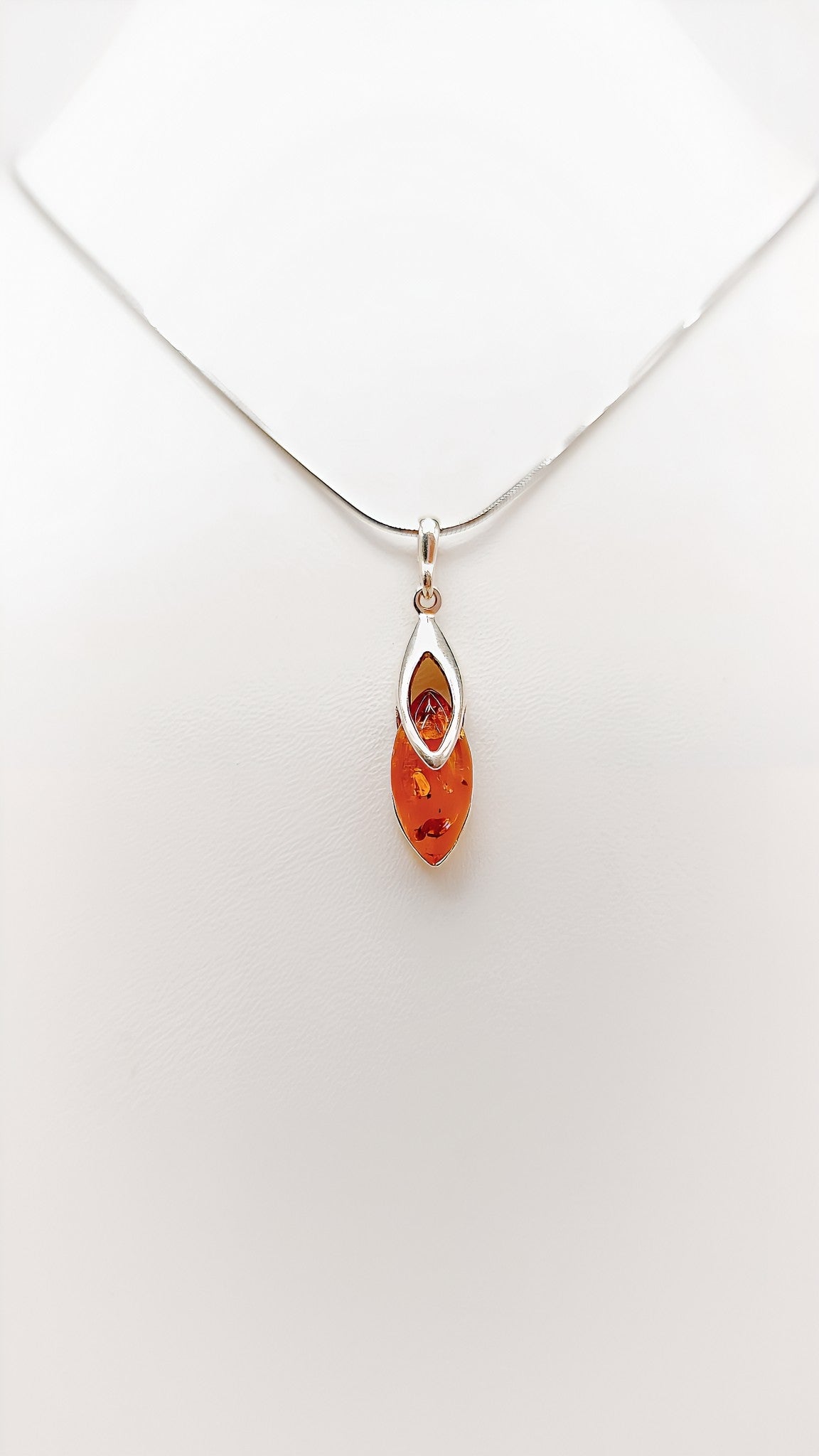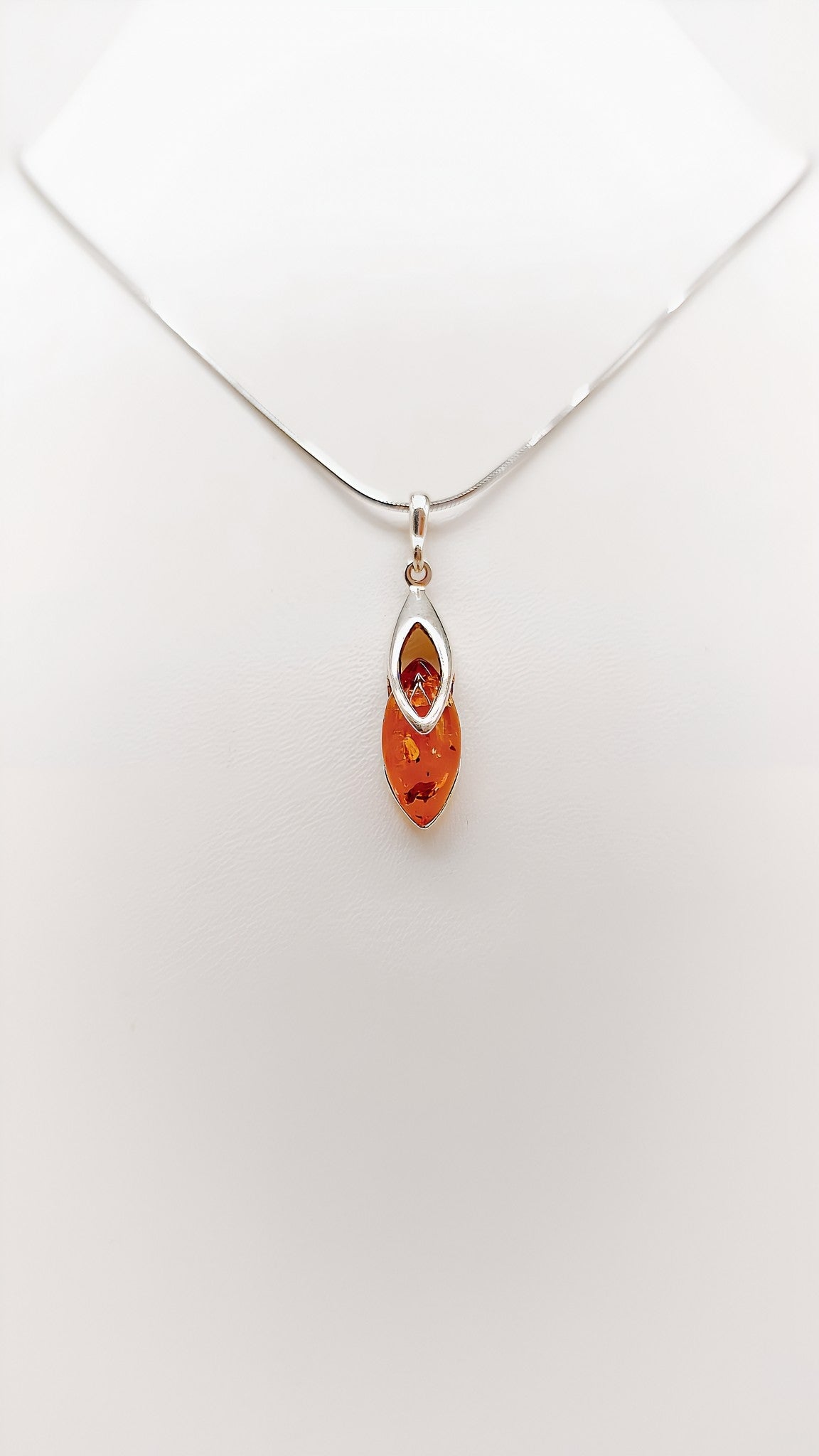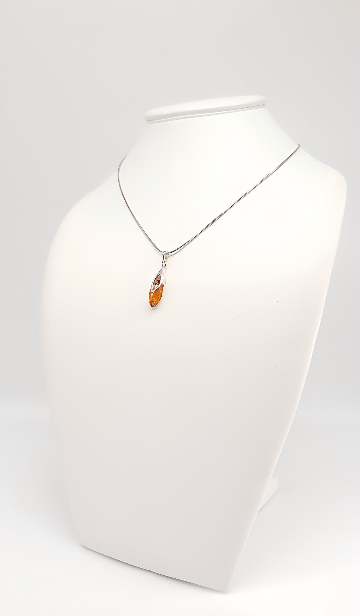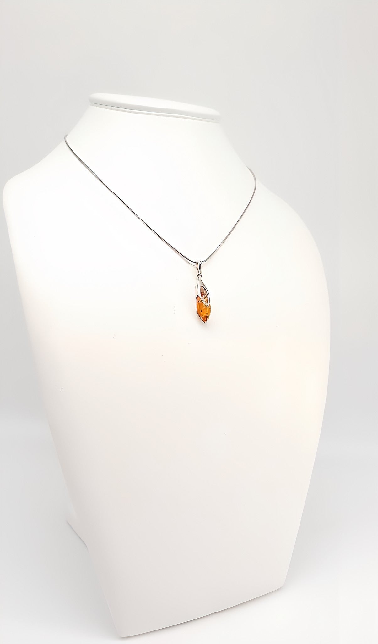 This stylish pendant made of 925 sterling silver captivates with its elegant, flame-shaped design, perfectly showcasing a luminous amber. The combination of the warm color of the amber and the cool silver lends the piece a special radiance. The pendant is a timeless accessory that adds a touch of elegance and sophistication to both everyday wear and special occasions. A must-have for anyone who appreciates sophisticated design and natural beauty.
