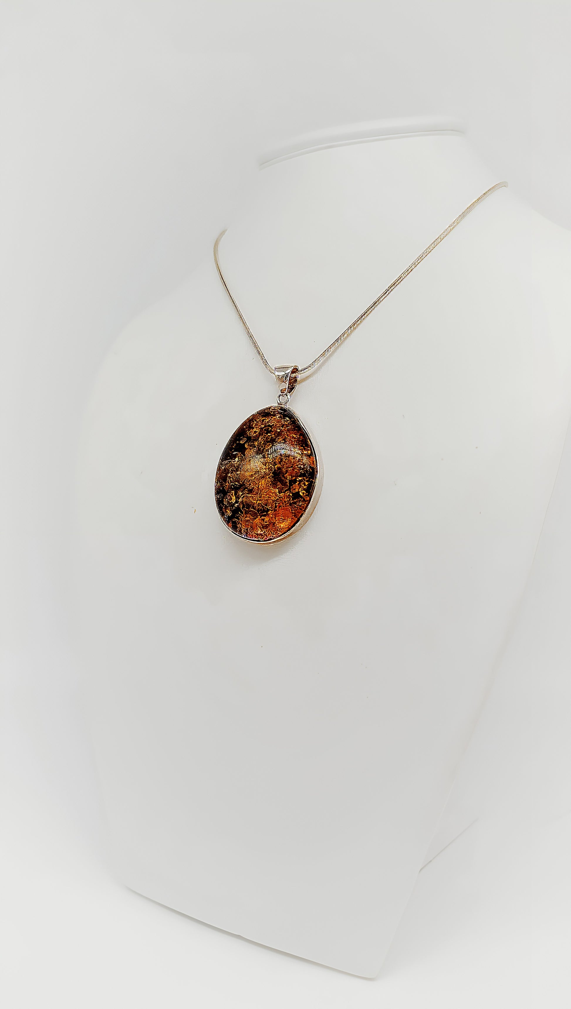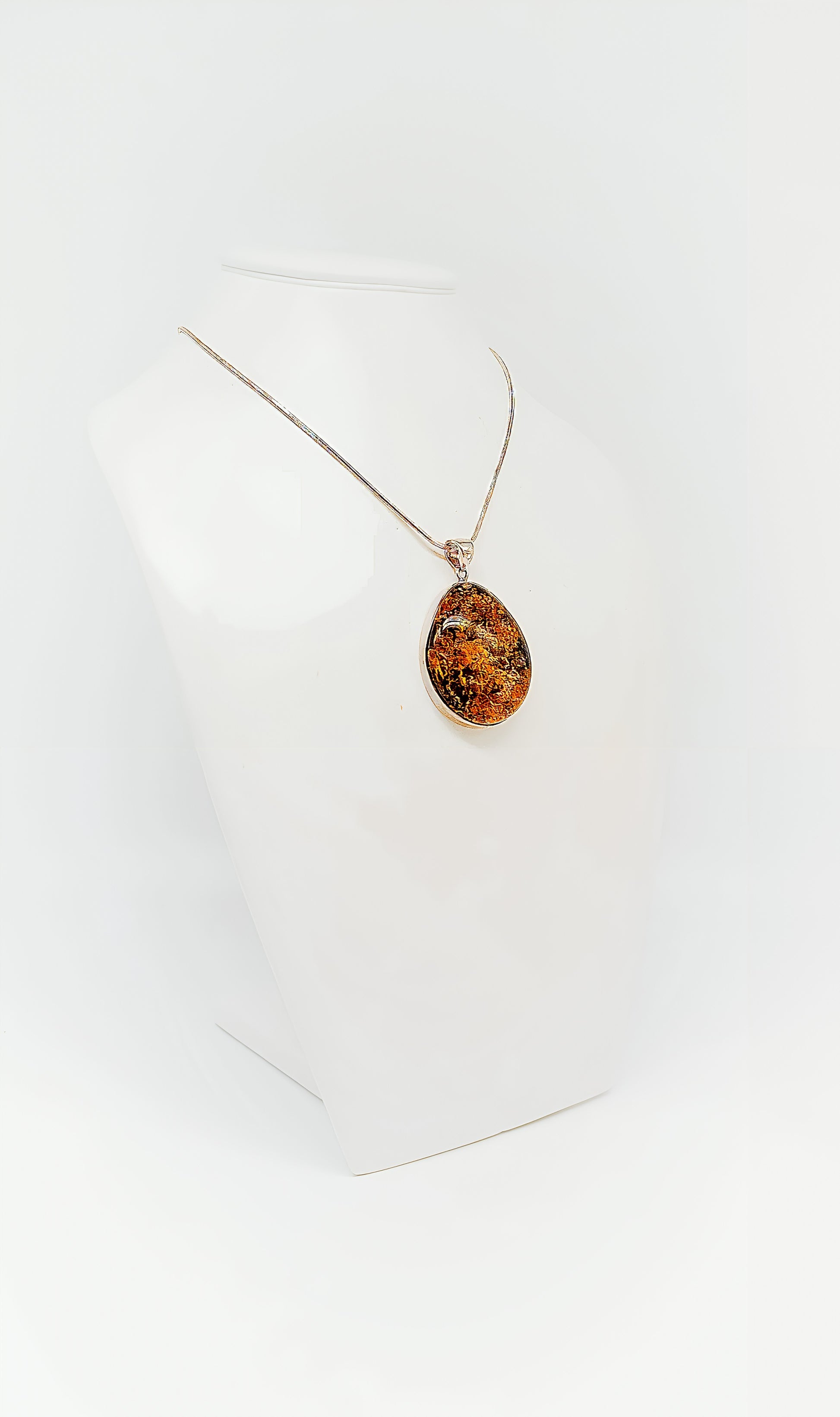 This pendant combines the natural beauty of amber with the elegance of 925 sterling silver. Each pendant is unique, bringing a touch of nature to your jewelry box with its warm gold and brown tones. The amber, set in high-quality silver, draws all eyes and tells the story of millennia past. A perfect accessory for those who appreciate timeless elegance and individuality.