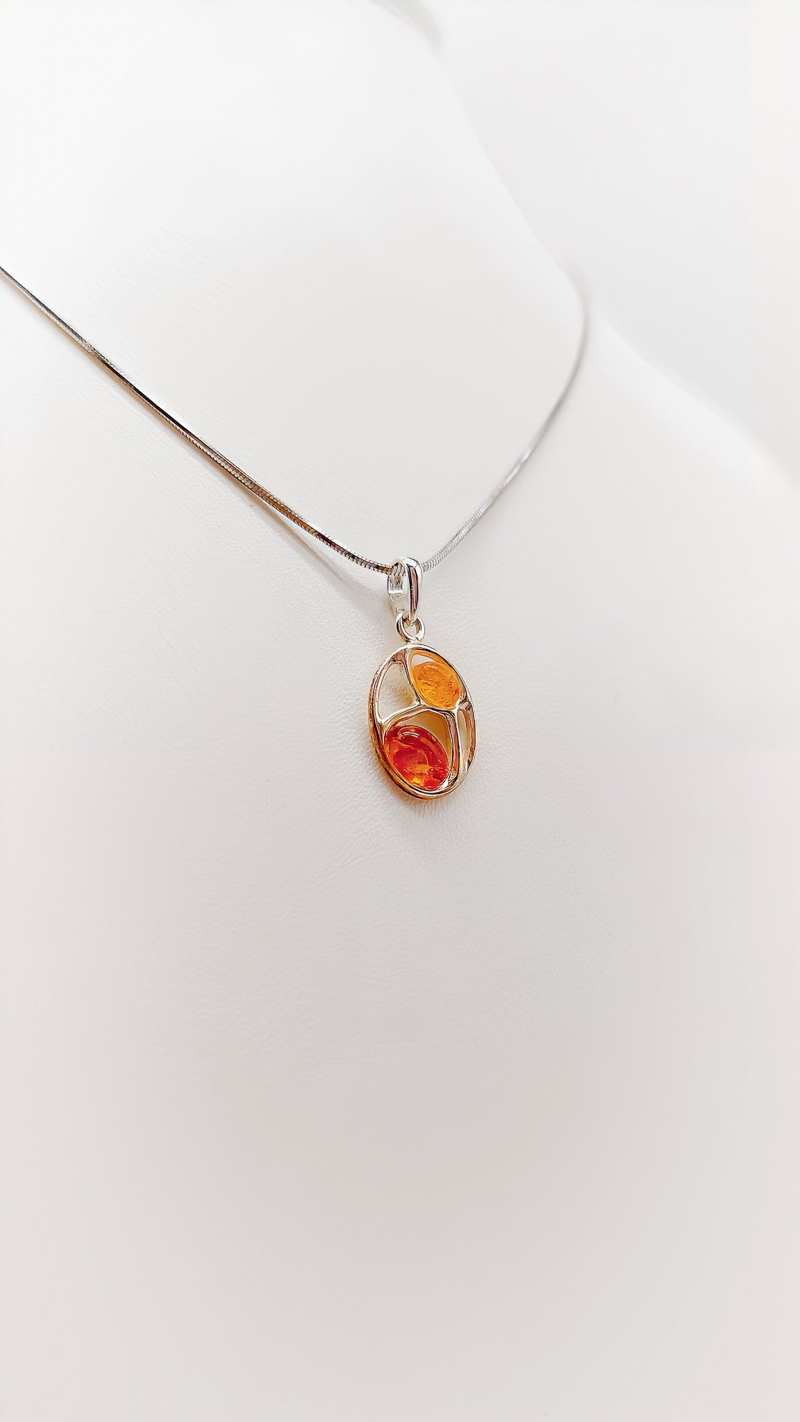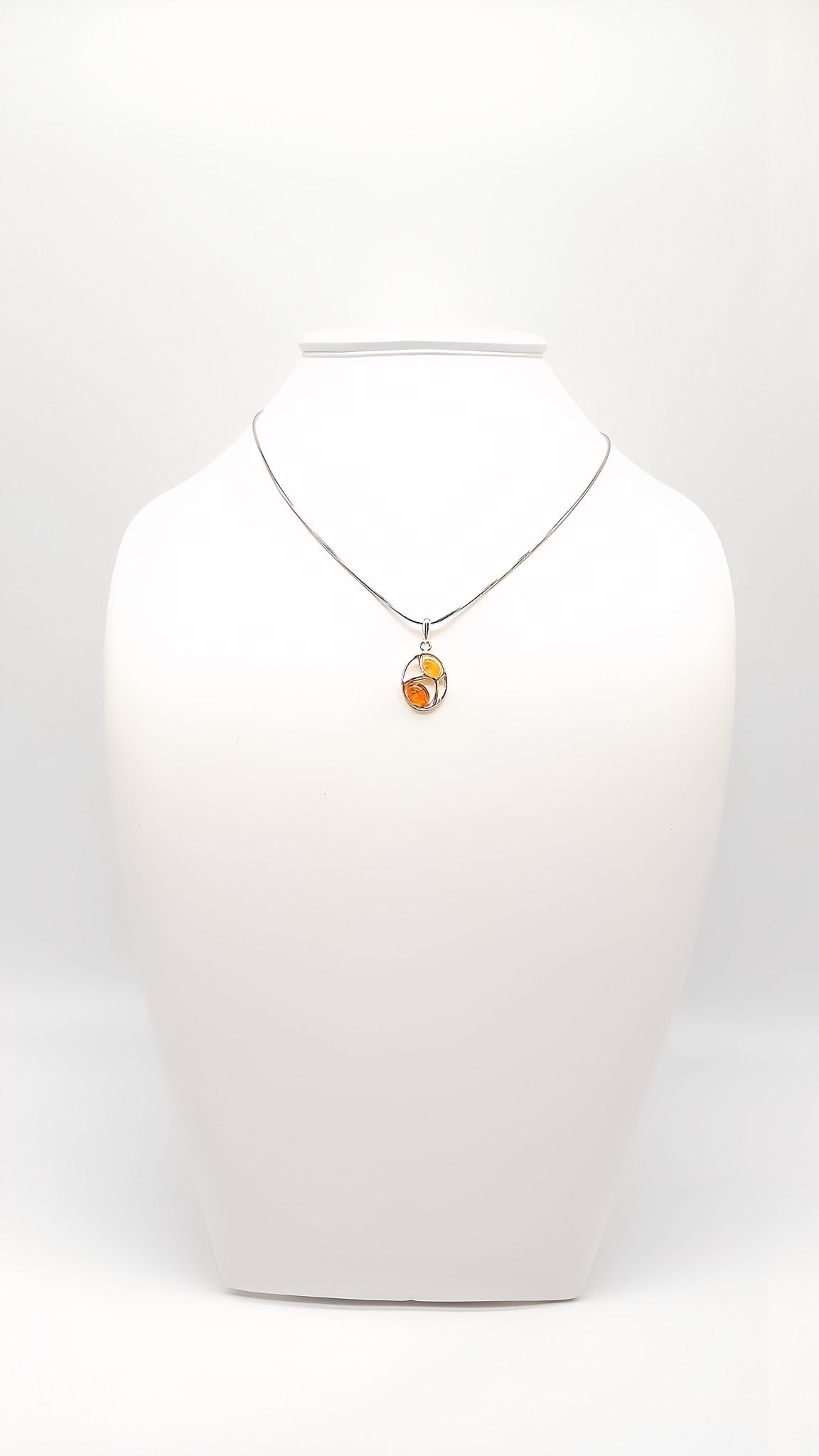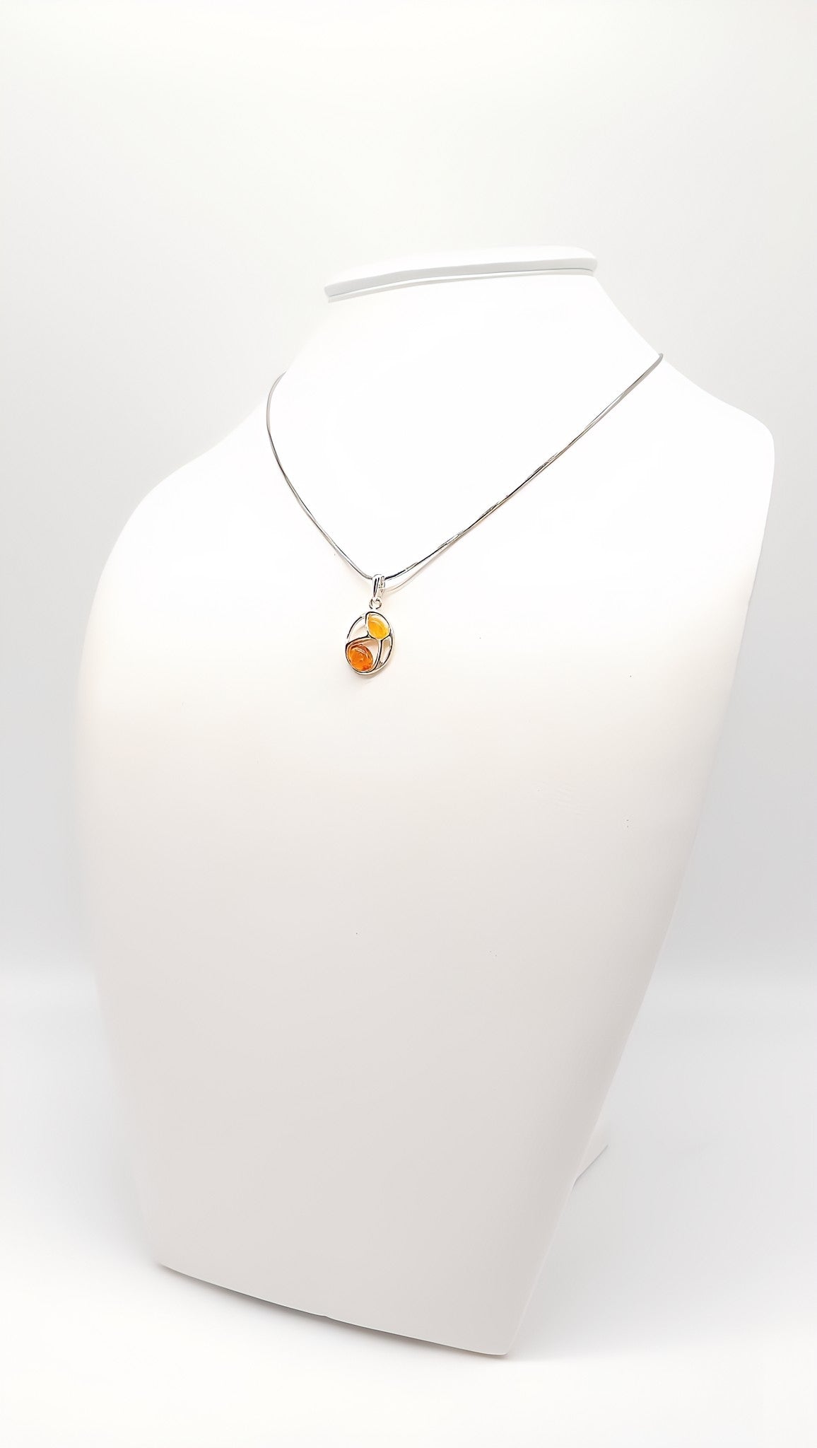 This unique pendant made of 925 sterling silver captivates with its harmonious design, perfectly combining two vibrant amber stones of contrasting colors. The elegant silver setting beautifully showcases the warm radiance of the amber, lending the piece a timeless elegance. Whether as an everyday accessory or as a special highlight for special occasions, this pendant combines classic beauty with modern design.
