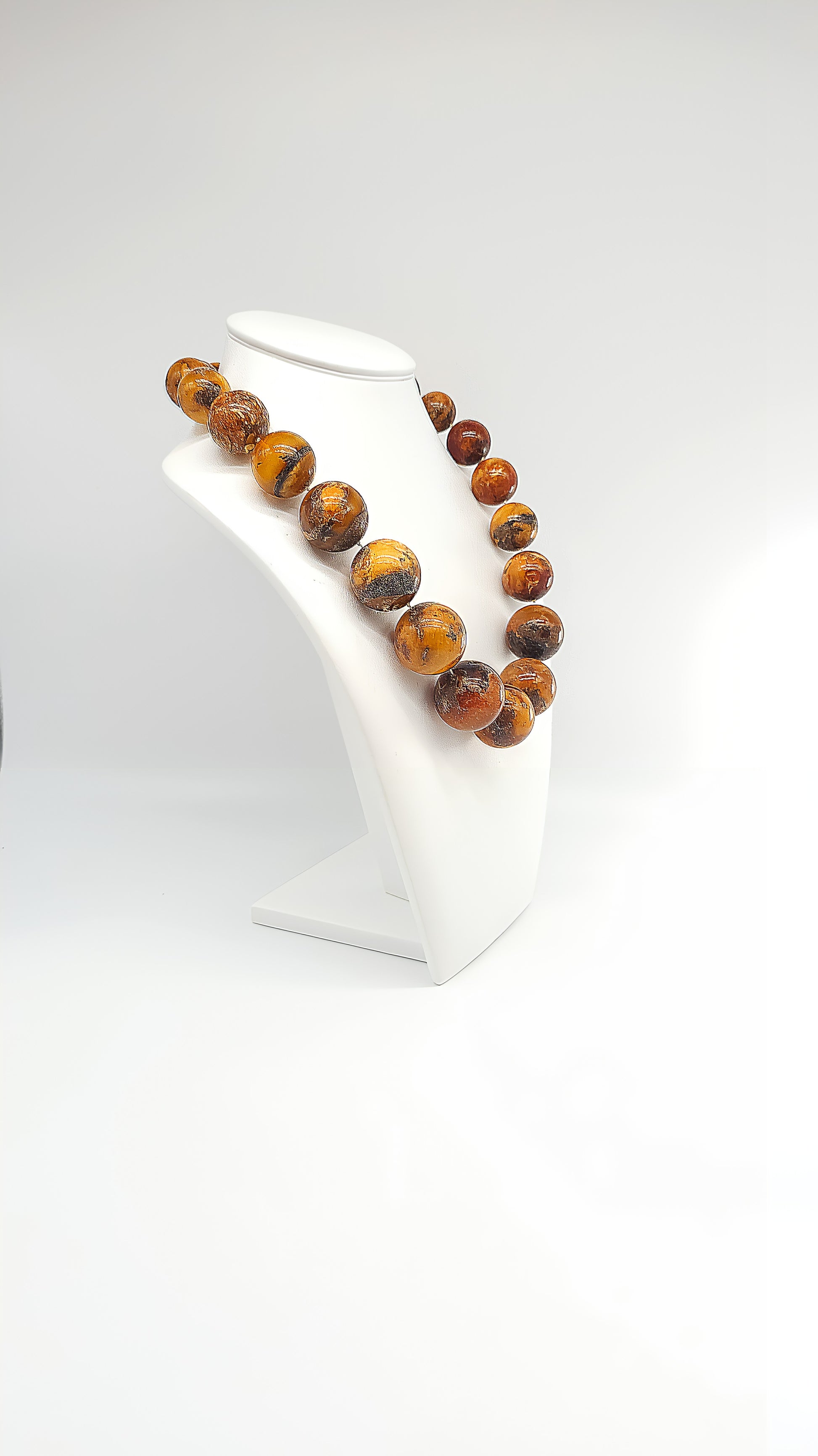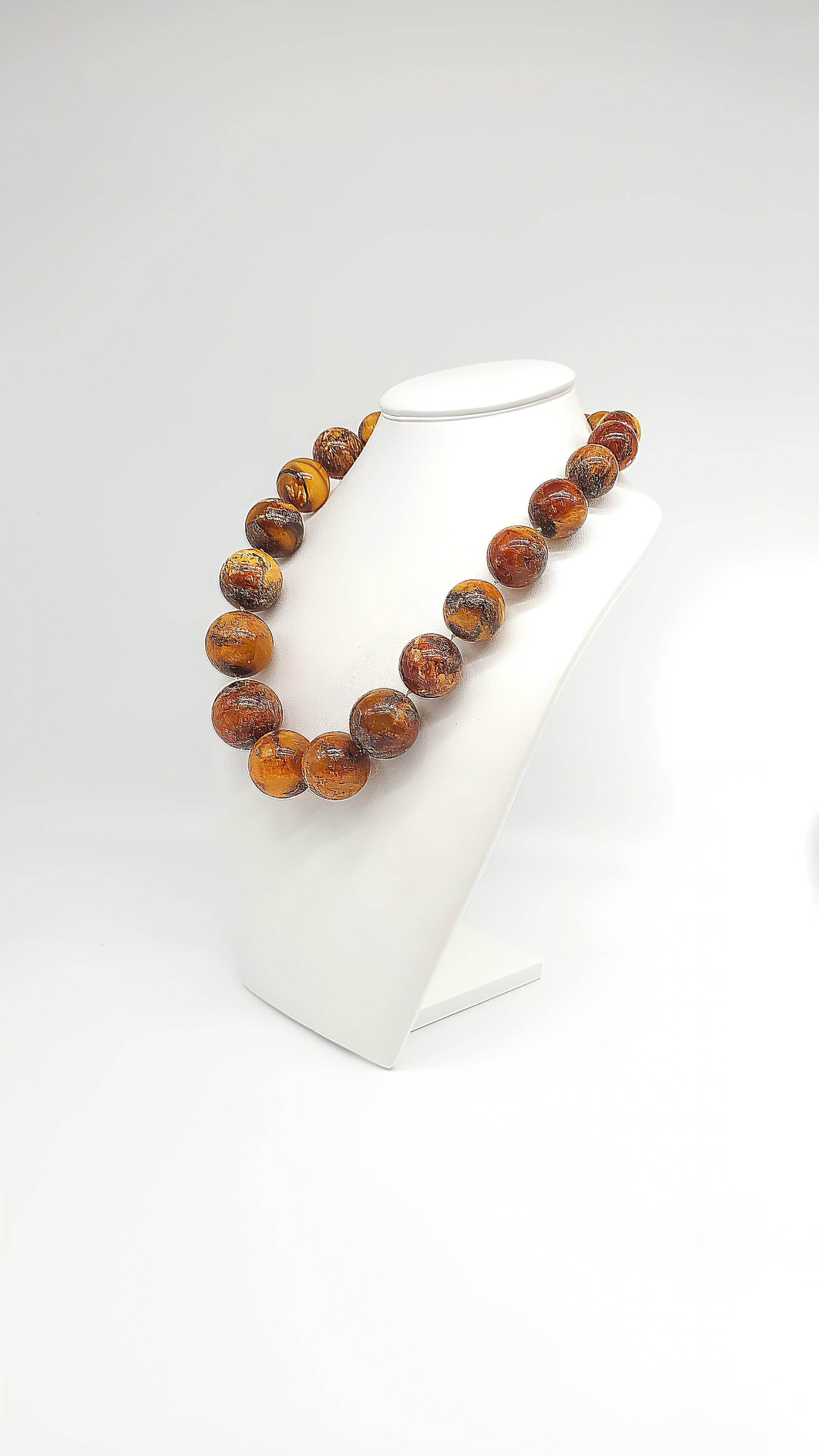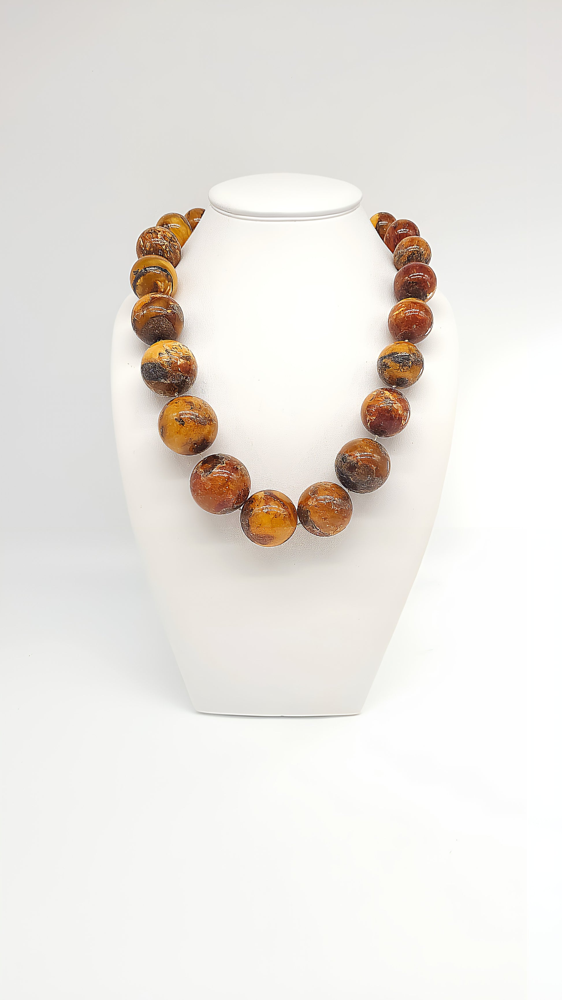 This extraordinary necklace made of genuine amber is truly unique, captivating with its powerful and natural radiance. The large, polished amber beads vary in warm tones from golden brown to honey yellow, lending the necklace a unique character. Each individual bead tells its own story, making this piece a special highlight for anyone who loves authentic and stylish jewelry. This necklace is not only an expression of natural beauty, but also a timeless accessory that perfectly combines elegance and a connection to nature.