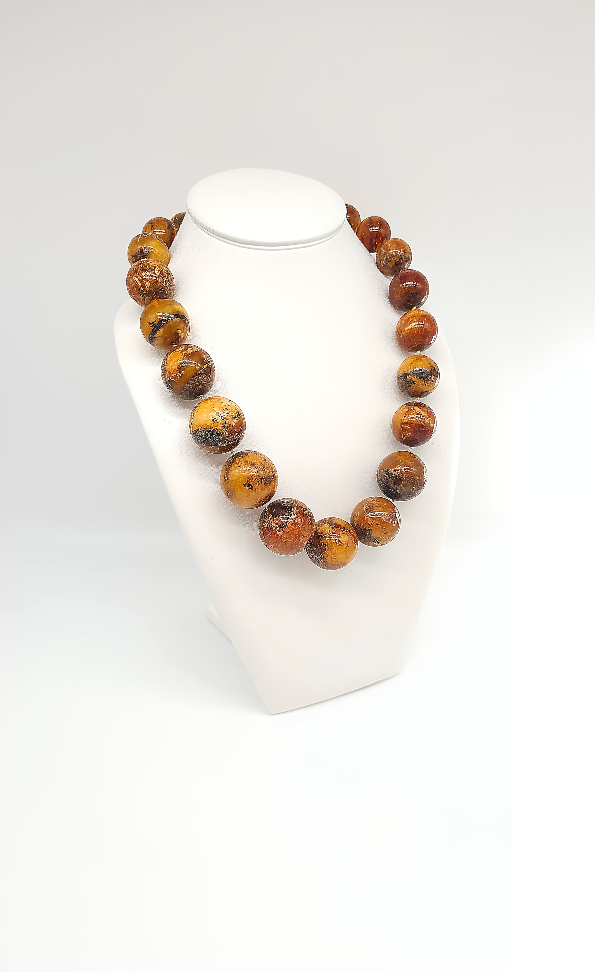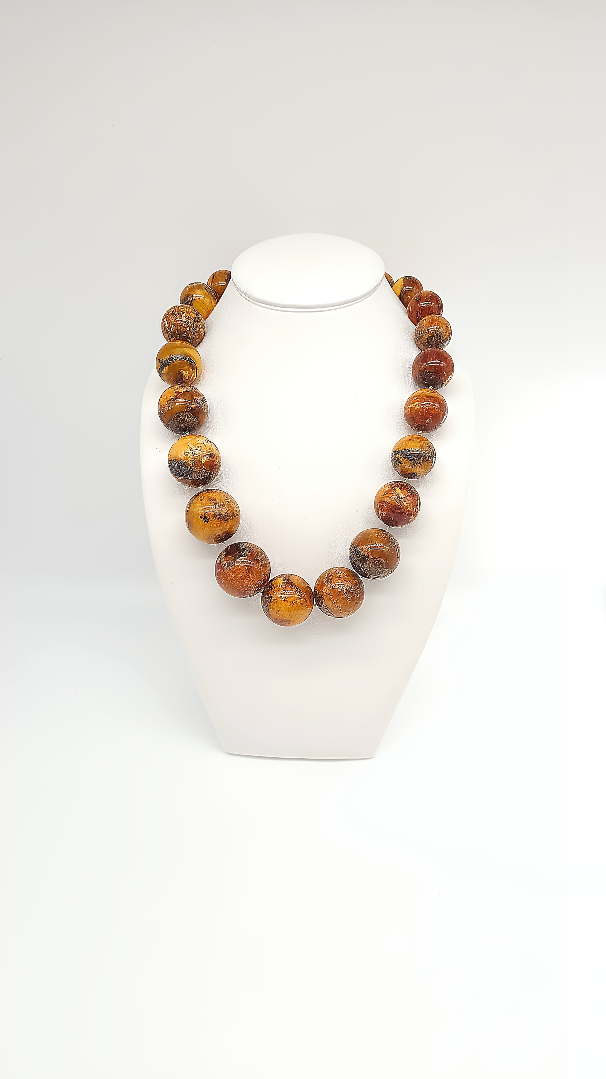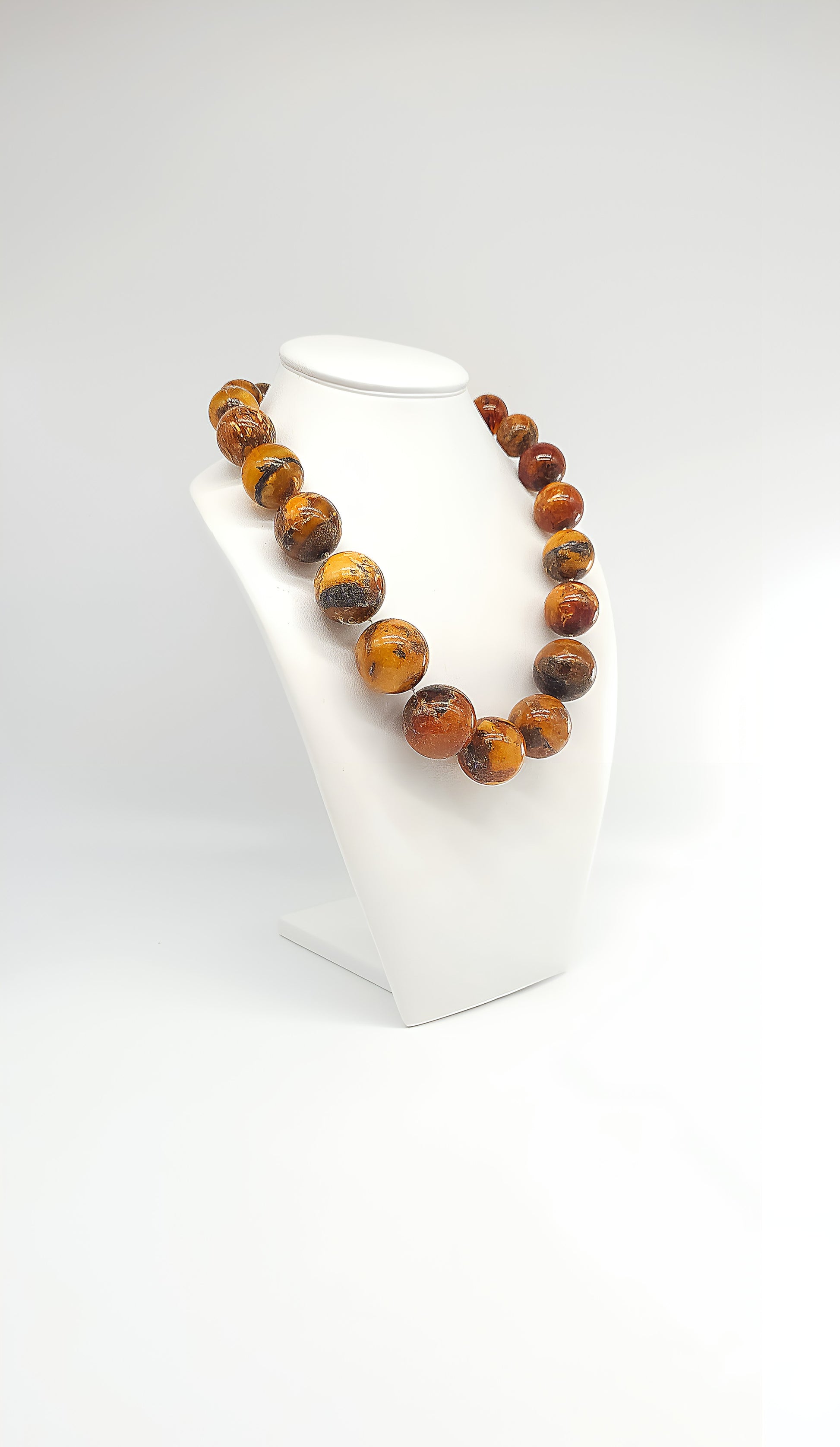 This extraordinary necklace made of genuine amber is truly unique, captivating with its powerful and natural radiance. The large, polished amber beads vary in warm tones from golden brown to honey yellow, lending the necklace a unique character. Each individual bead tells its own story, making this piece a special highlight for anyone who loves authentic and stylish jewelry. This necklace is not only an expression of natural beauty, but also a timeless accessory that perfectly combines elegance and a connection to nature.