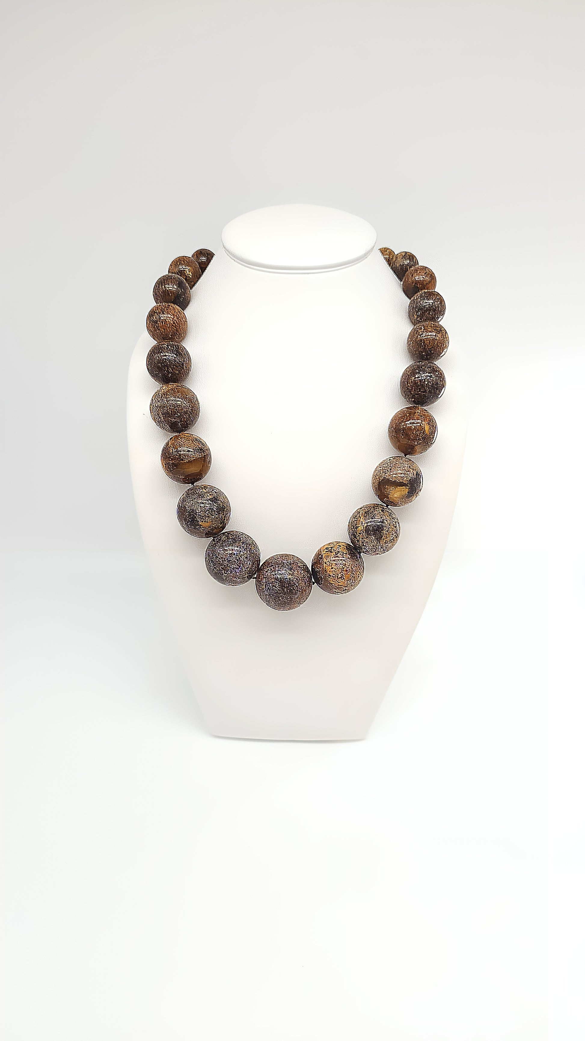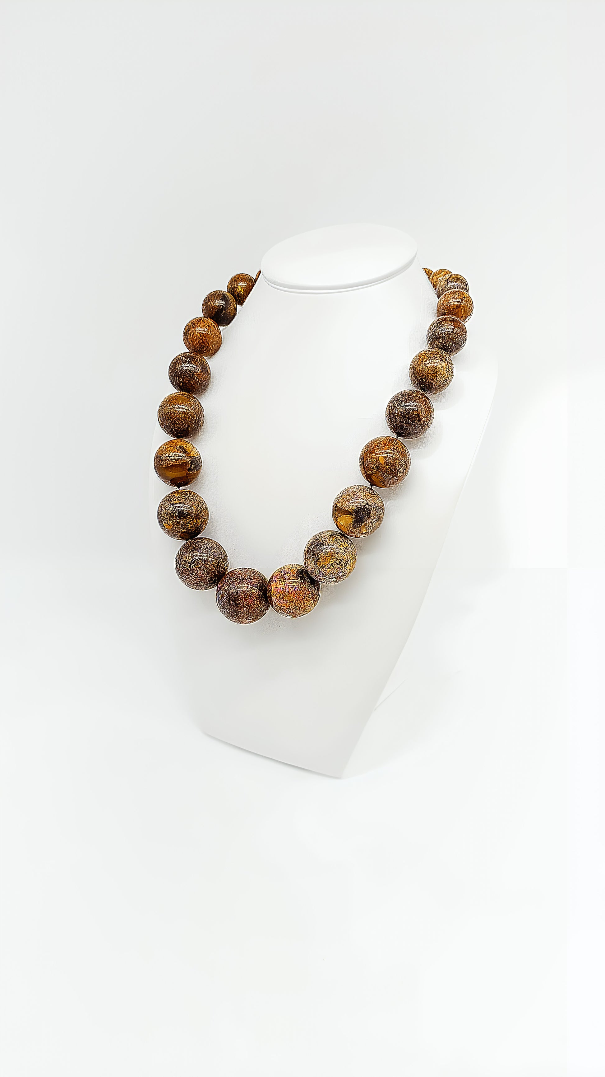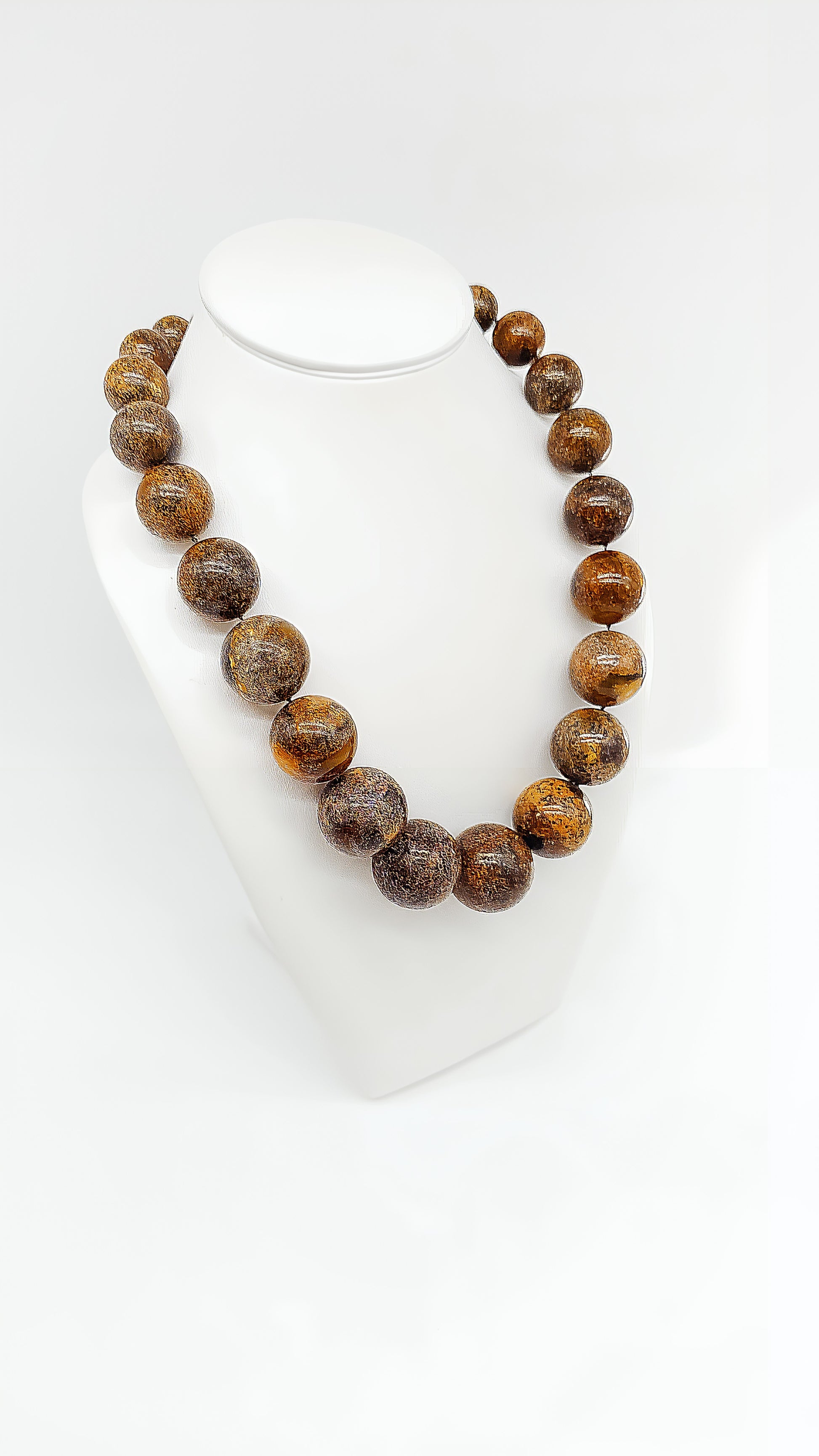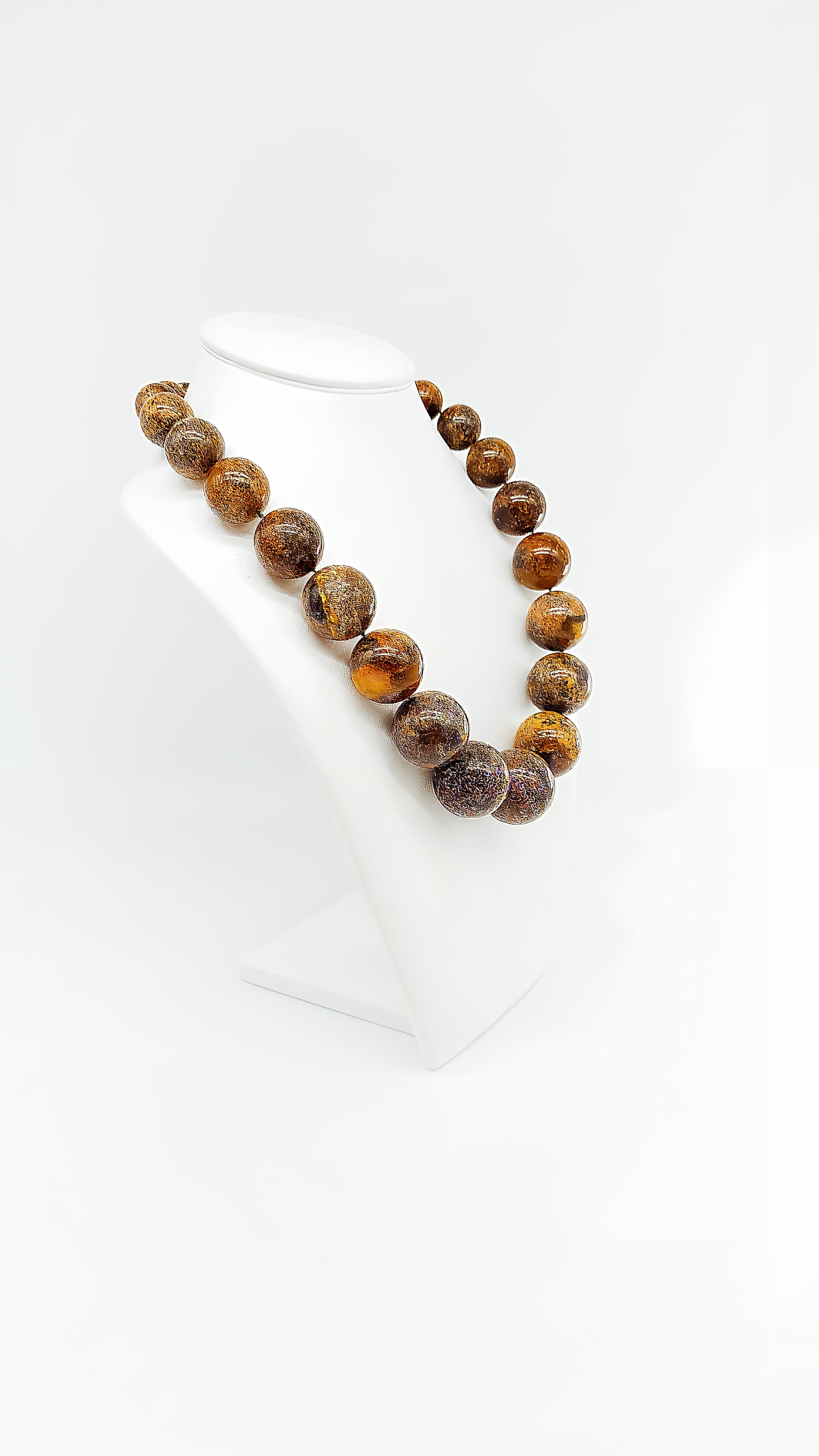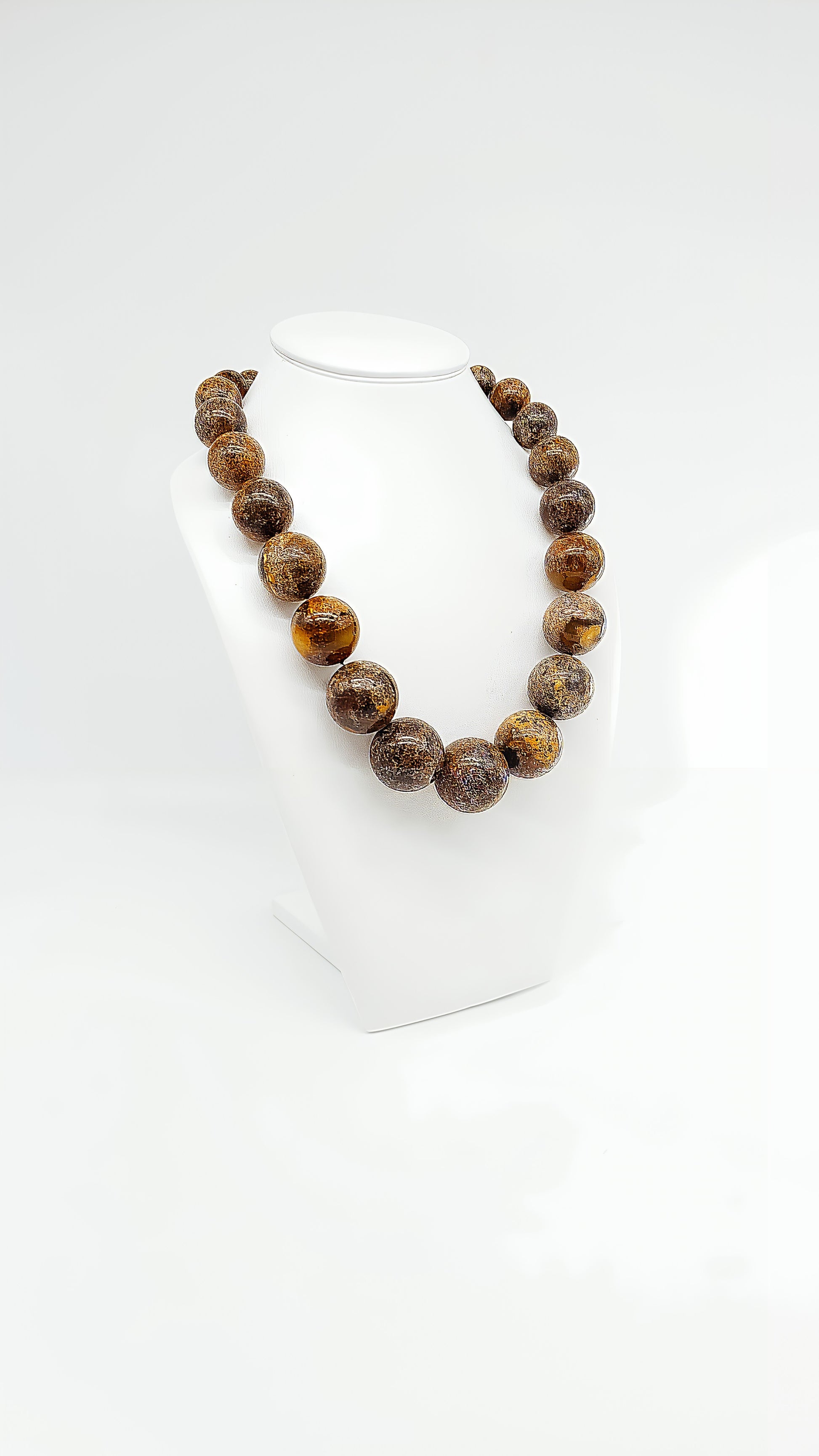 This stunning amber necklace is unique and captivates with its deep, dark hues. The large, round amber beads vary in texture and color, giving each bead its own unique character. The necklace exudes rustic elegance and is the perfect piece of jewelry for those with a penchant for natural, untamed beauty. This amber necklace is an expression of timeless mystique and can be worn stylishly both everyday and on special occasions.