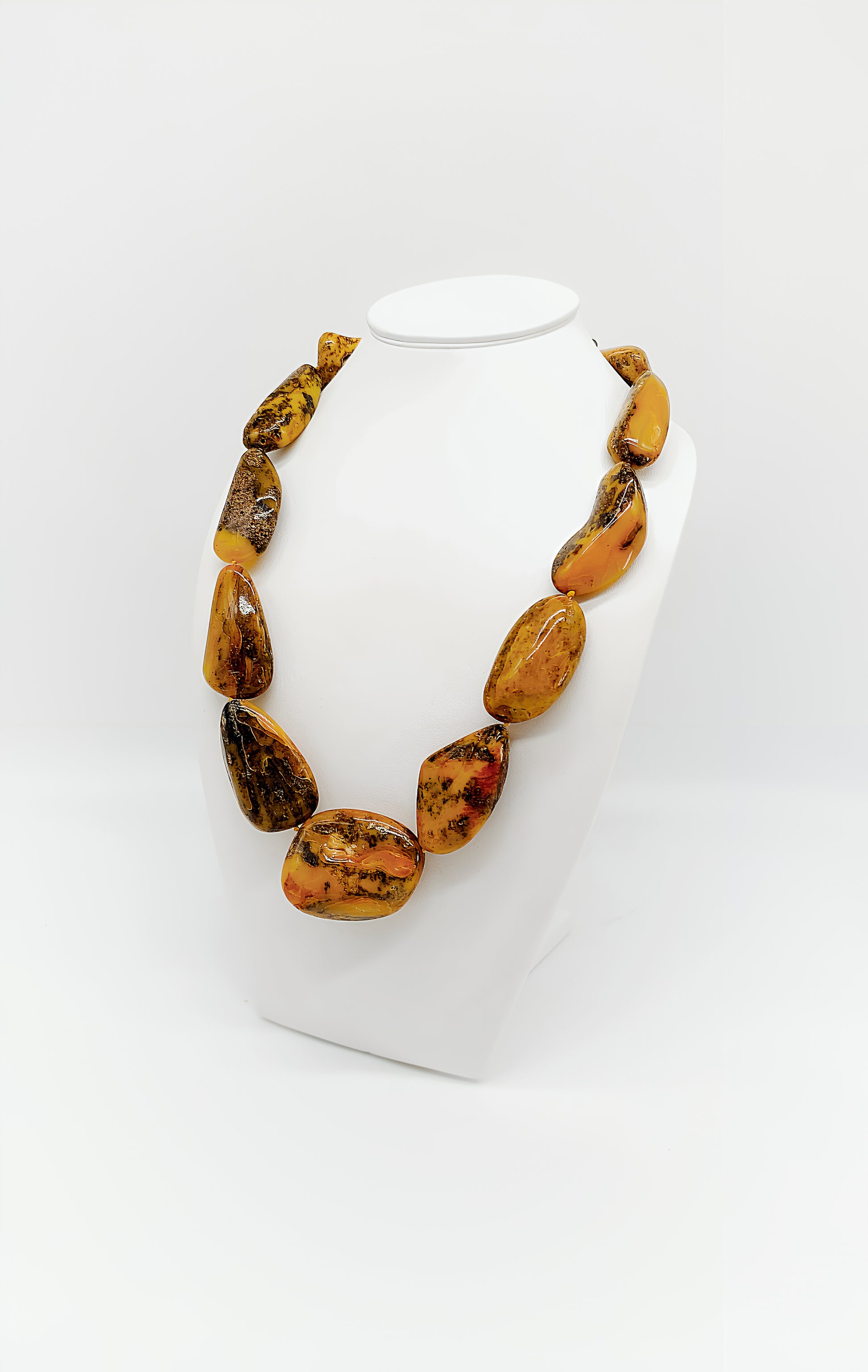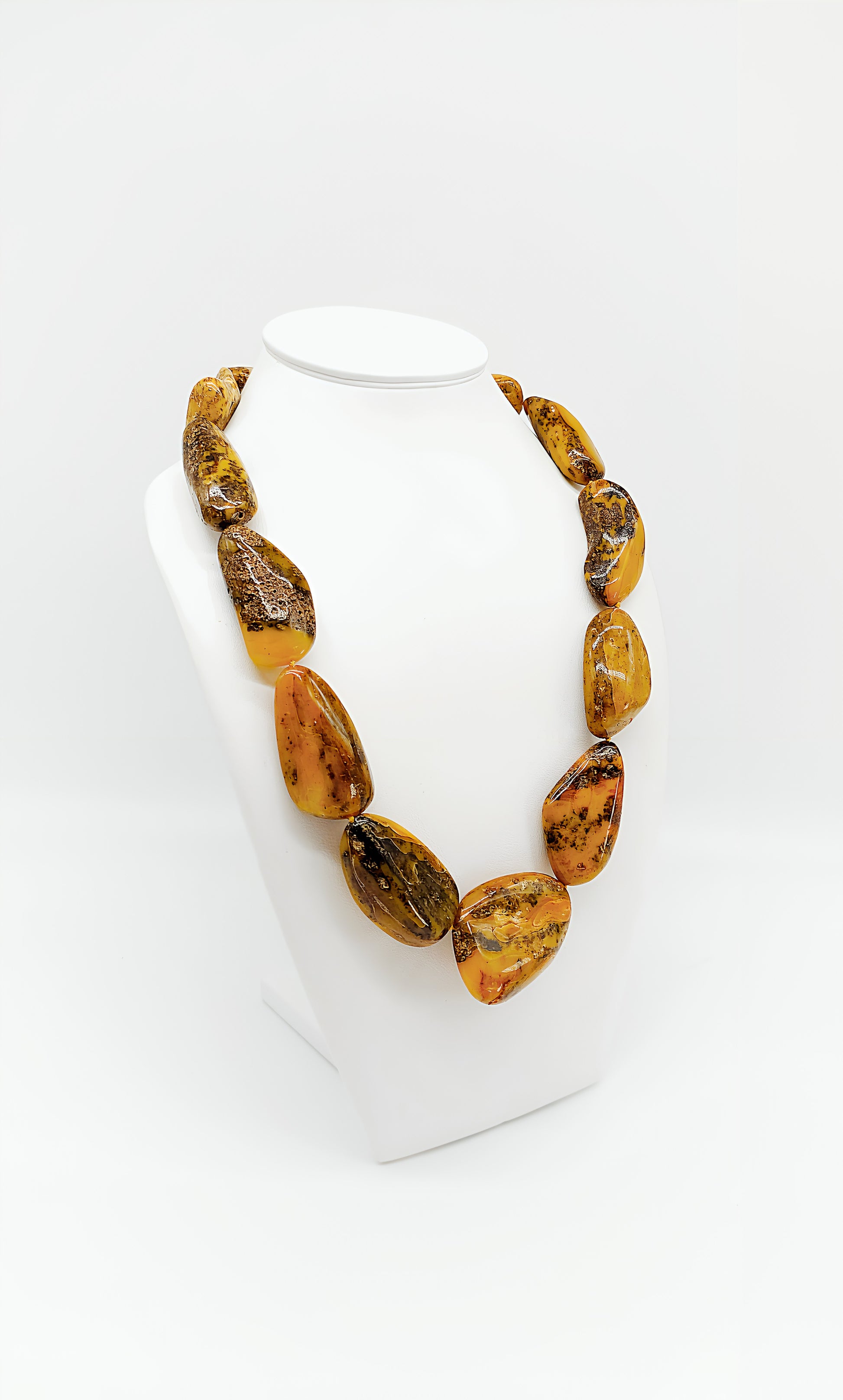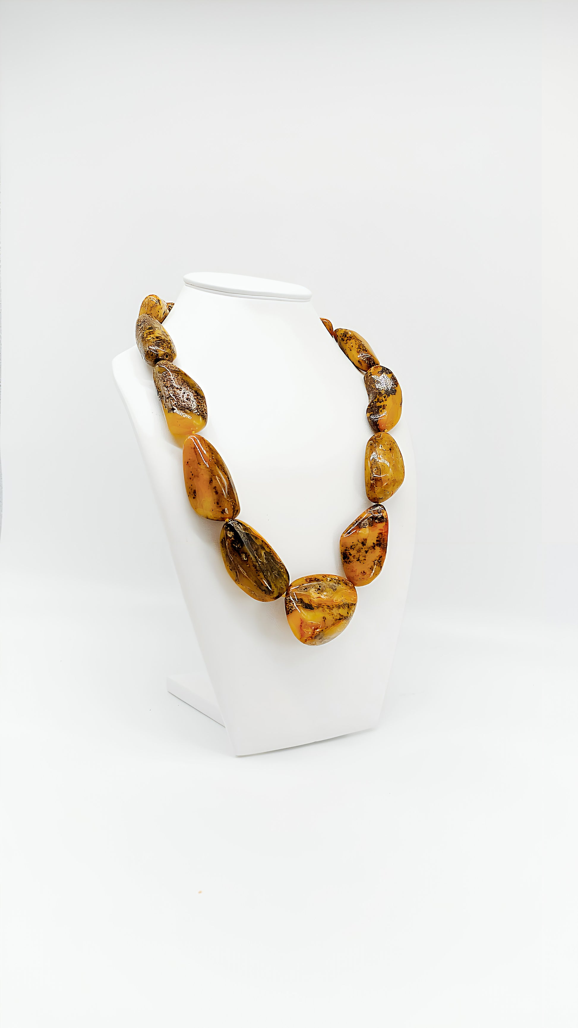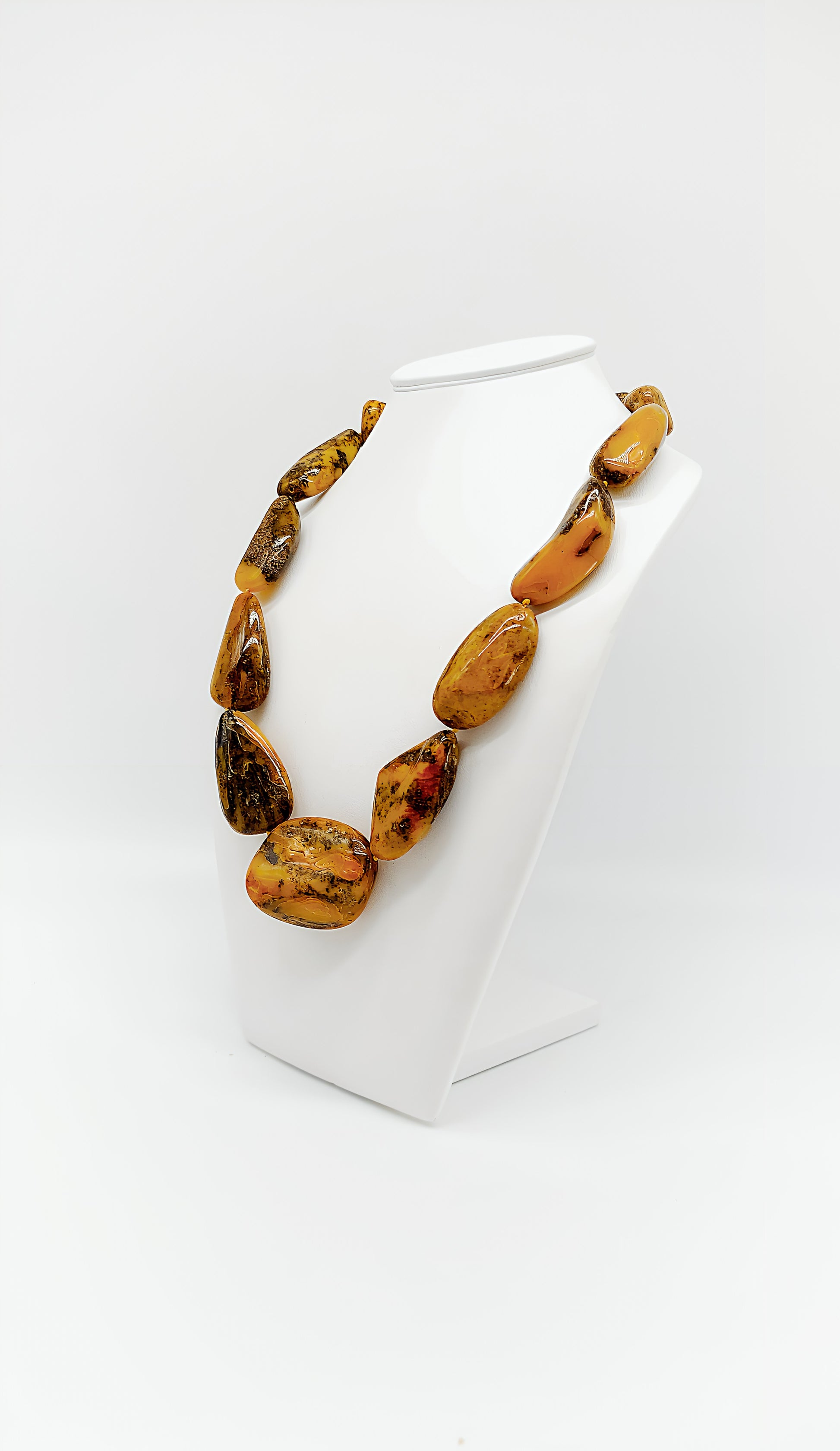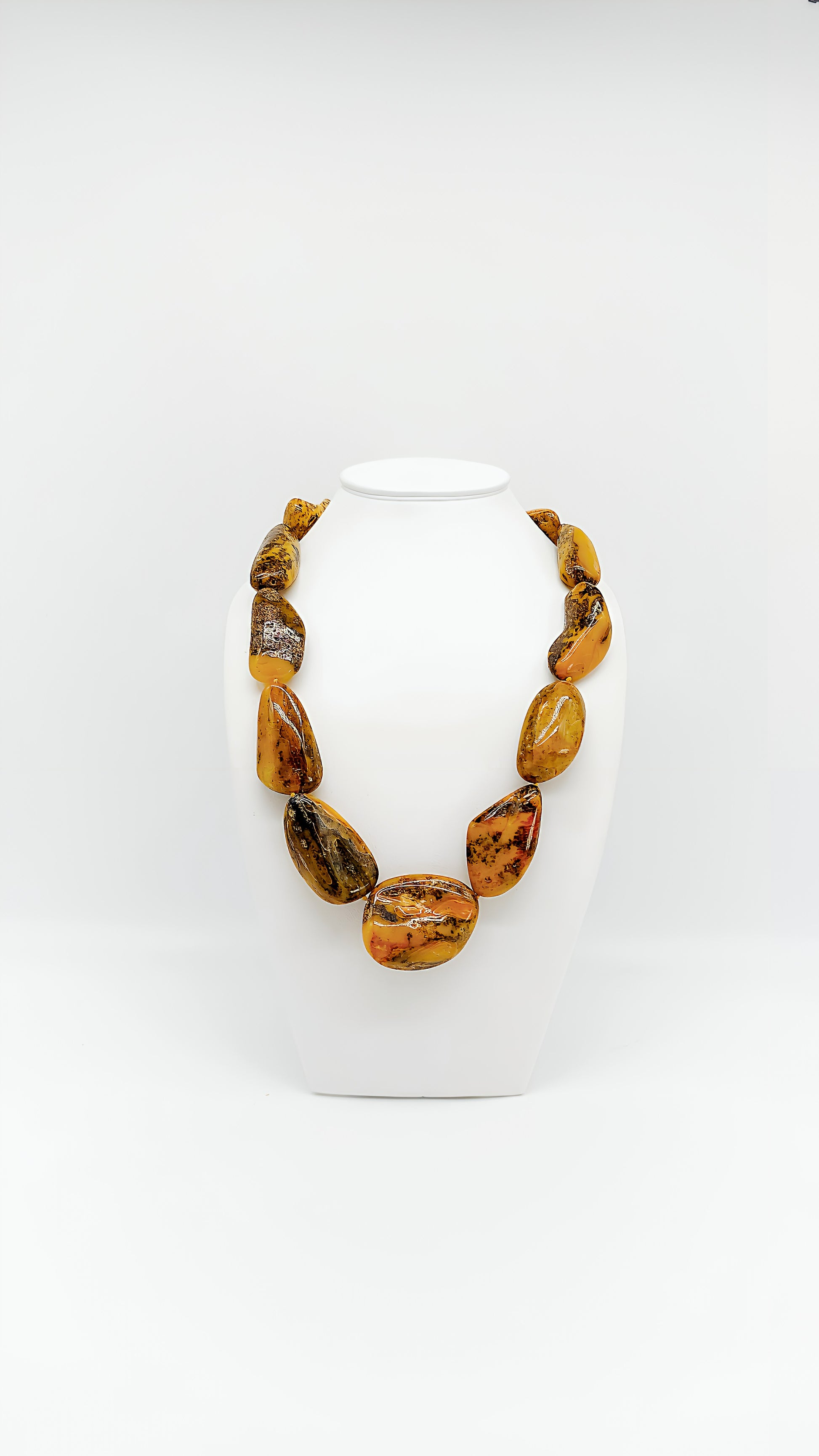 This impressive amber necklace is truly unique. With its natural shapes and warm, earthy colors, it evokes untouched nature. Each stone on this necklace is unique and tells its own story through its patterns and color gradients. The intense color play of golden, brown, and honey tones gives the necklace a particularly luxurious and natural charm. An absolute eye-catcher for lovers of exclusive, handcrafted jewelry who value individuality and natural elegance.