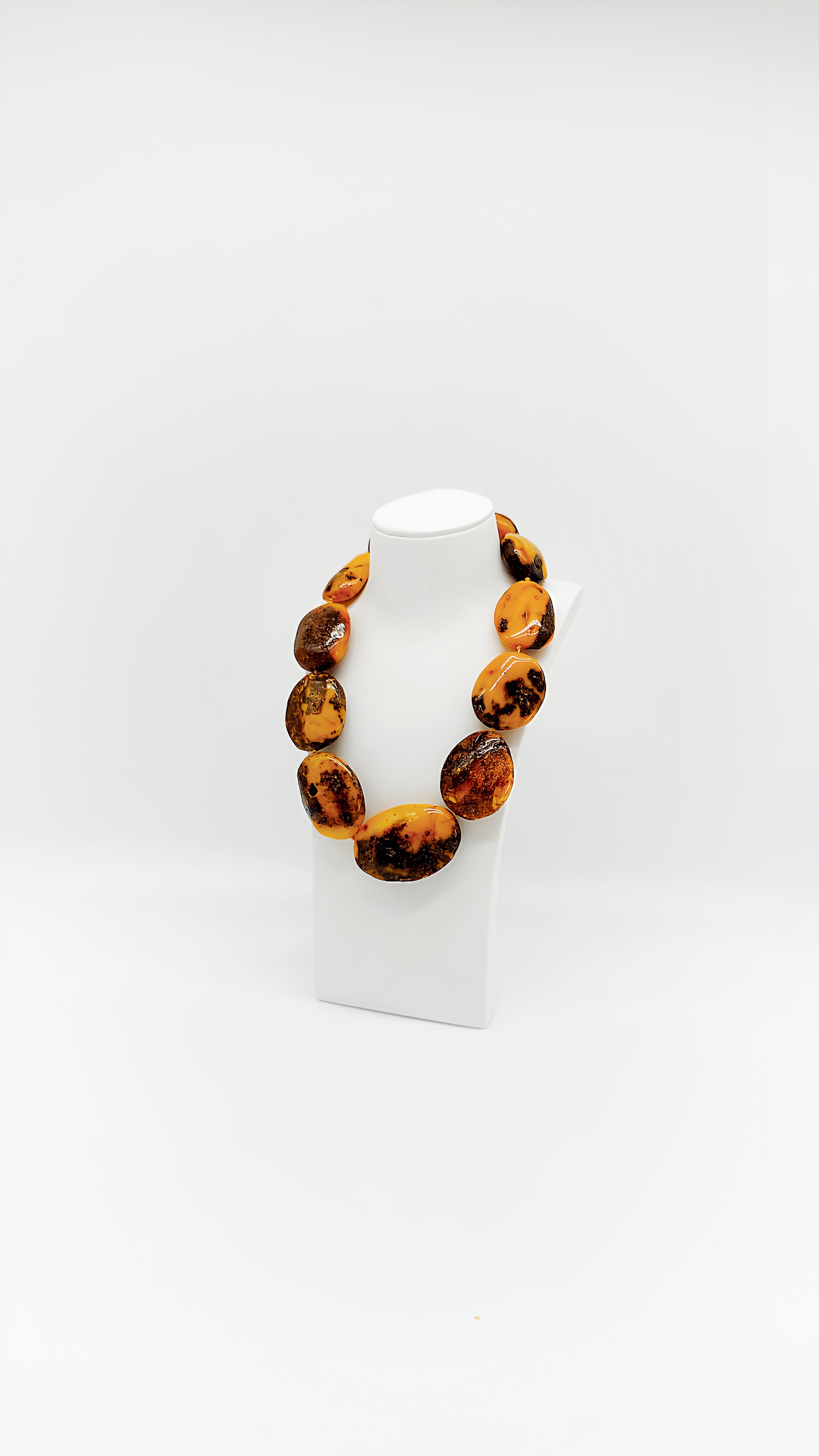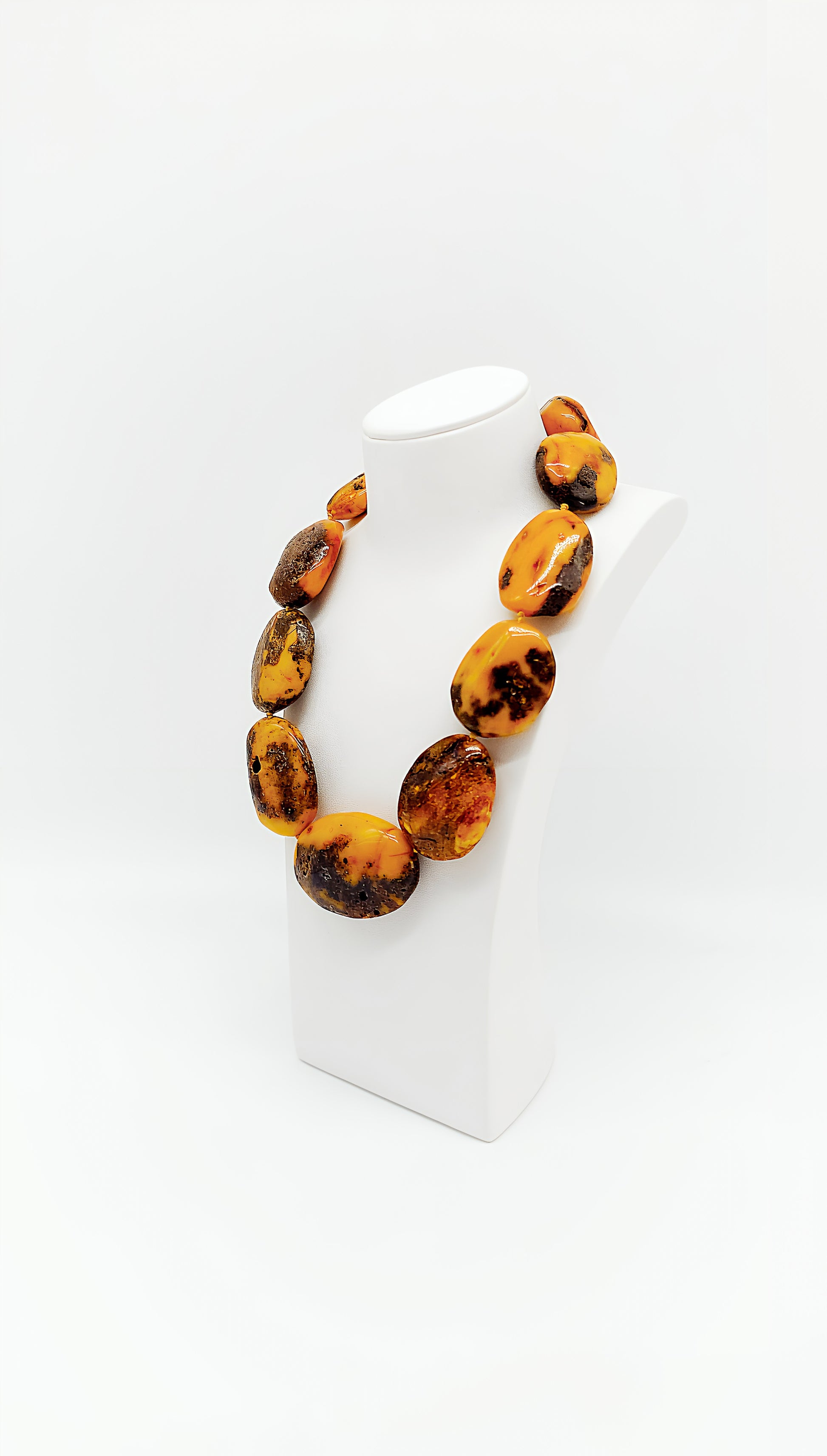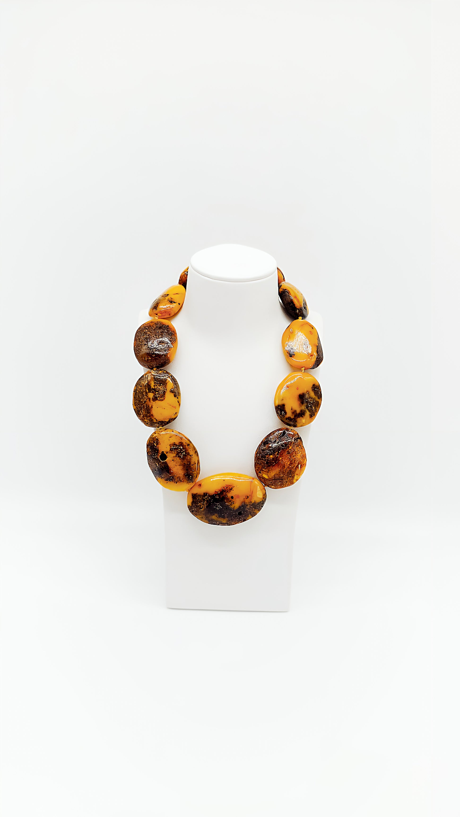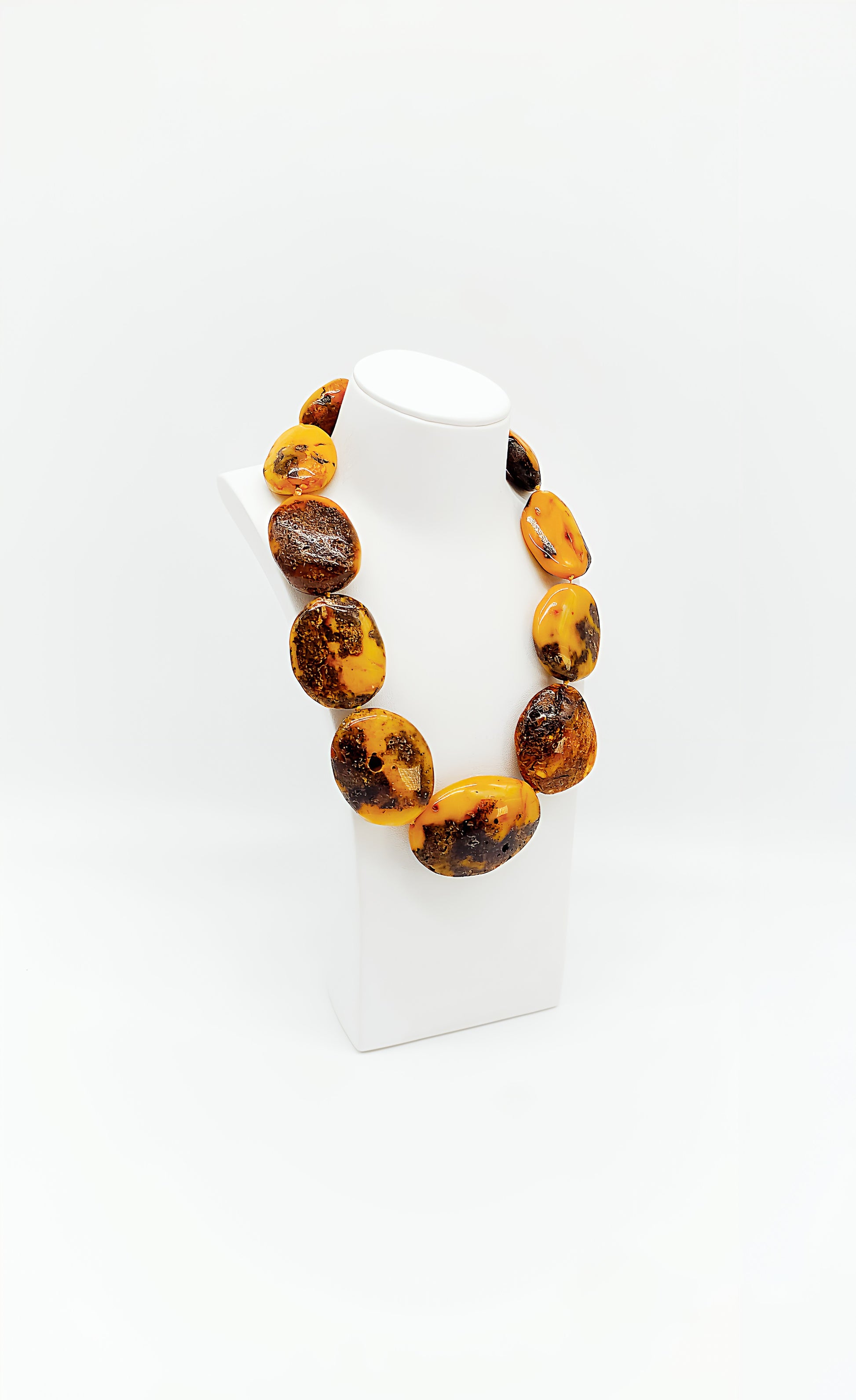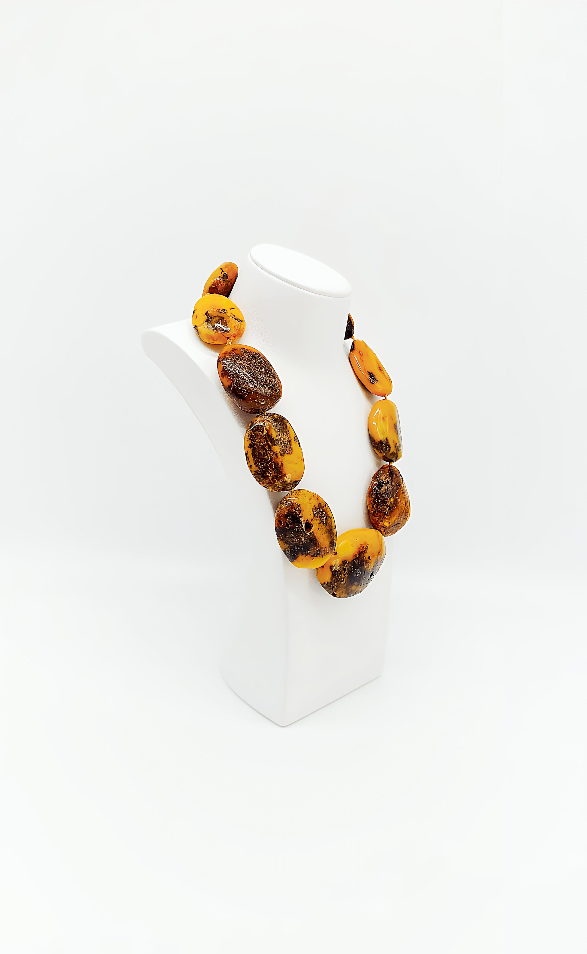This stunning amber necklace is truly unique, showcasing the beauty and versatility of nature in a unique way. The oval amber stones glow in warm gold and earth tones and feature unique natural inclusions, making each piece a work of art. This handcrafted piece of jewelry exudes a powerful elegance that enhances any look. It's perfect for women who value exclusivity and individuality and want to adorn themselves with an exceptional accessory.