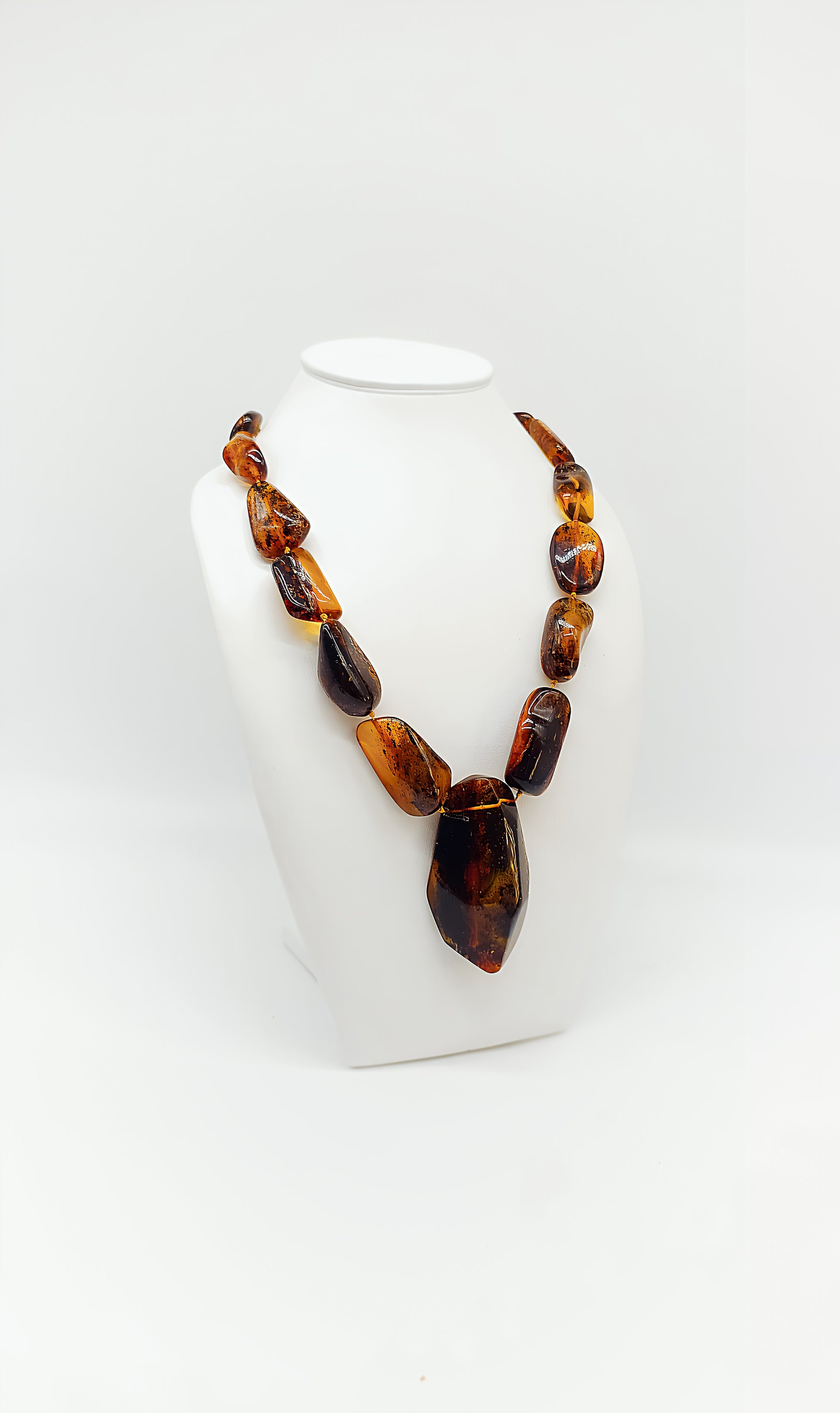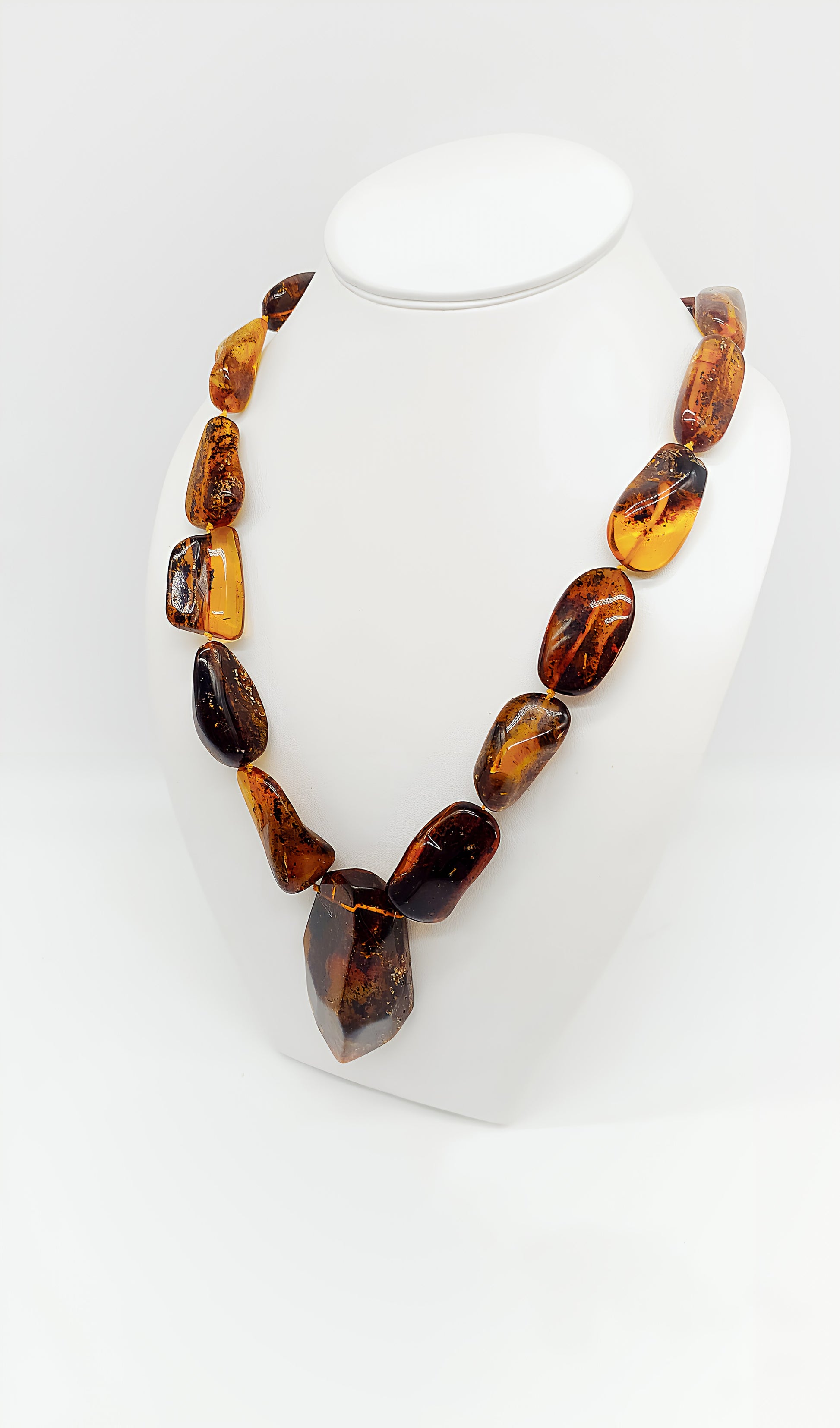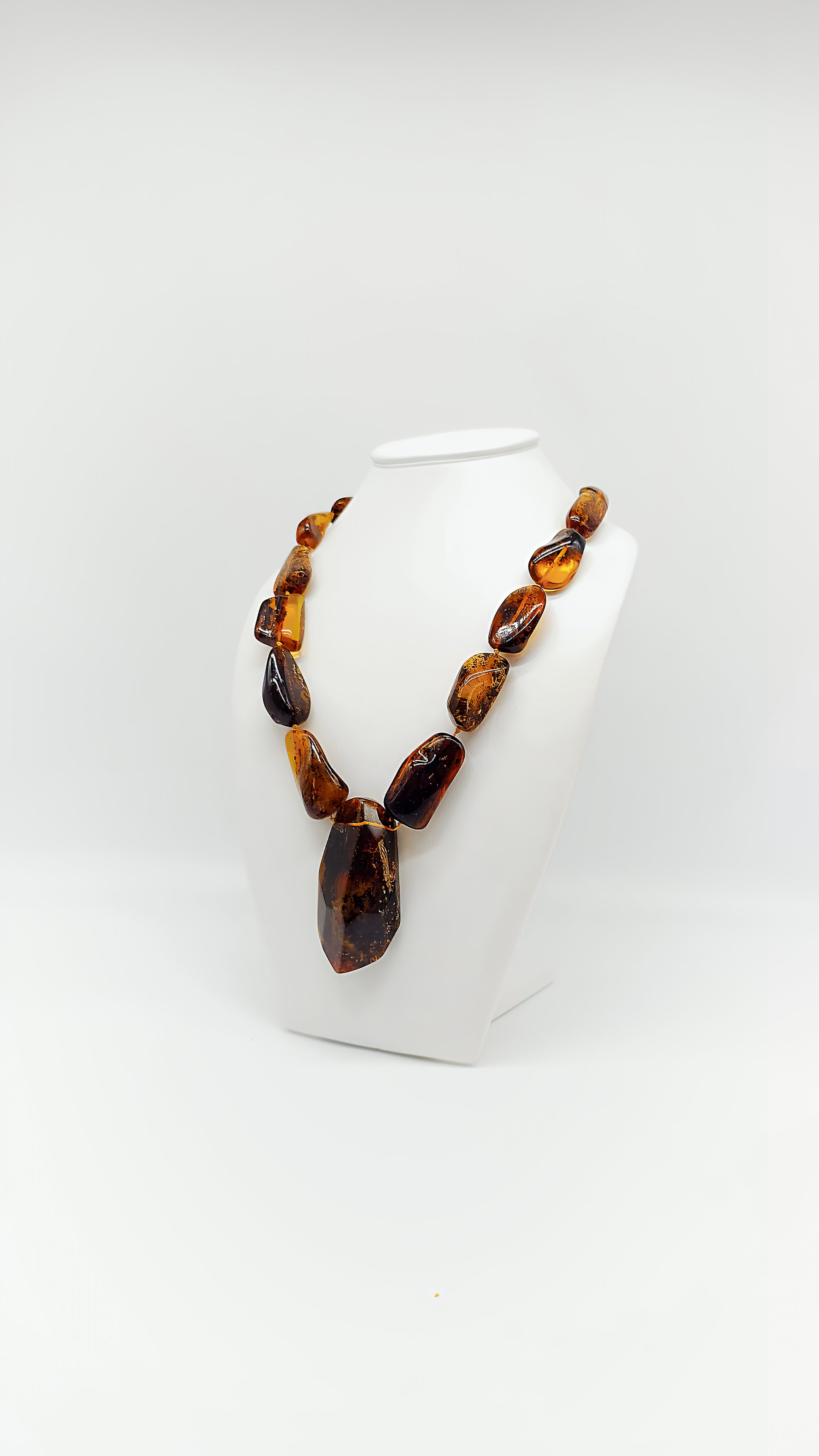 This unique, handcrafted amber piece is a true masterpiece of nature. With its warm, deep brown tones and the organic shapes of the individual stones, this necklace is a fascinating piece of jewelry that captivates with its natural elegance. The central stone, with its striking shape, lends the necklace a powerful yet graceful aura. Each stone tells its own story, making this piece truly unique—perfect for those who value exclusivity and a connection to nature.