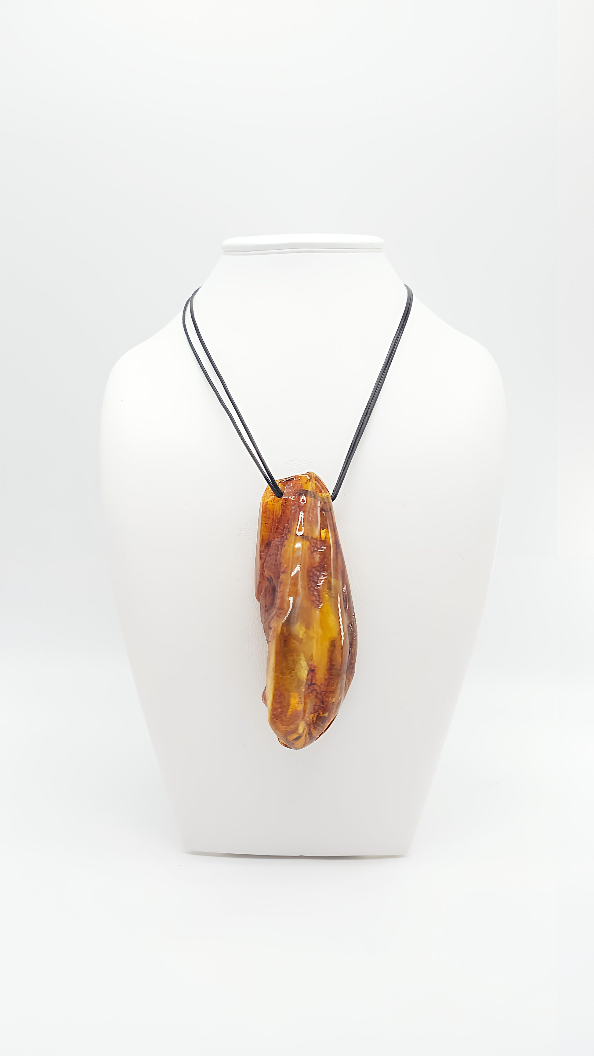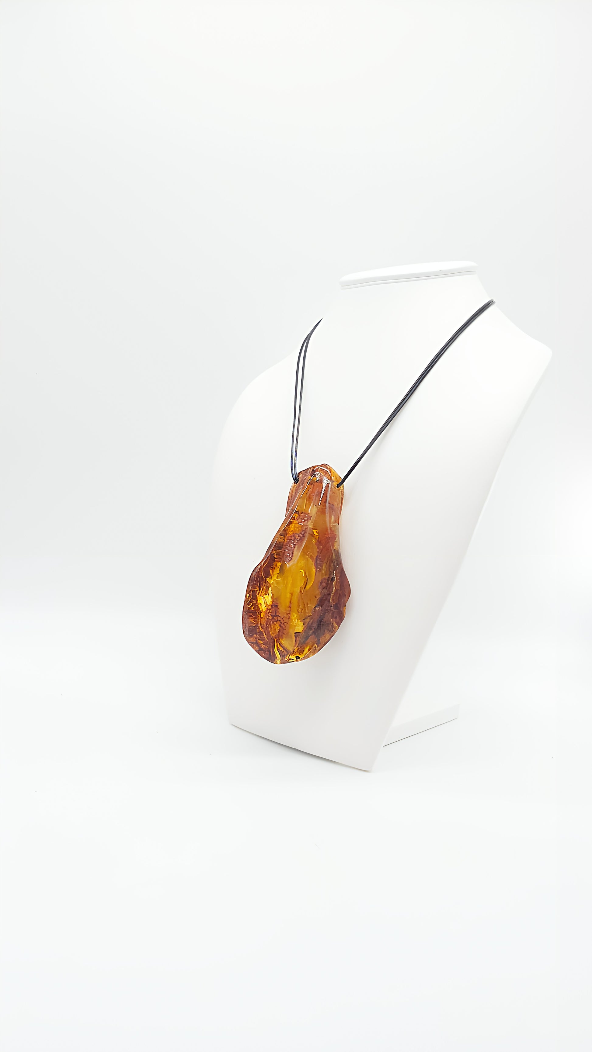 This unique amber pendant is a true work of art from nature. With its unpolished, raw form and intense color palette, this pendant showcases the beauty of amber in its purest and most natural form. Each pendant is unique and brings the warm, golden glow of amber directly into your everyday life. Worn on a simple cord, the stone's natural structure is particularly well-illustrated. Ideal for those who love individuality and a connection to nature.
