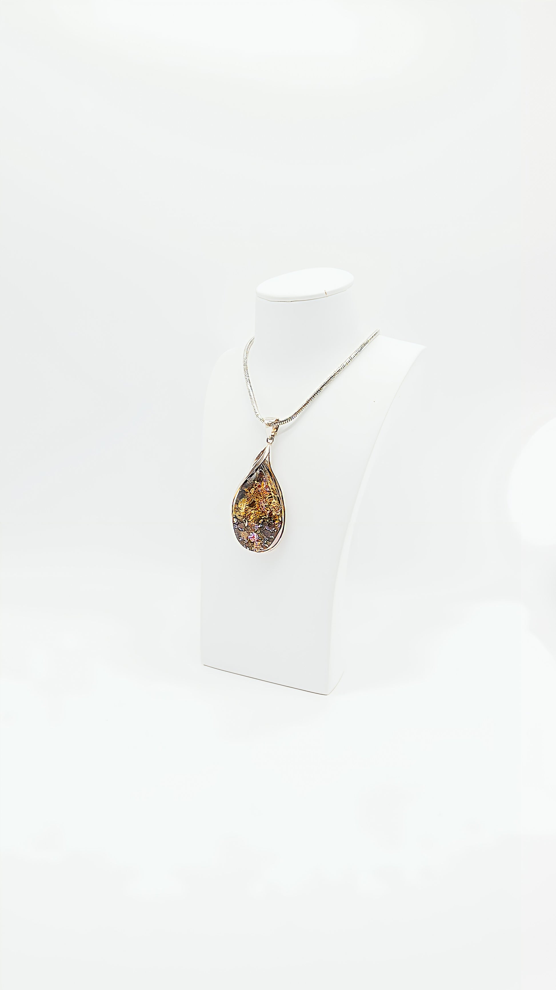 This drop-shaped pendant crafted from 925 sterling silver combines the natural beauty of amber with precious silver. The amber captivates with its golden inclusions and organic shape, while the curved silver setting lends the pendant a modern elegance. Each piece is unique and tells its own story. This extraordinary piece of jewelry is perfect for anyone who loves nature and design.