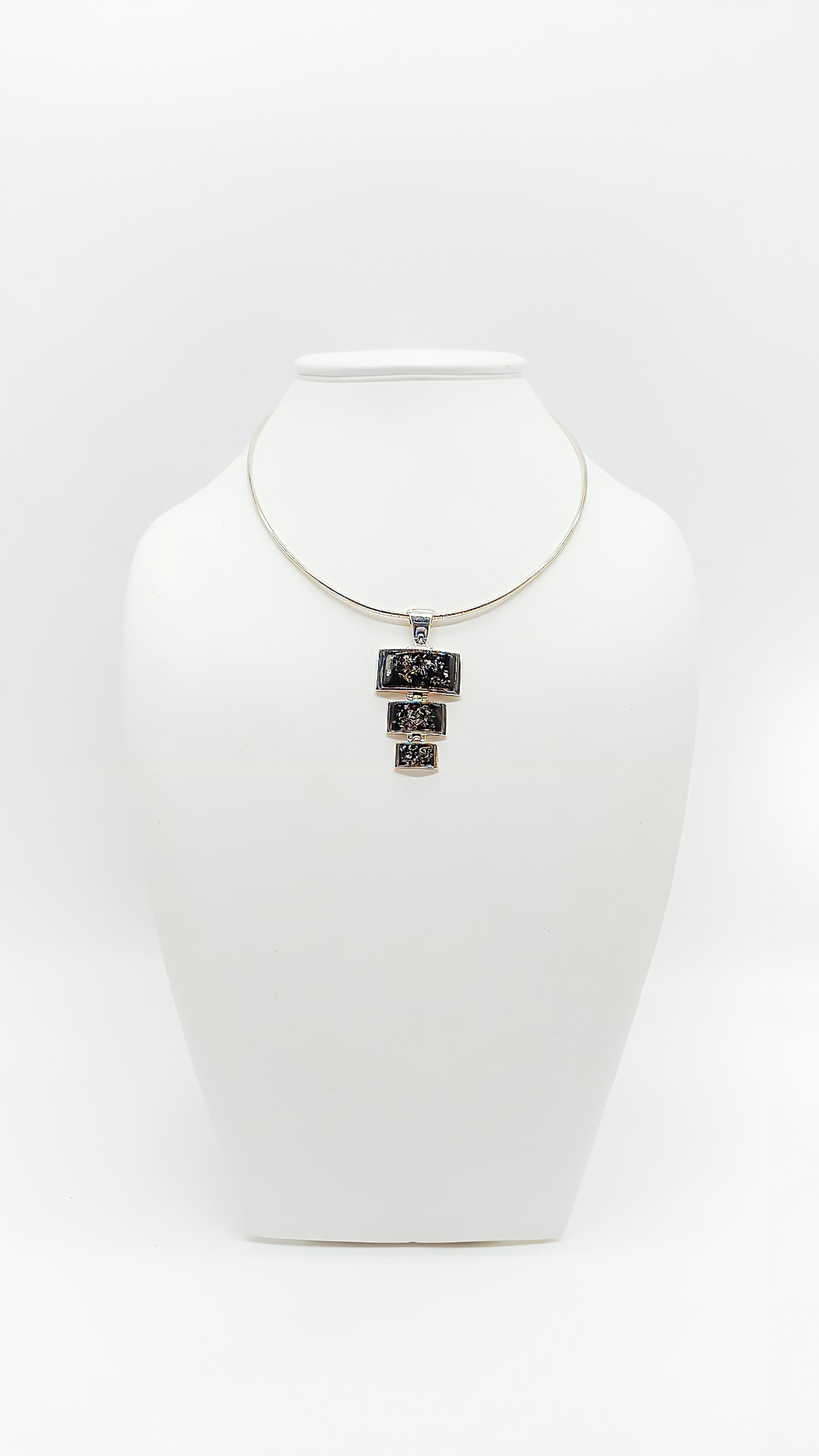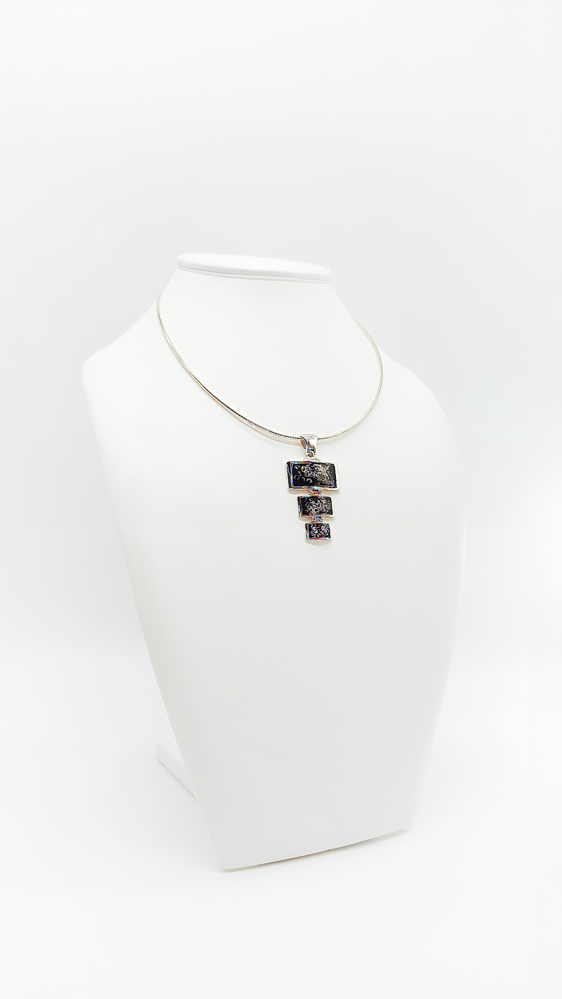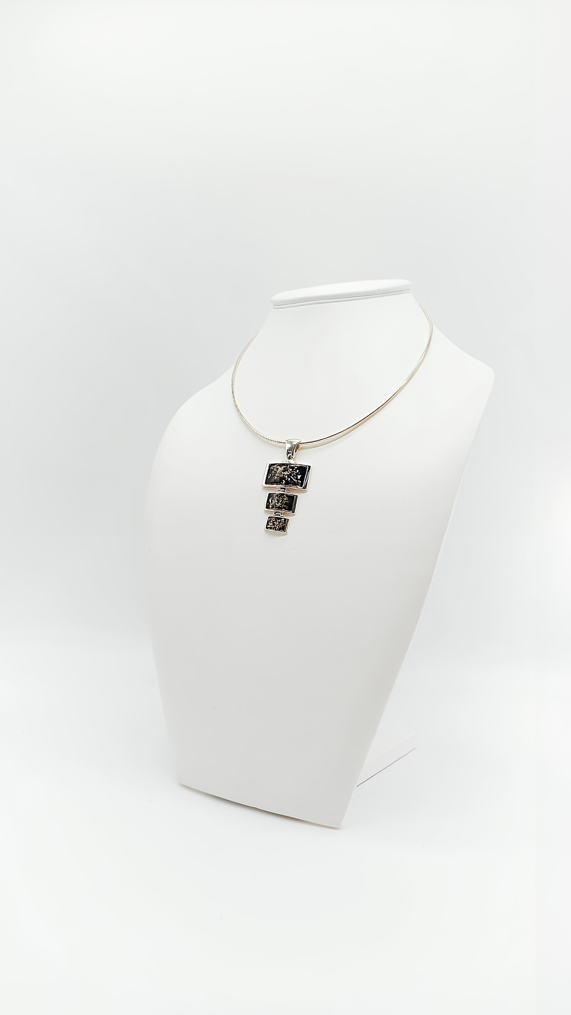 This extraordinary pendant, crafted from 925 sterling silver, captivates with its three-tiered structure, embedded with lustrous amber. Each stone tells its own story and captures the light in a unique way. The rectangular shapes lend the piece a modern elegance, while the amber adds a warm, natural depth. A sophisticated accessory for those who want to make a statement without sacrificing understated elegance.