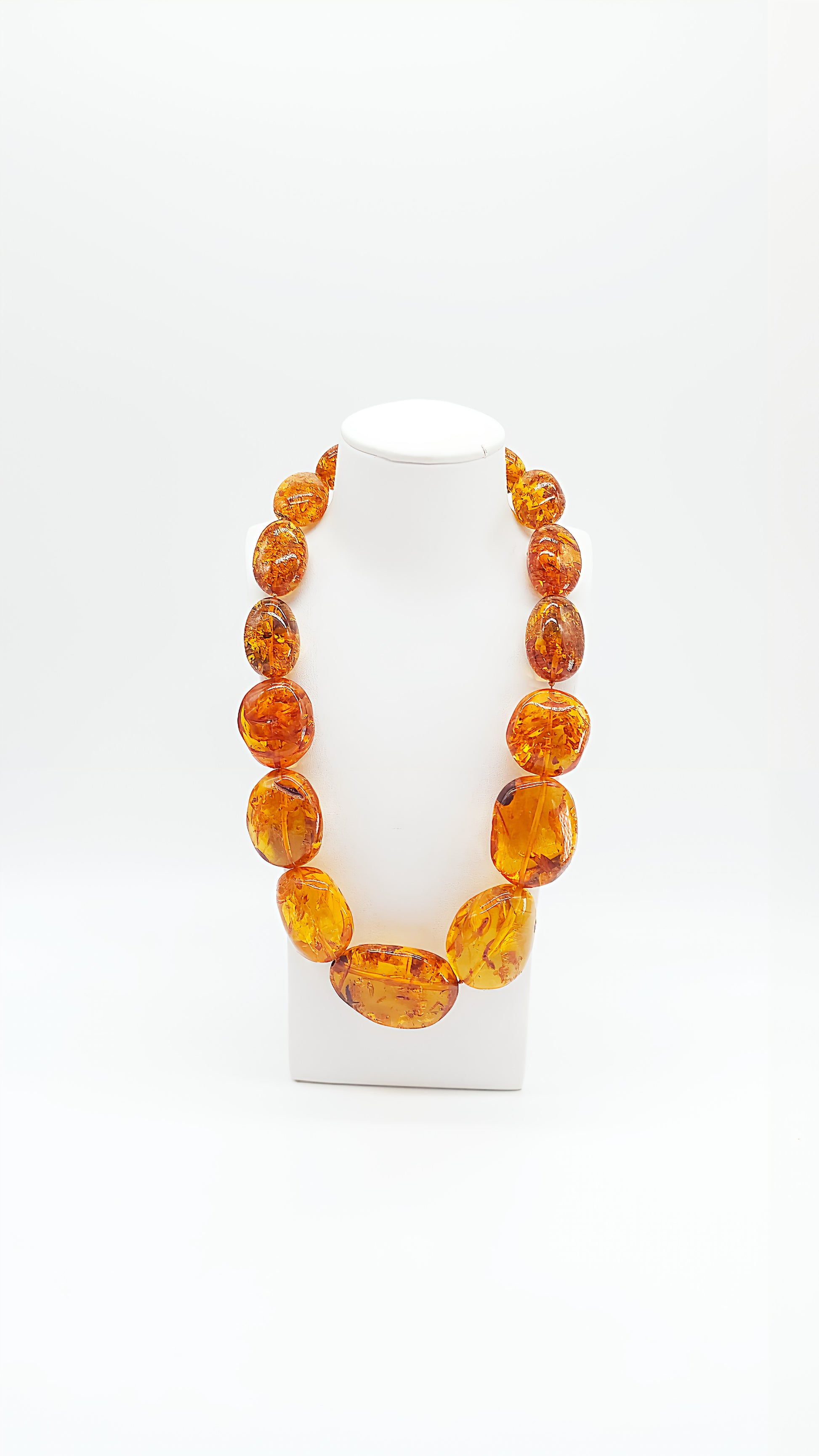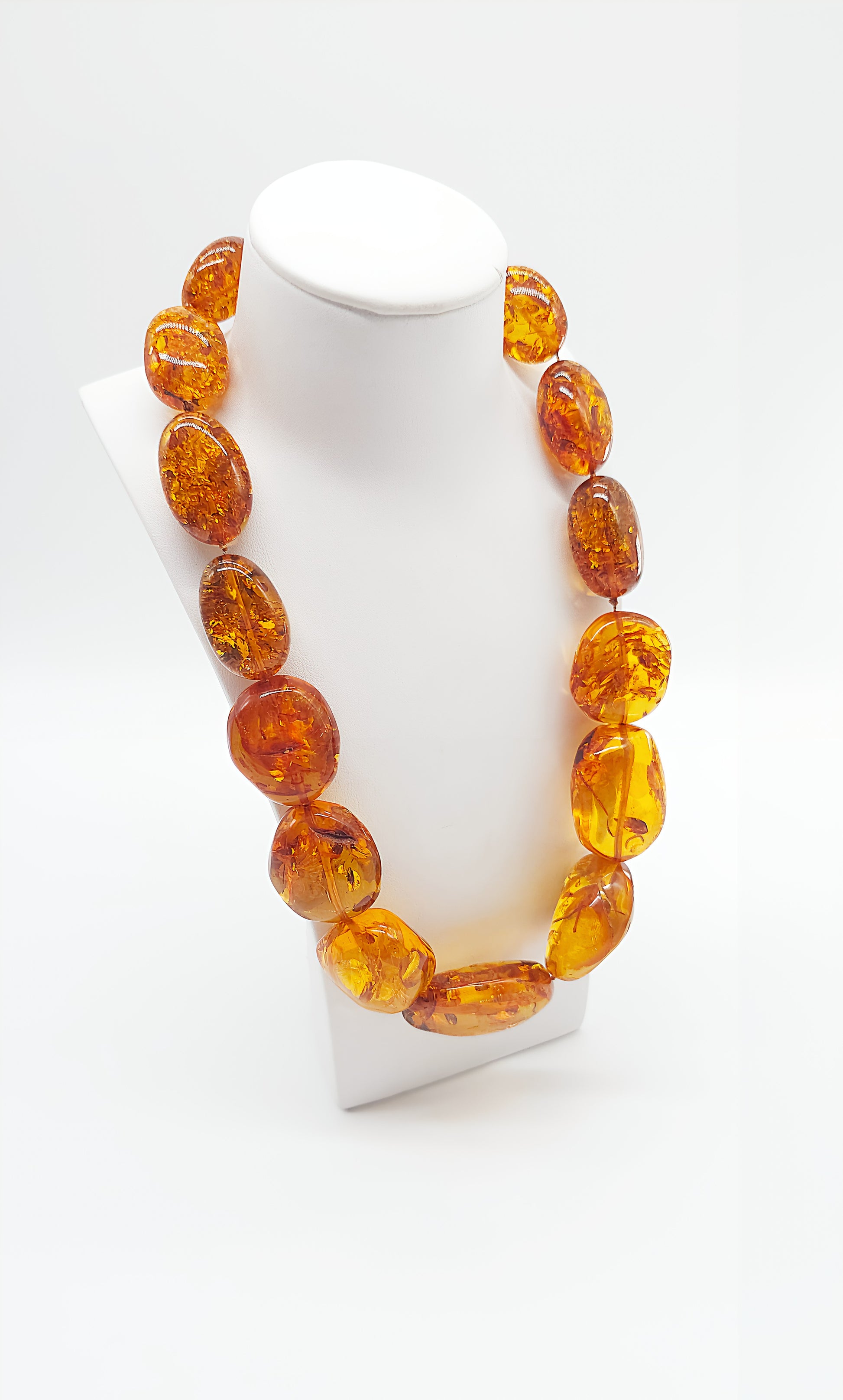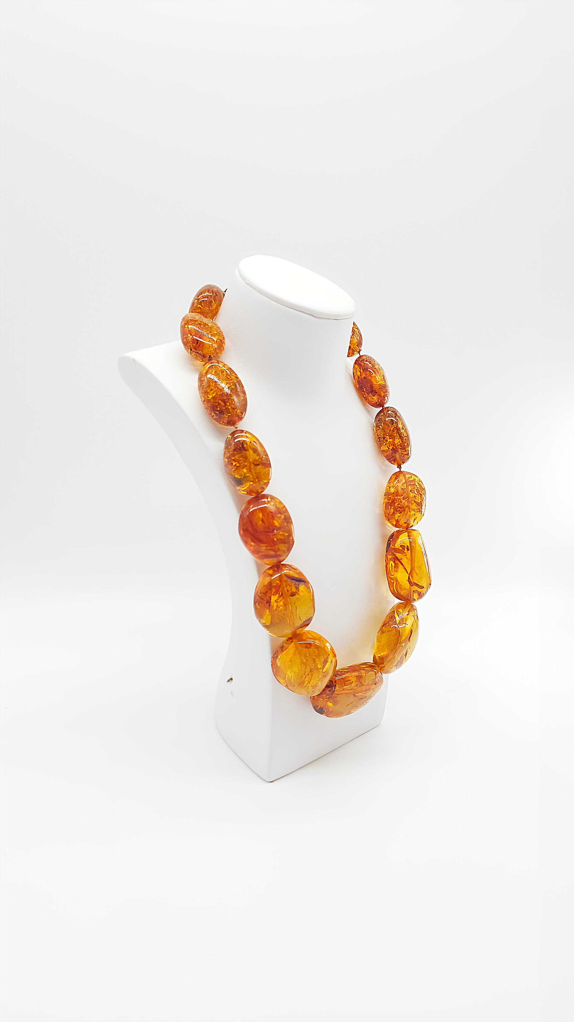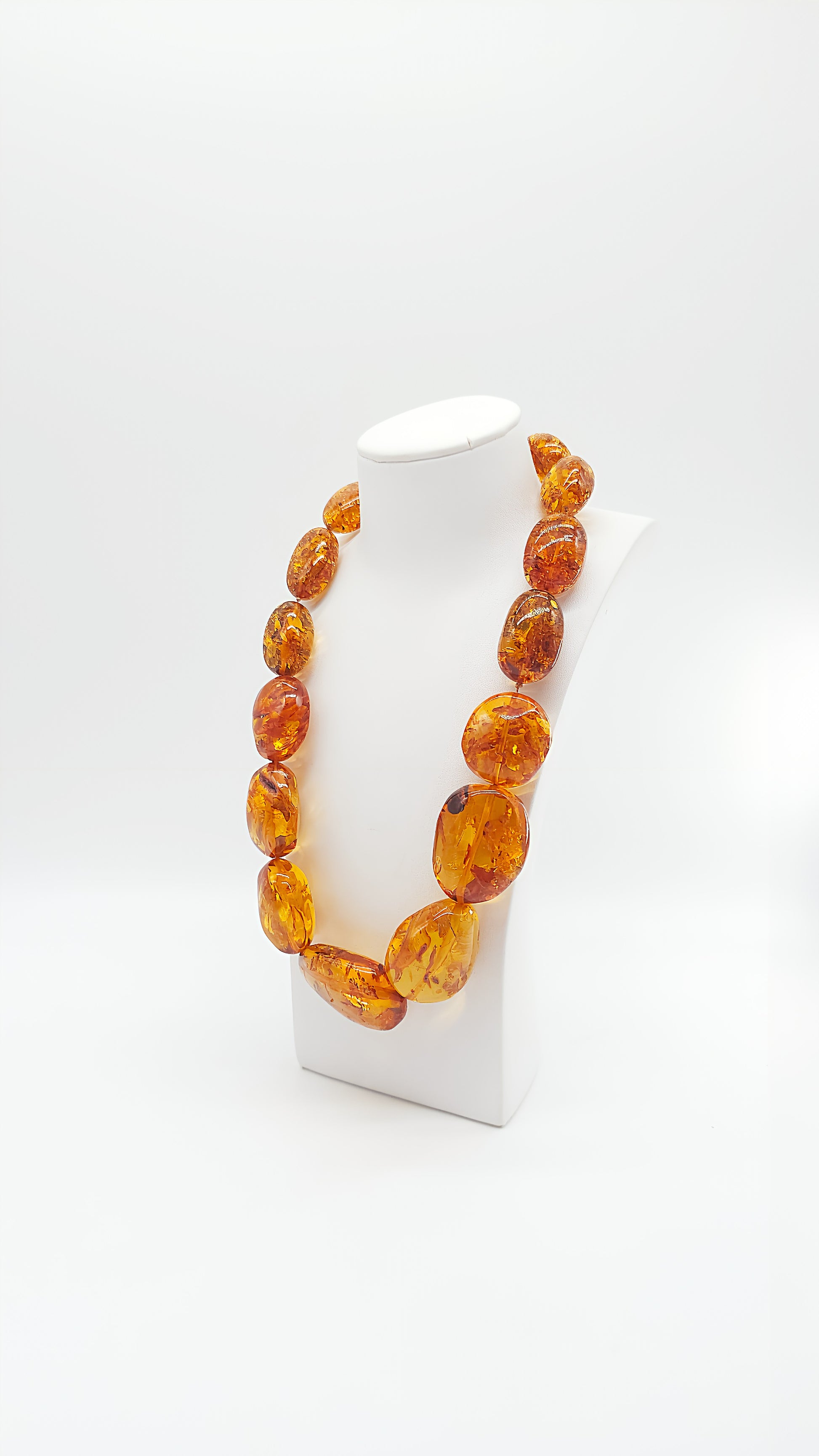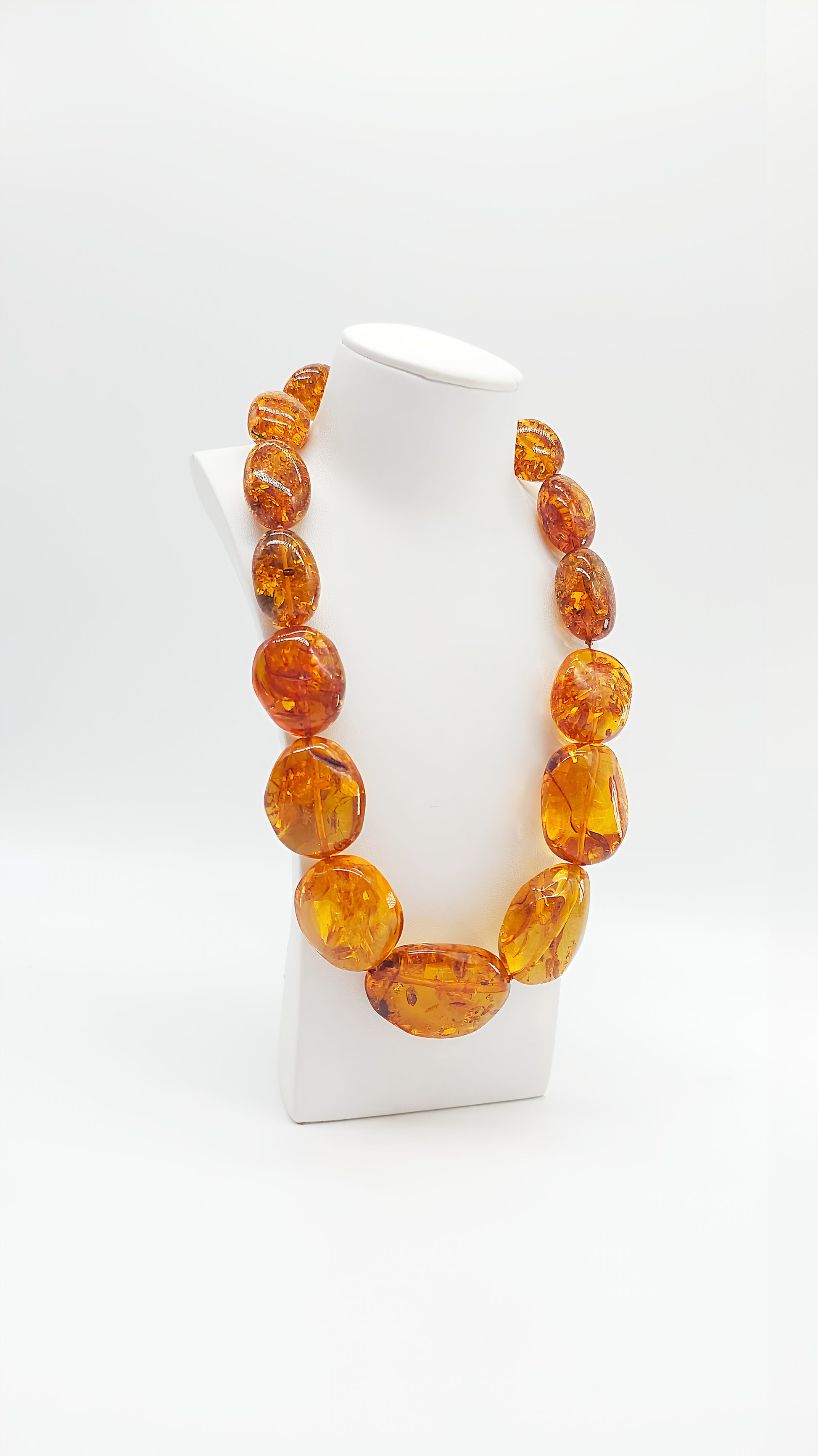 This magnificent amber necklace is a true masterpiece of nature and design. Handcrafted from large, oval amber stones, the necklace captivates with its warm, golden color and the mesmerizing texture of each individual stone. Each amber stone tells its own story and was carefully selected to create this unique necklace. A true statement piece for anyone seeking a special piece of jewelry that exudes both elegance and individuality. Perfect for special occasions or to add a touch of luxury to your everyday look.