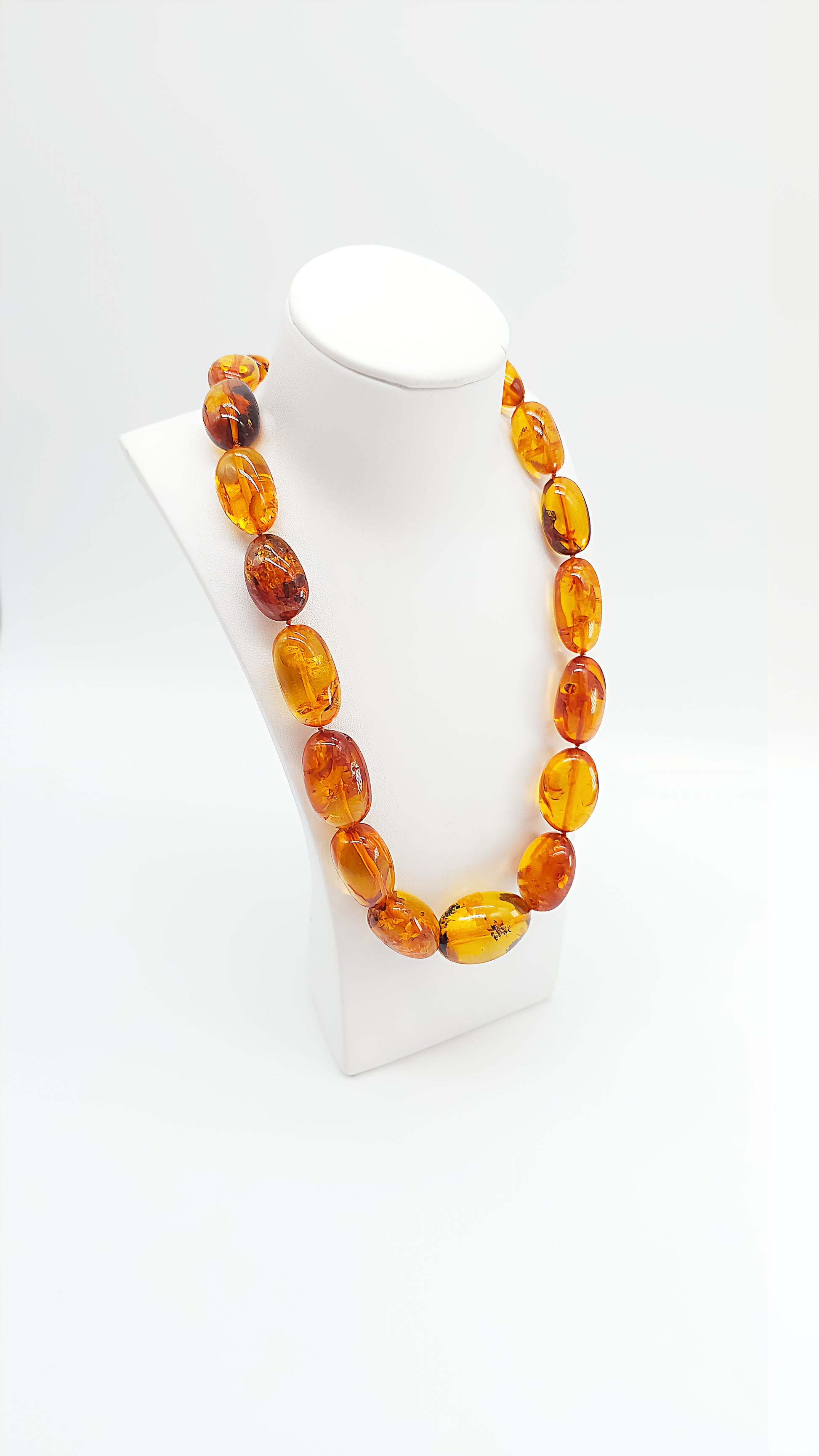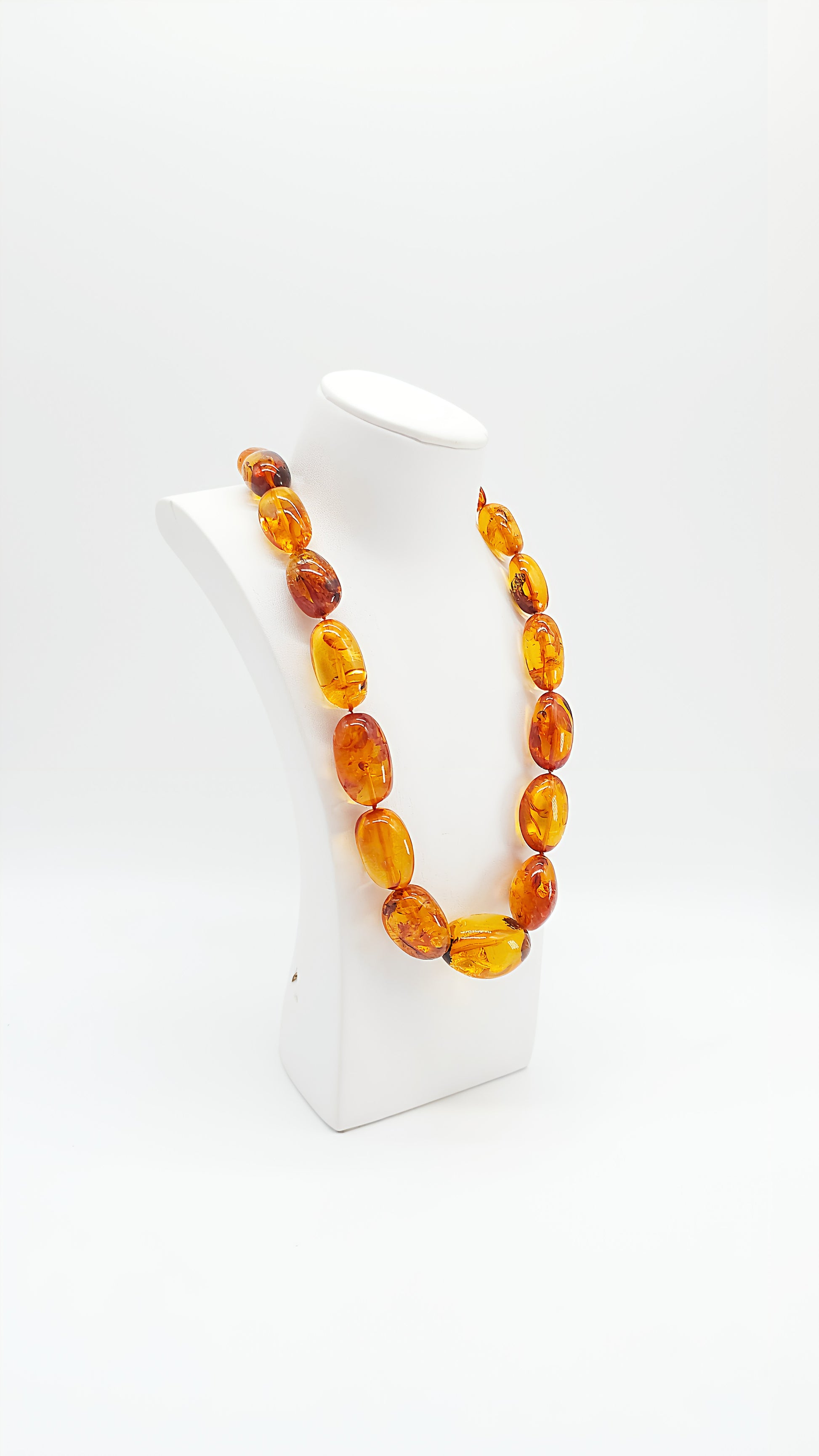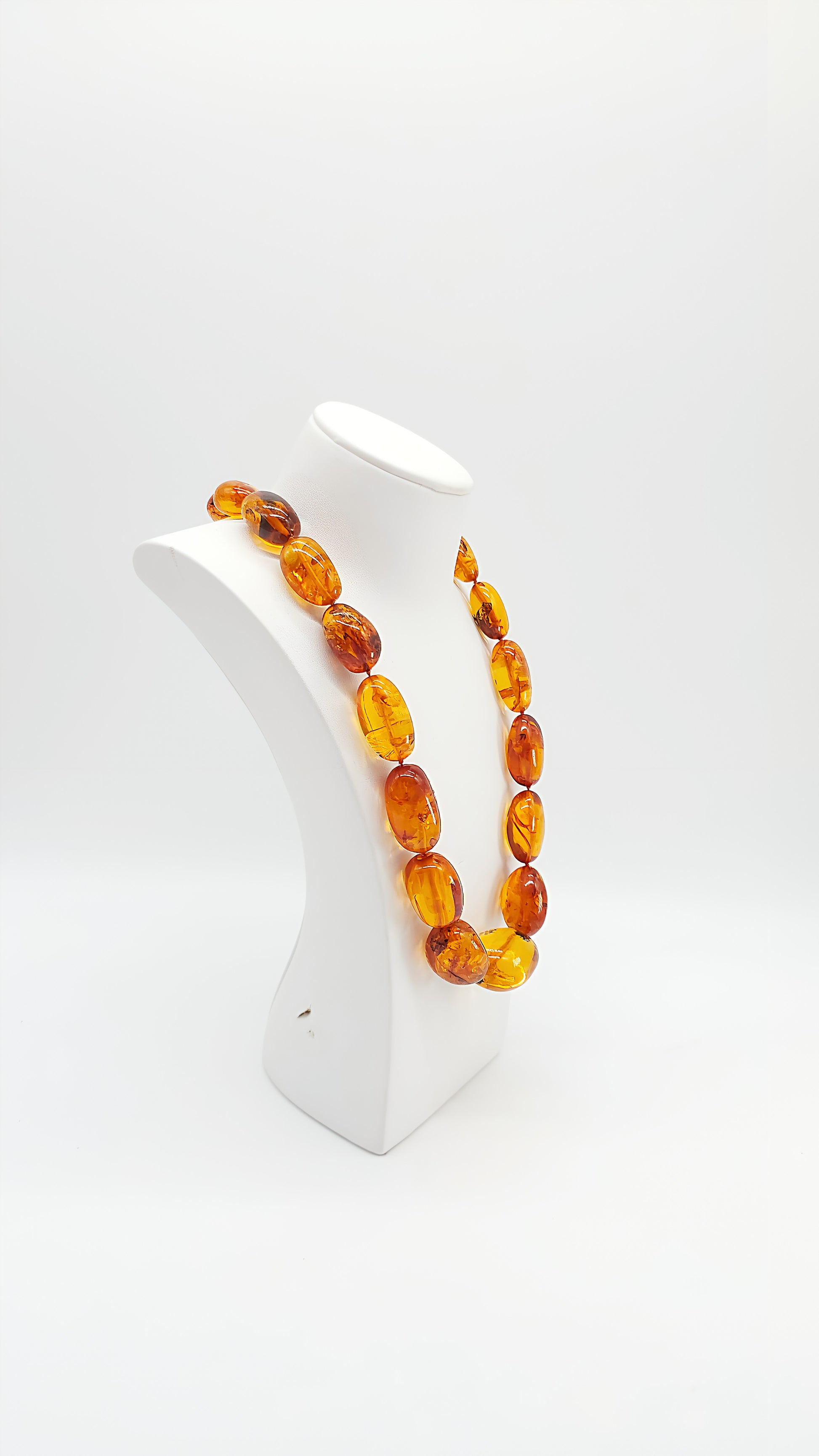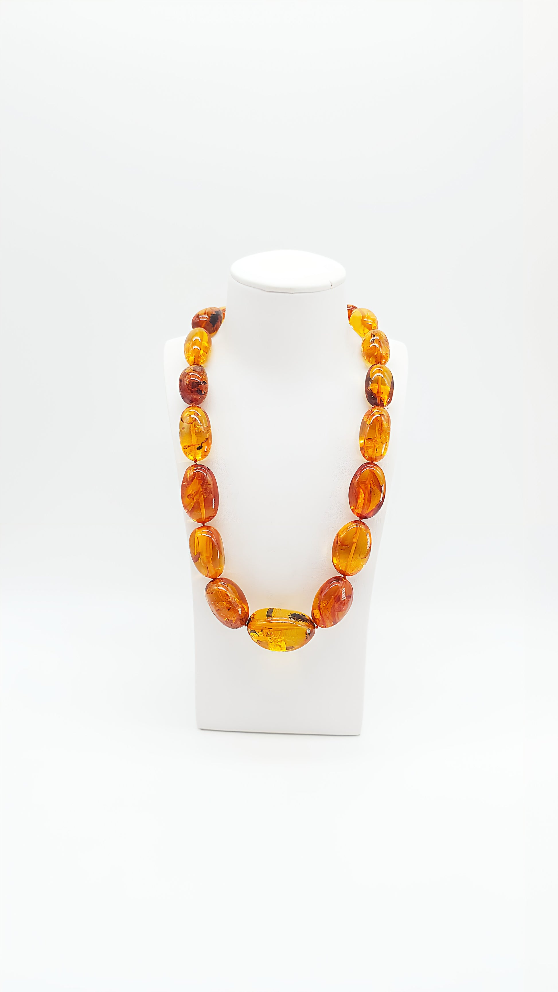 This unique amber necklace is a true masterpiece. The large, oval amber stones glow in warm, golden tones and capture the light in an incomparable way. Each stone has been carefully selected and crafted by hand, perfectly showcasing the amber's natural beauty. This unique piece is more than just a piece of jewelry—it's a statement piece that combines elegance and nature in a unique design. Perfect for special occasions or to add a touch of luxury to your everyday look.
