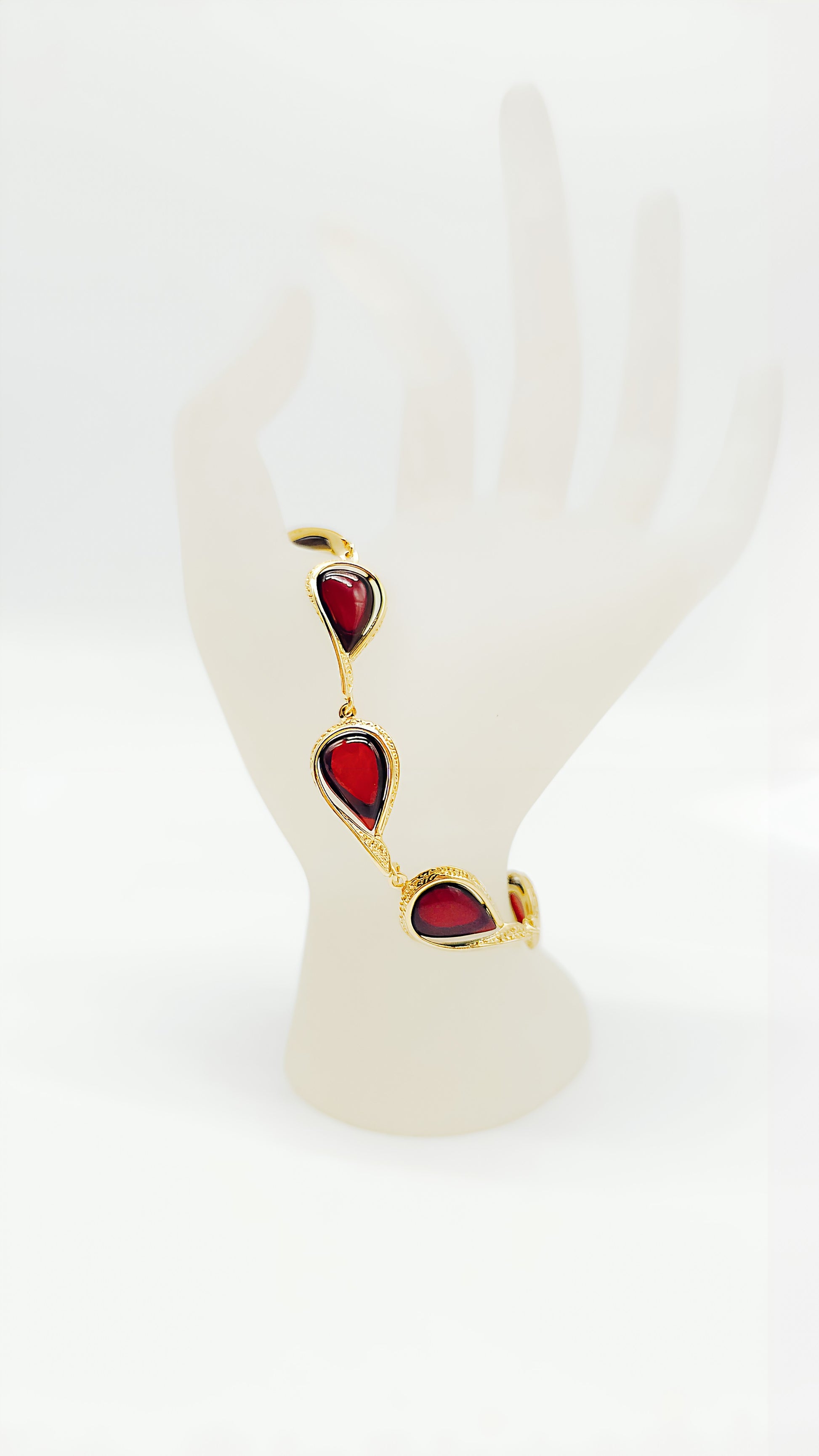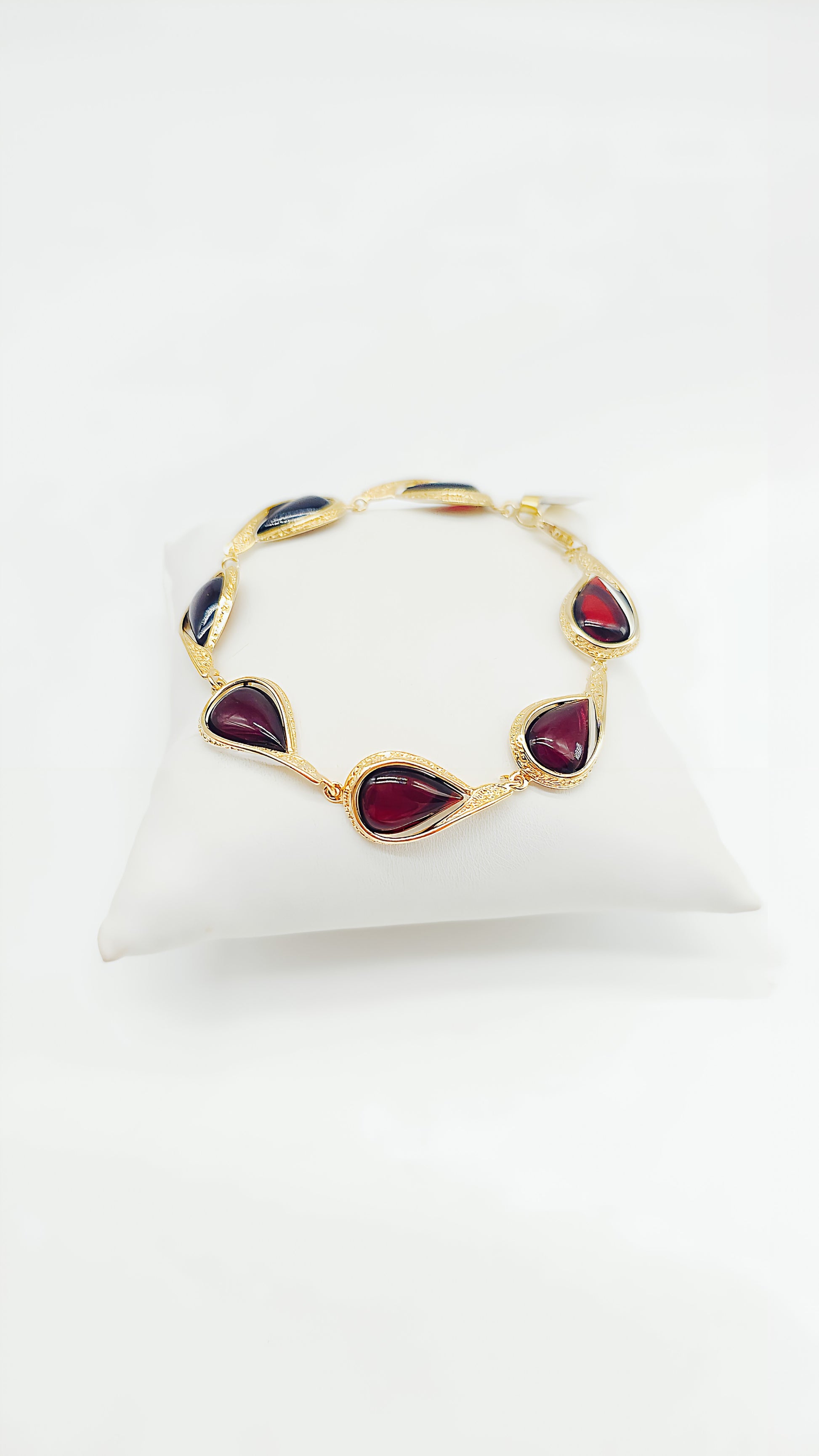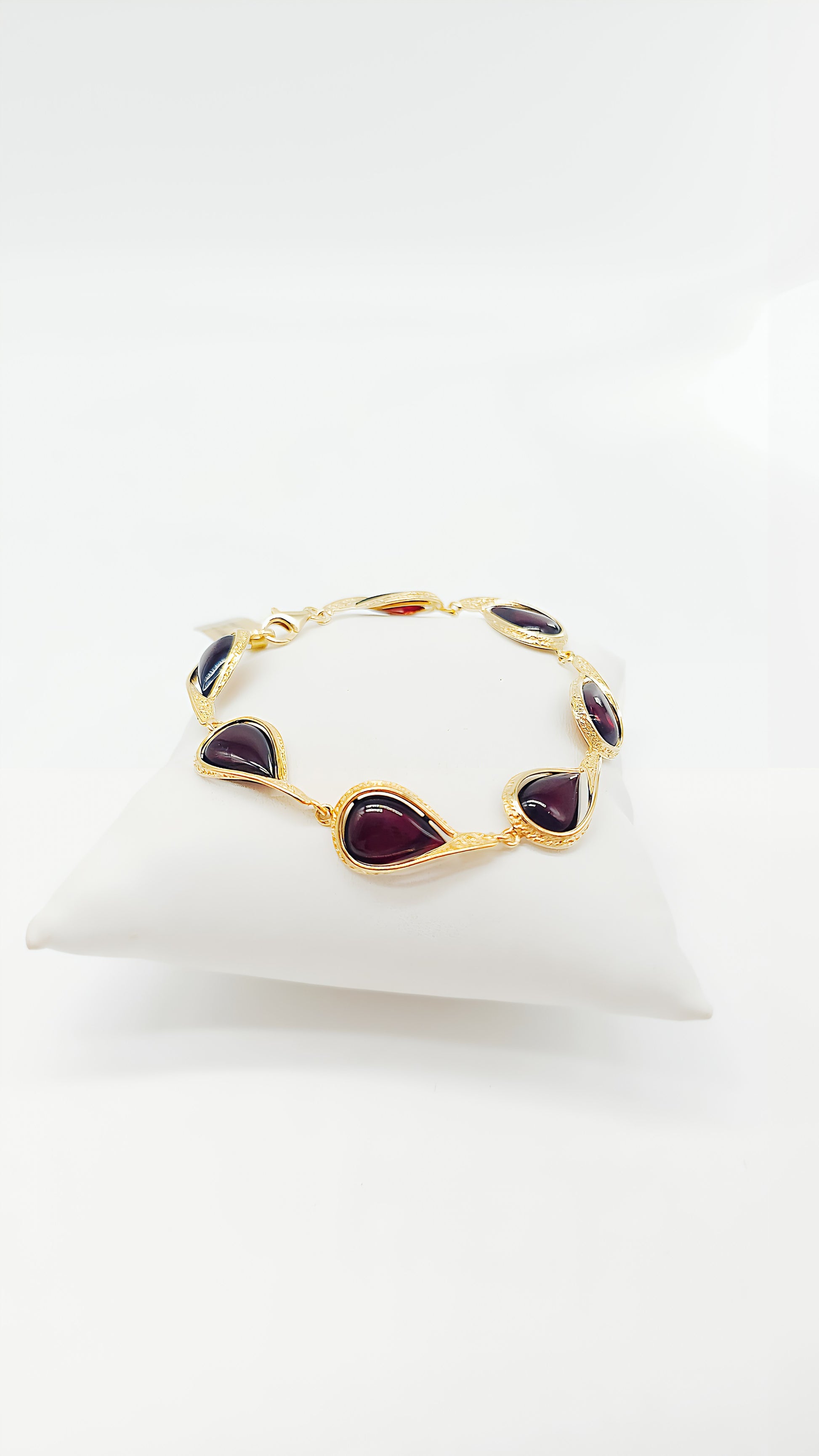This exquisite amber bracelet, crafted from gold-plated 925 sterling silver, combines the natural beauty of amber with a luxurious golden sheen. The warm, red amber stones are artfully set into the gold-plated silver, creating a harmonious and elegant design. Each element of this bracelet is unique and adds a touch of luxury and individuality to your look. Perfect for special occasions or to add an elegant touch to your everyday outfit. This handcrafted piece of jewelry is a true masterpiece that embodies the timeless beauty of amber and gold.