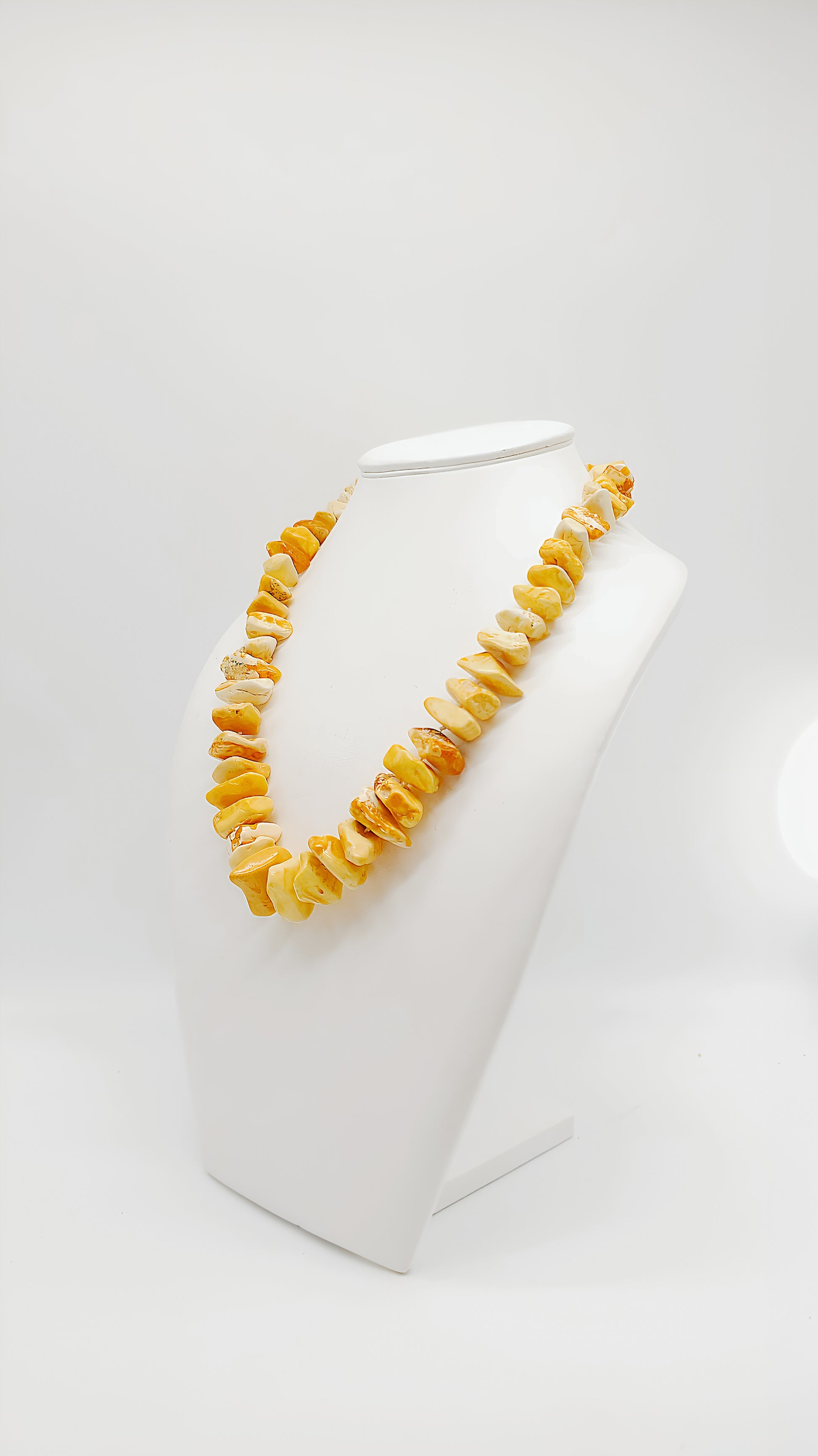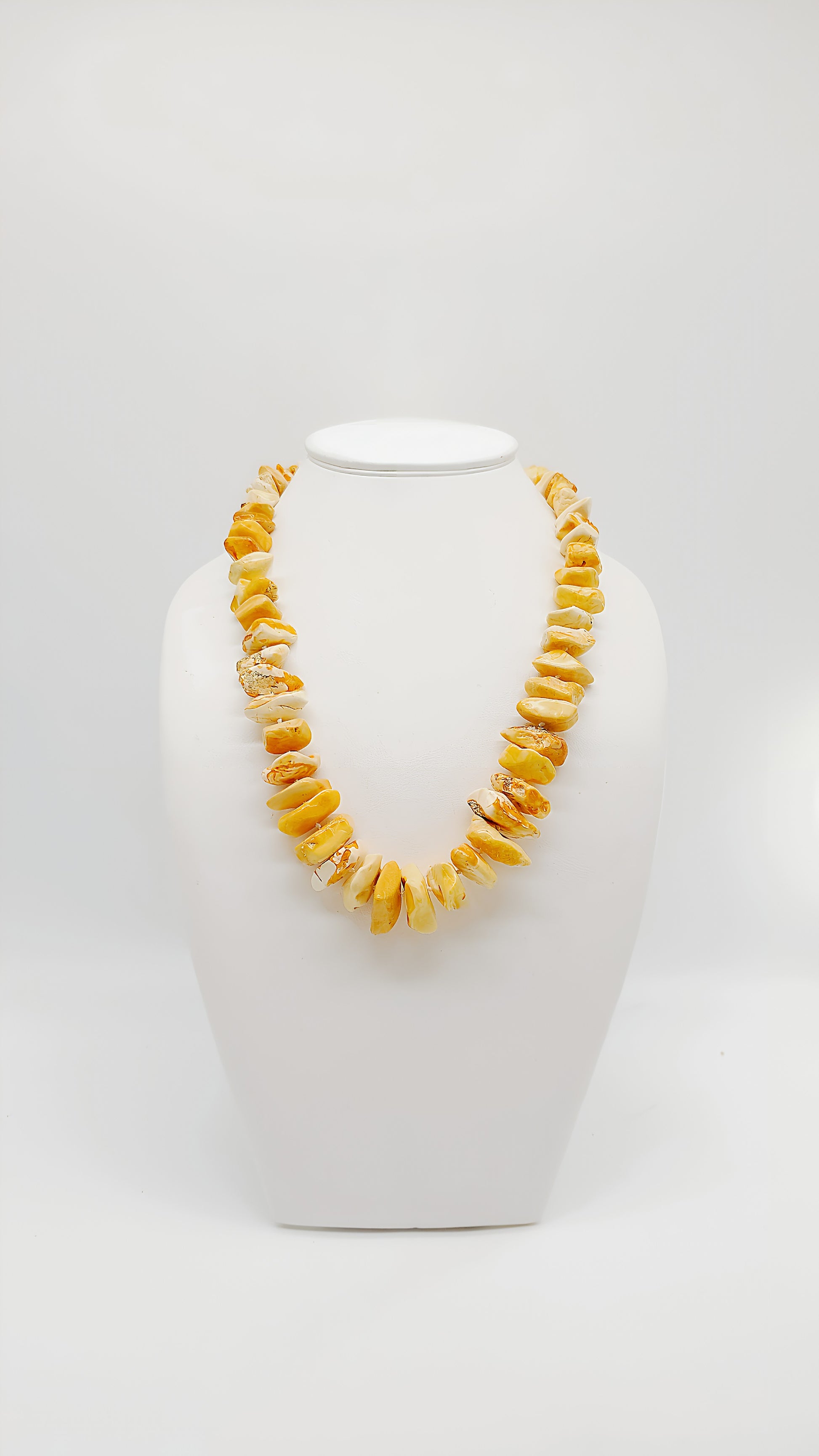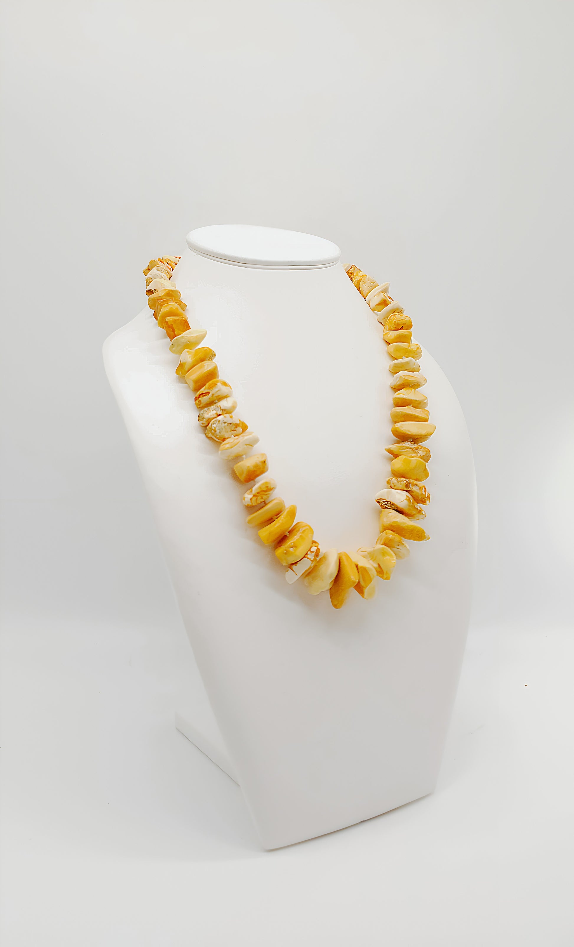 This extraordinary amber necklace is a luminous highlight. The light, almost cream-colored amber beads, shimmering in various natural shapes and shades, make this necklace a unique piece of jewelry. Perfect for those who like to add special accents and appreciate the beauty of nature in its purest form. Each bead is unique and hand-picked to create a harmonious yet irregular design that is both modern and timeless.