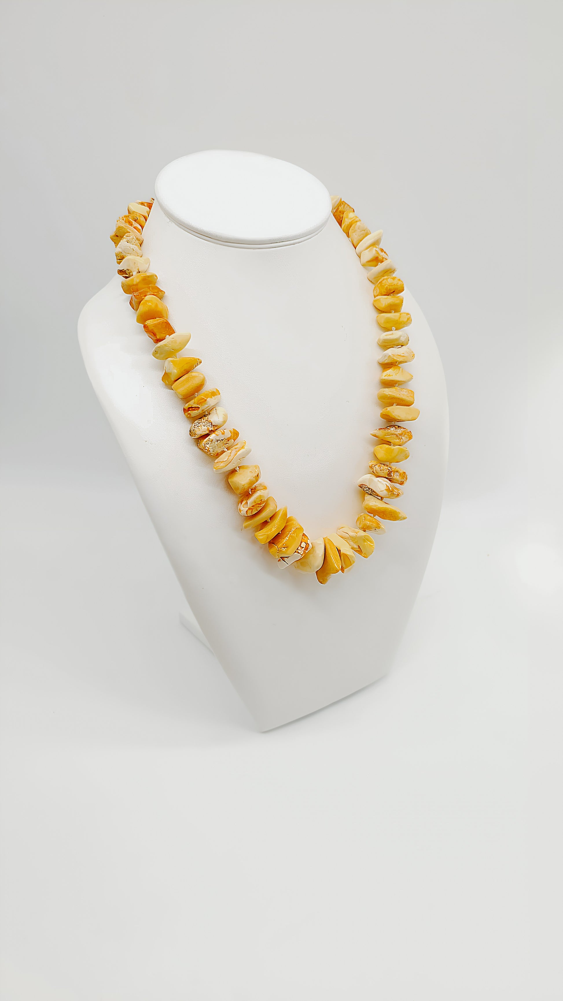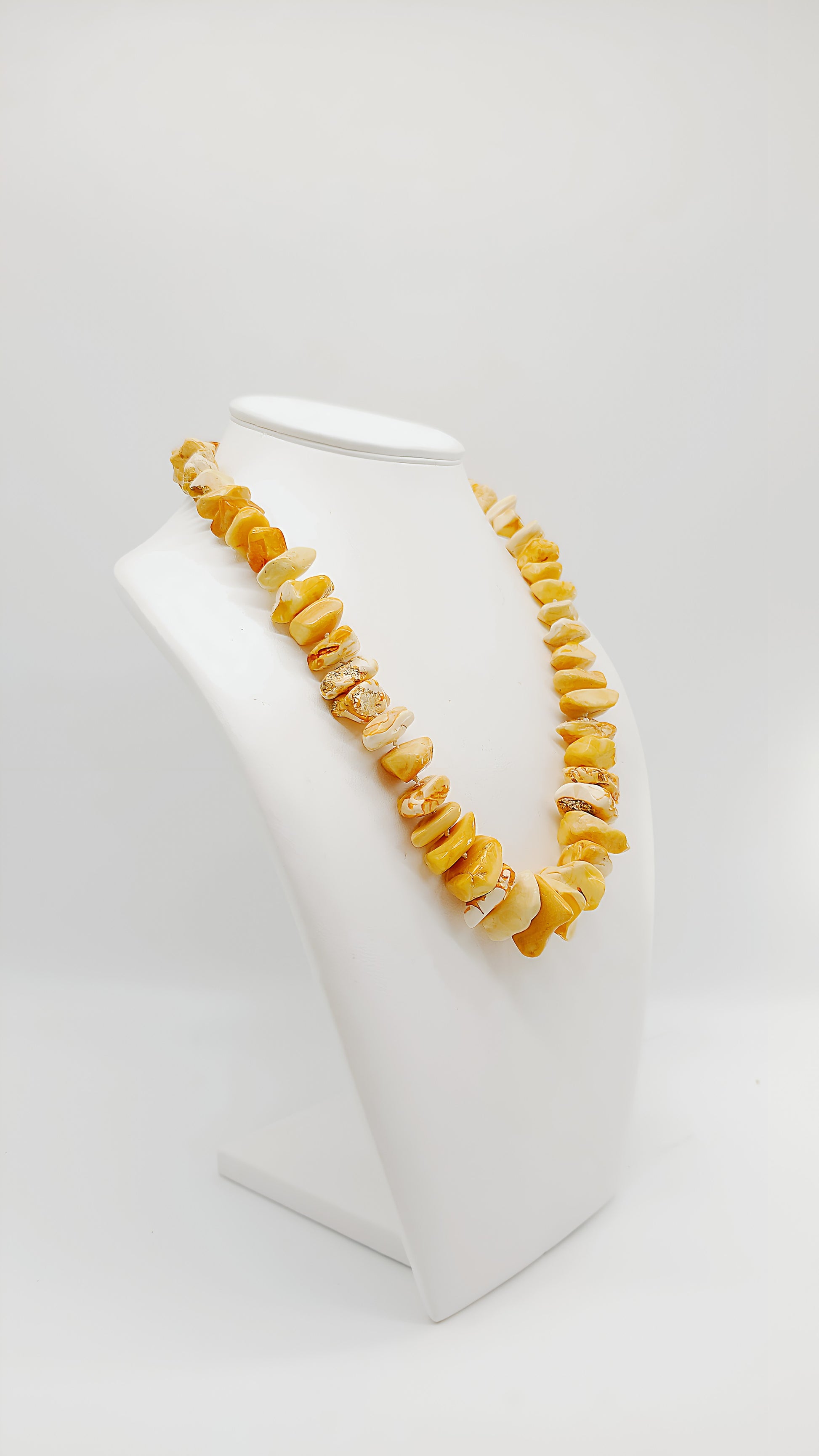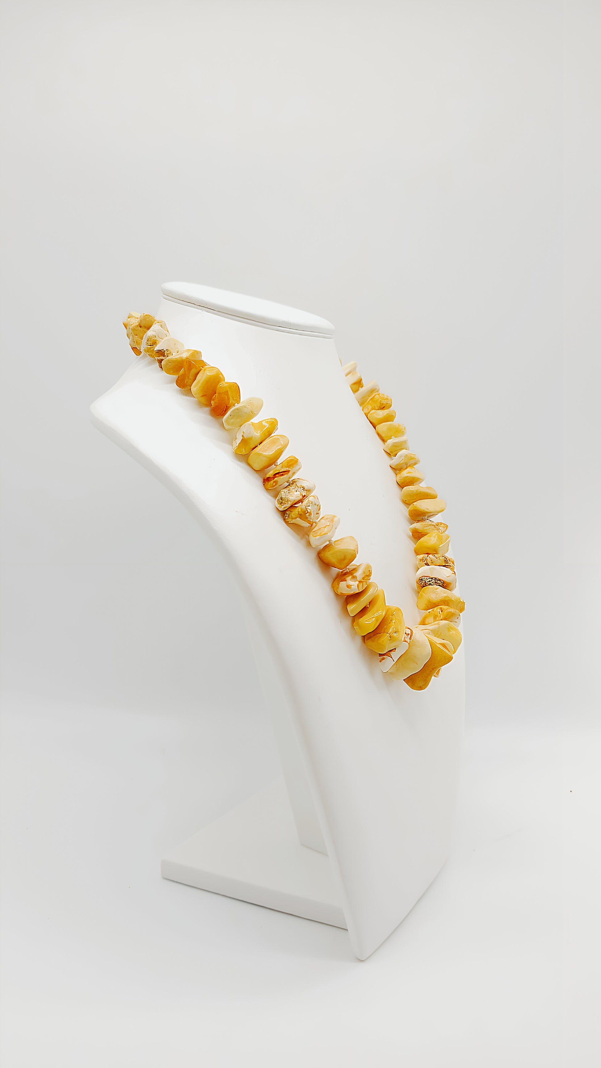 This extraordinary amber necklace is a luminous highlight. The light, almost cream-colored amber beads, shimmering in various natural shapes and shades, make this necklace a unique piece of jewelry. Perfect for those who like to add special accents and appreciate the beauty of nature in its purest form. Each bead is unique and hand-picked to create a harmonious yet irregular design that is both modern and timeless.